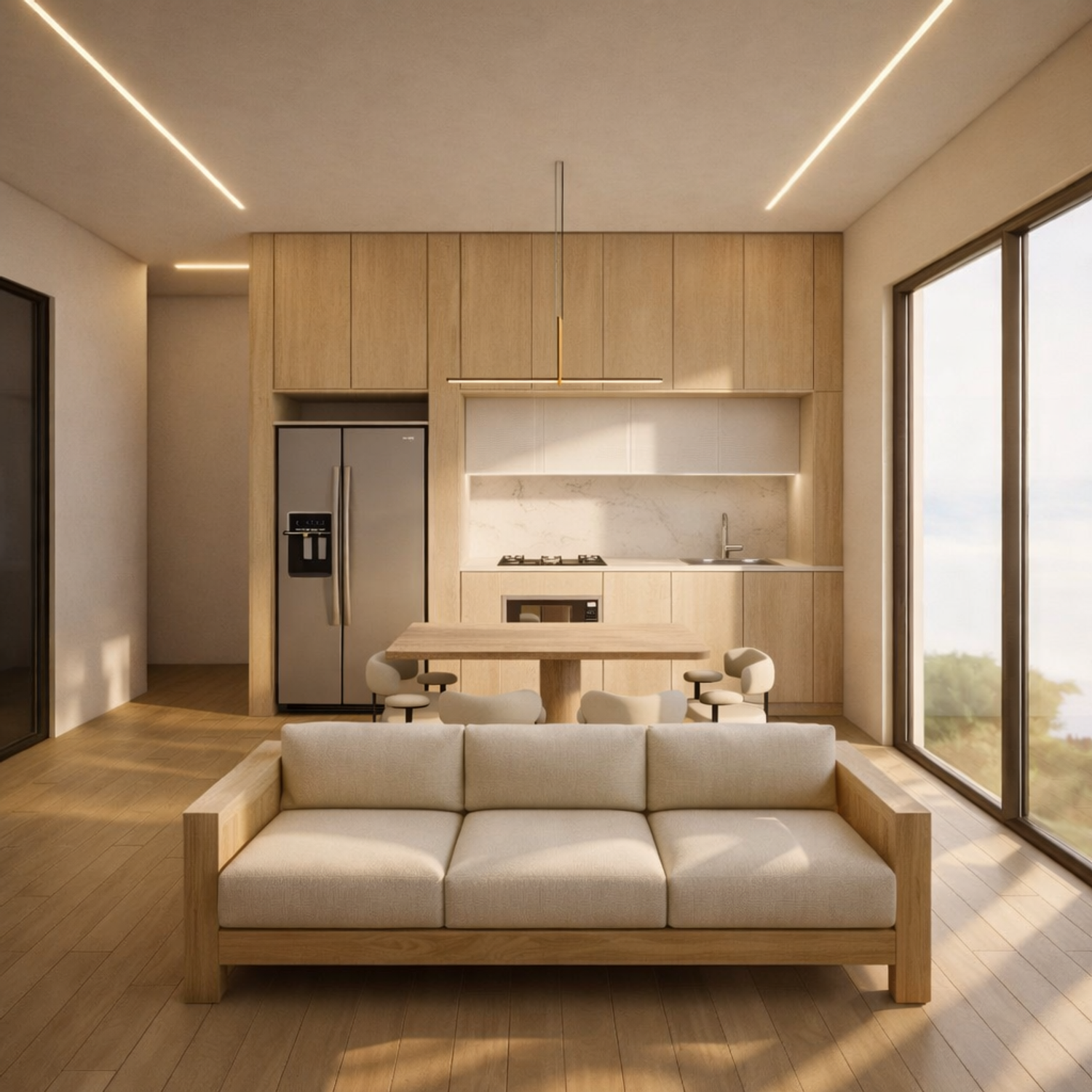 Il soggiorno e la cucina sono progettati come un ambiente open space, così da amplificare la percezione dello spazio e sfruttare al massimo la superficie disponibile. La cucina, con disposizione lineare e compatta, assicura praticità e ordine visivo.