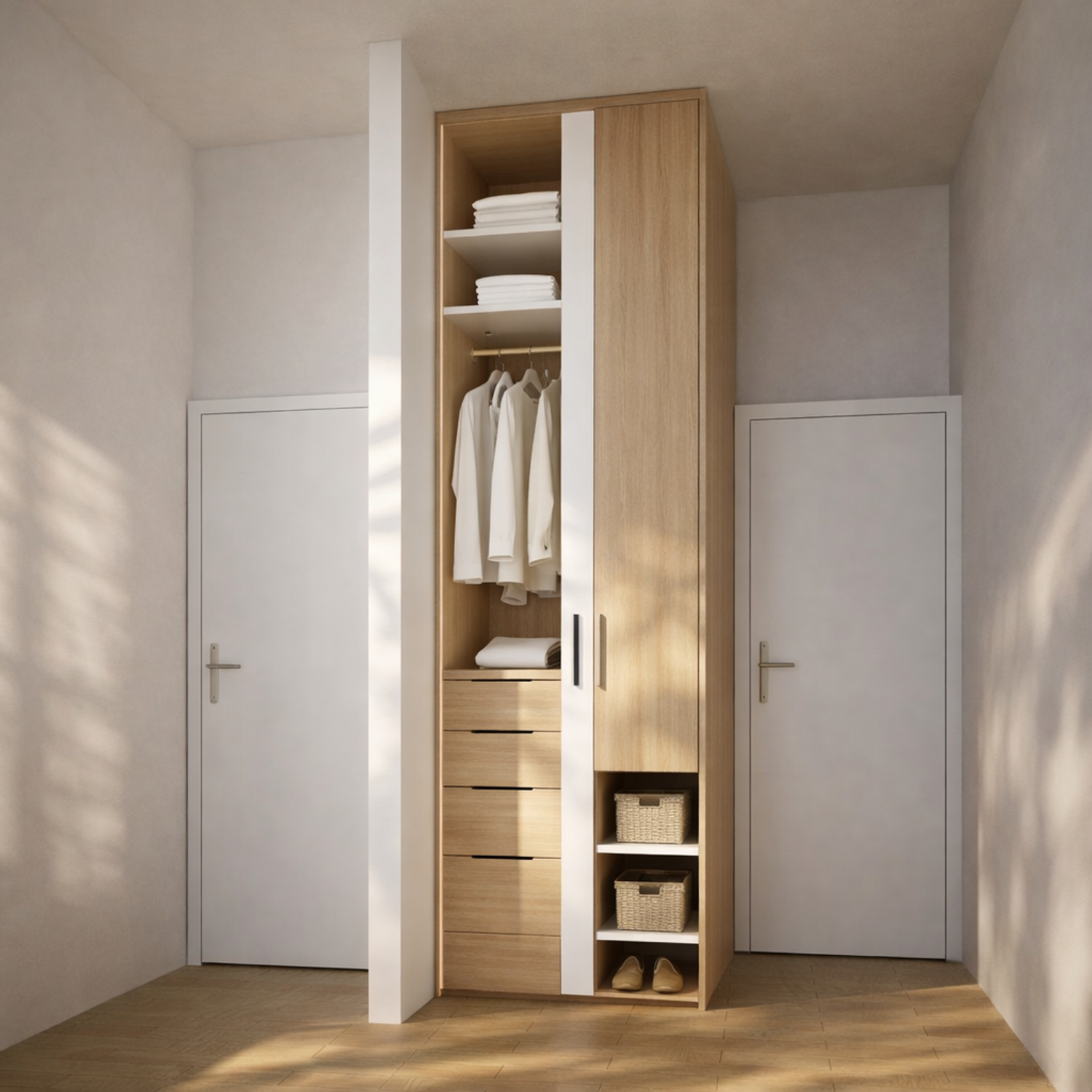 All’ingresso, l’armadio d’ingresso funge da filtro visivo e funzionale, migliorando l’organizzazione e la privacy dell’abitazione.
