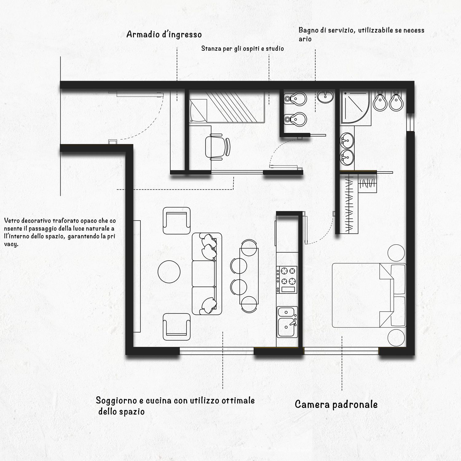 Nel complesso, il progetto risponde ai principi di funzionalità, luminosità, privacy e suggestione contemporanea, offrendo una soluzione abitativa equilibrata e moderna.