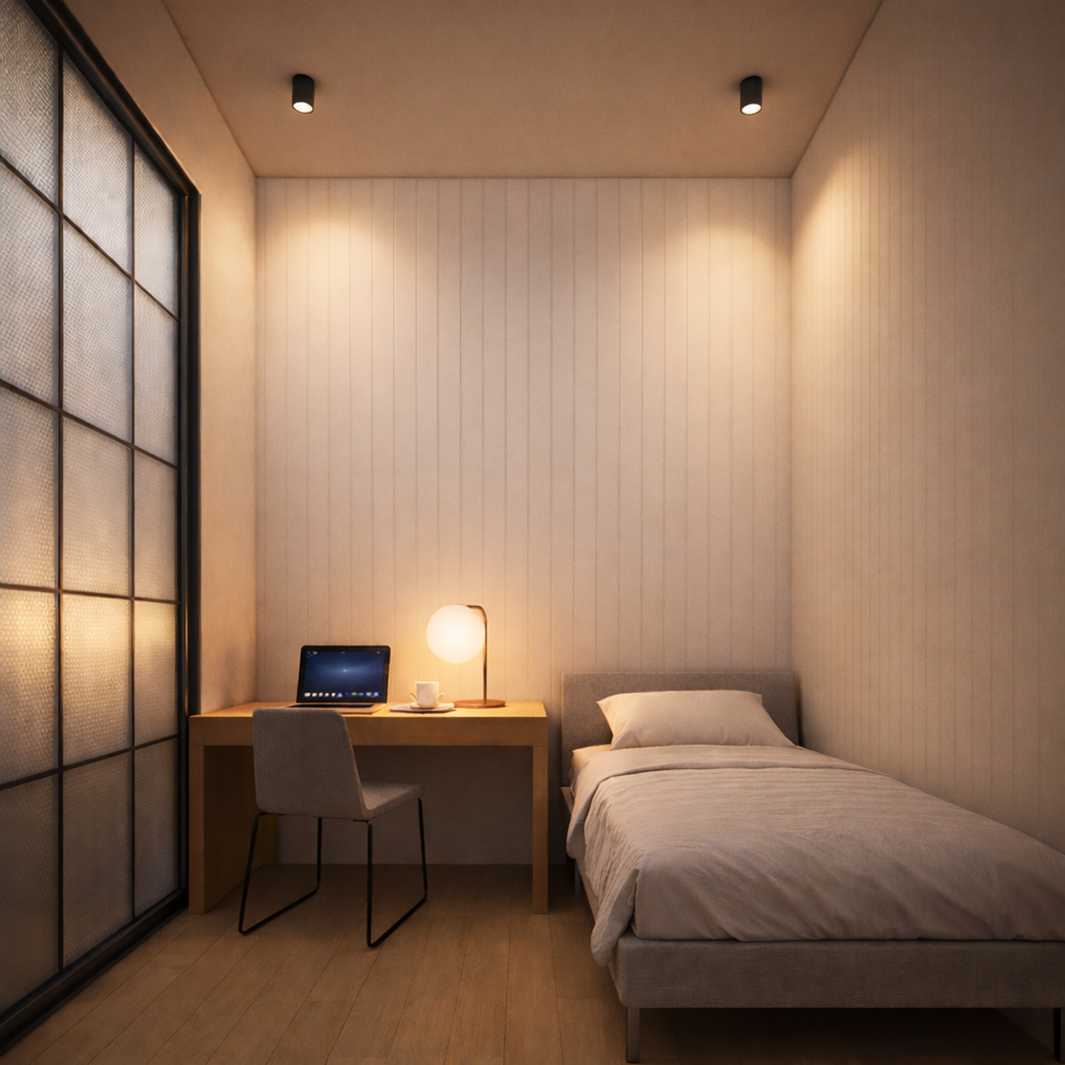 La stanza per gli ospiti e studio è pensata come uno spazio flessibile, adattabile alle diverse esigenze del committente.