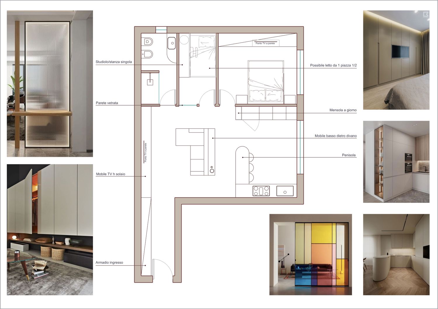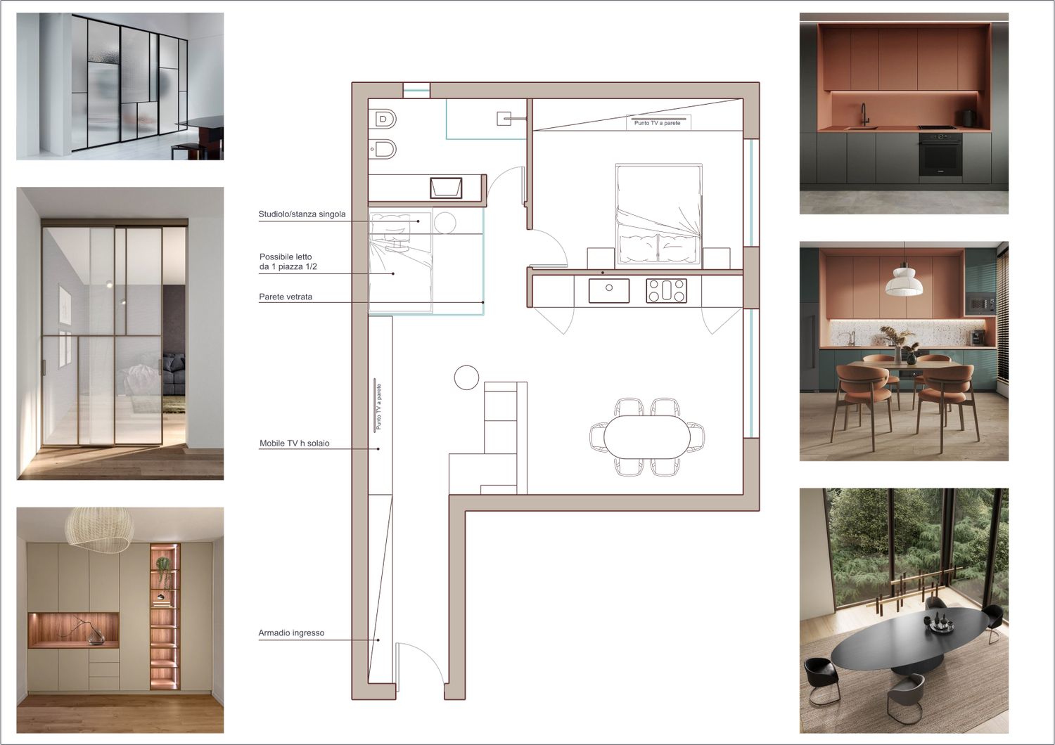 Mantenendo il bagno nella posizione da lei indicata, la Soluzione 1 prevede un ingresso attrezzato con armadiatura contenitiva e parete TV a tutta altezza. La zona giorno accoglie una cucina in linea, mentre la zona notte comprende una camera matrimoniale e un bagno completo.