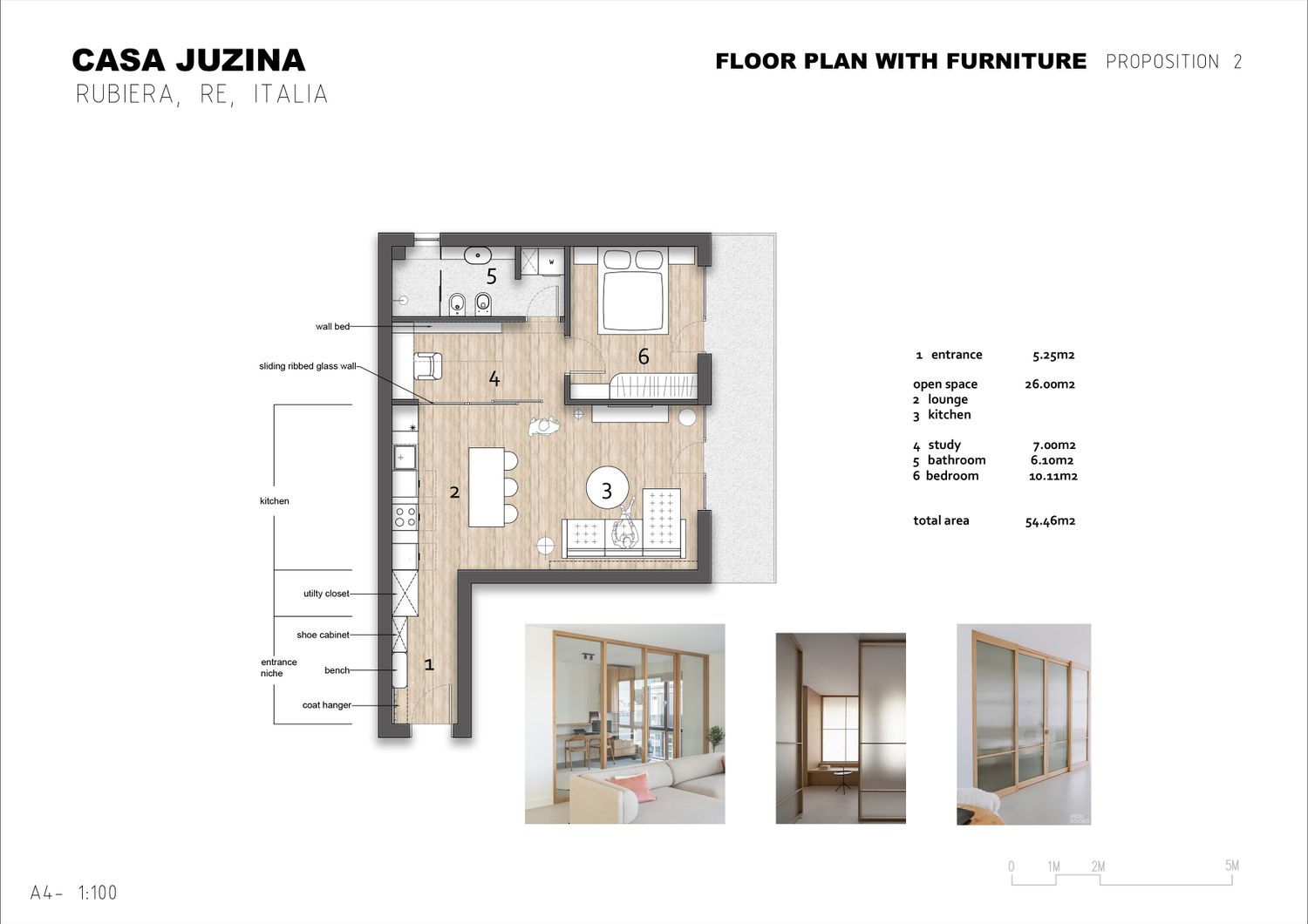 Space is divided into entrance area, open space (day zone) with kitchen and lounge and more private area (night zone) with home office – study, bathroom and bedroom.