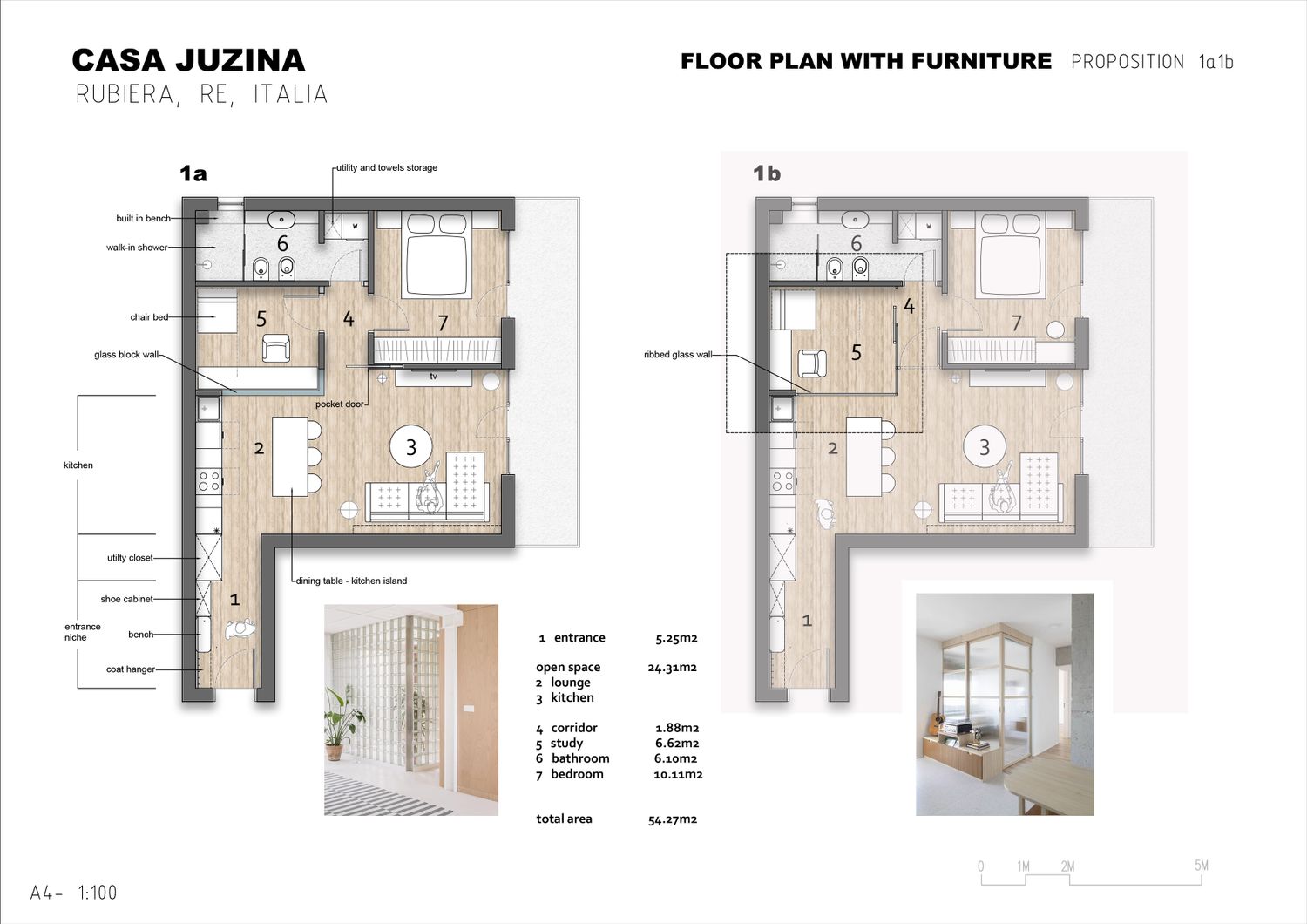 ***Very important for the success of this design is a custom made and designed furniture: entryway niche, utility cabinet, kitchen, kitchen island, study furniture, closet in the bedroom, washing machine niche in the bathroom.