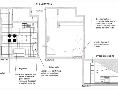 uno stile pulito, lineare, tipo Ikea, comodo. nell'appartamento c'è metano , ma manca elemento, prevedere o stufa pellet, oppure altro. vorrei ci fosse: frigo normale con congelatore, non mini, cucina a gas normale, tavolo allungabile x 4 persone, dispensa x alimentari e pentolame. mobile contenitore scope, aspirapolvere ecc.+ spazio divano e tv. No lavastoviglie, no lavatrice. un bancone da lavoro sarebbe un sogno.