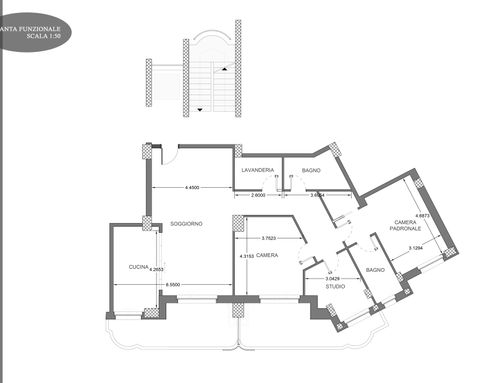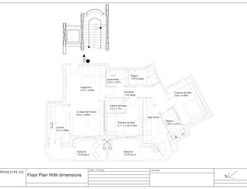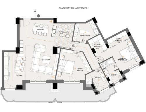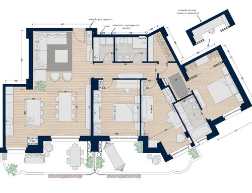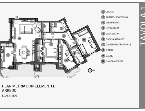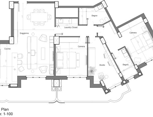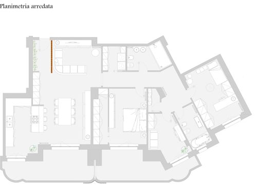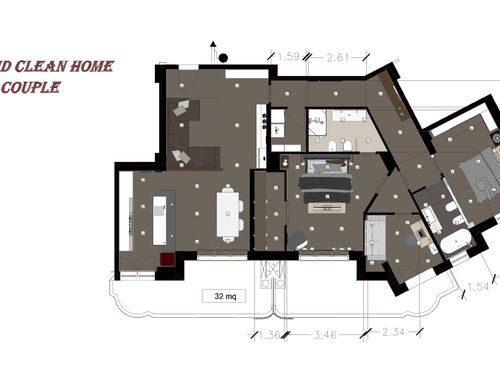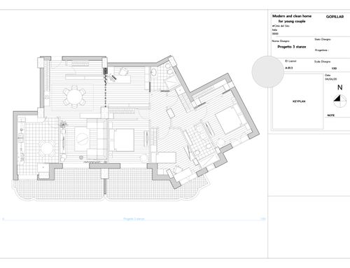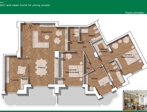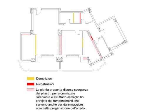 Vanno redistribuiti gli spazi e va fatta una nuova divisione, con uno stile semplice, quasi minimal, che sia moderno ma non futuristico. La casa deve essere funzionale e pulita, con due bagni ed un lavatoio dove inserire la lavatrice, un bel soggiorno dove poter vedere la TV ed ospitare gli amici a tavola, che sia vicino la cucina, che deve avere possibilmente una porta scorrevole con effetto vetro. Le altre stanze devono essere due stanze da letto (di cui una più grande, con letto matrimoniale e cabina armadio) ed uno studio che possa eventualmente trasformarsi in stanza da letto se si allargherà la famiglia. cucina e bagni devono rimanere dove sono attualmente