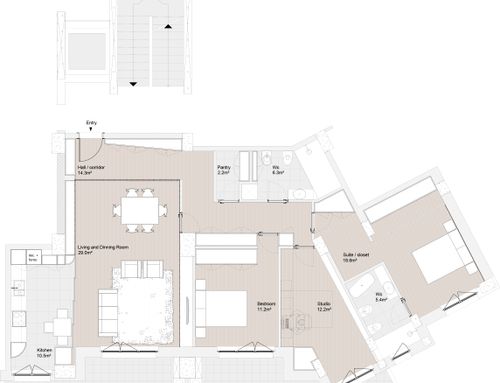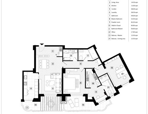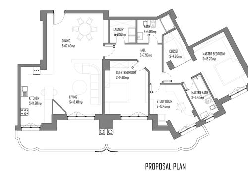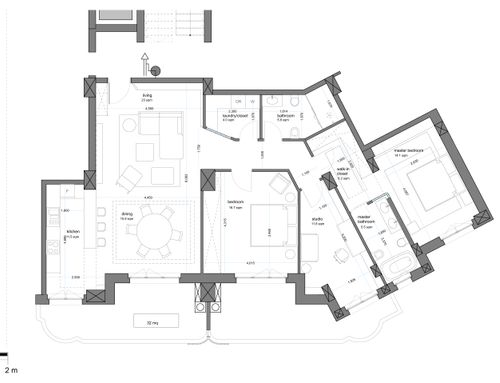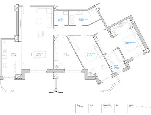simple, almost minimal style, which is modern but not futuristic. The house must be functional and clean, with two bathrooms and a sink where you can put the washing machine, a nice living room where you can watch TV and host friends at the table, which is near the kitchen. The other rooms must be two bedrooms (one of which is larger, with a double bed and walk-in closet) and a study that can eventually become a bedroom if the family expands the kitchen and bathrooms must remain were are actually