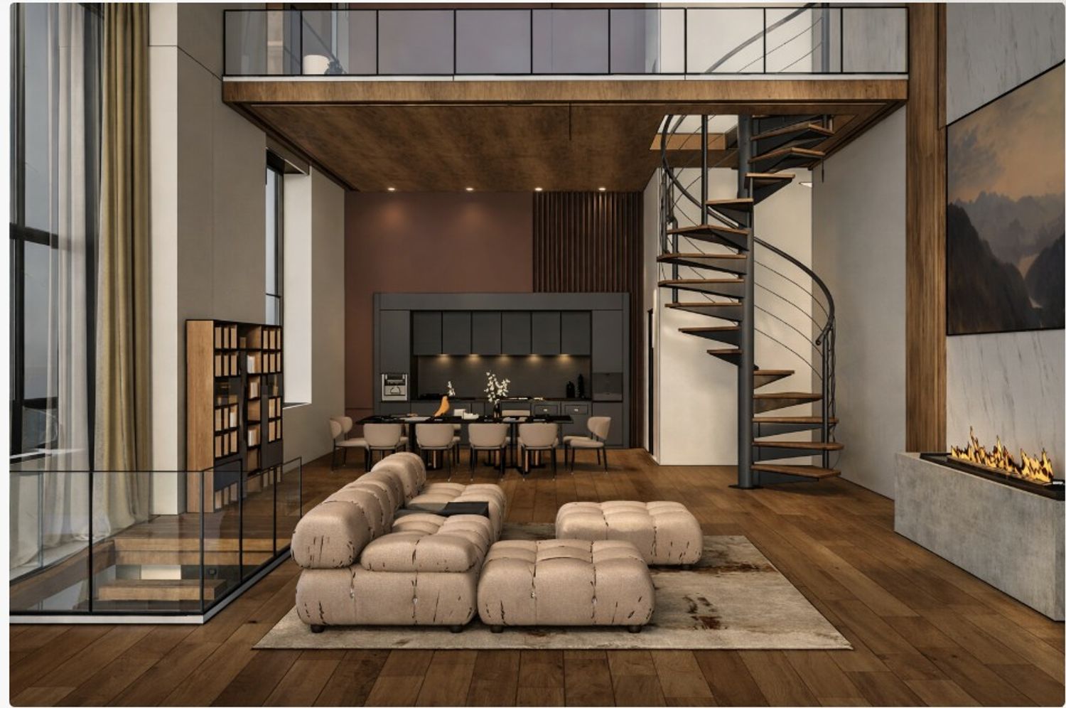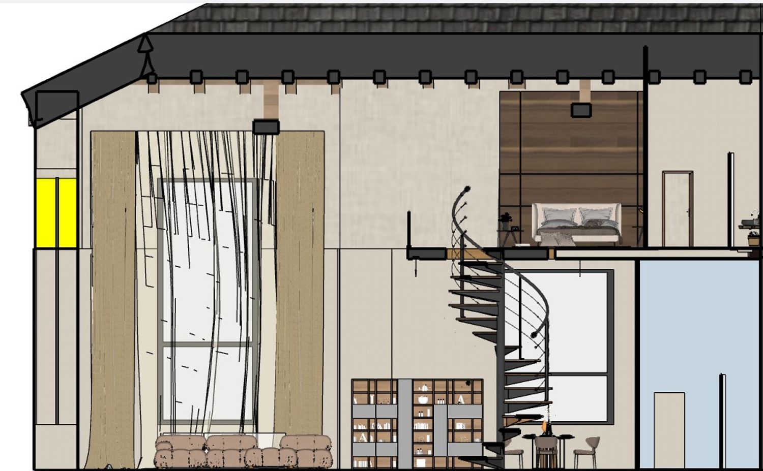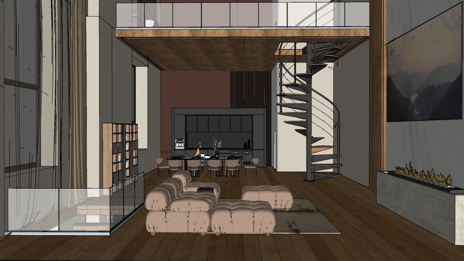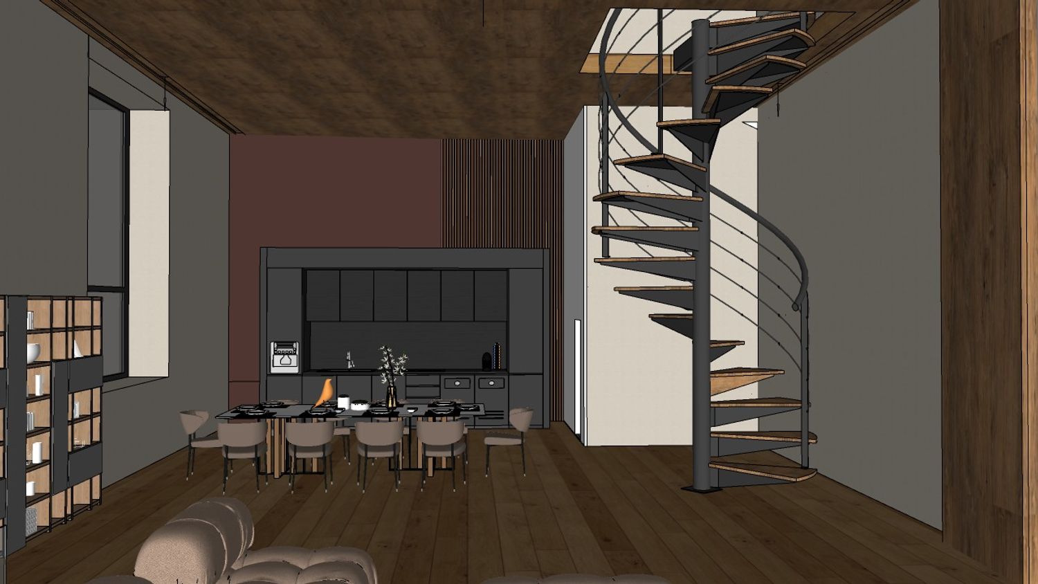 La scala elicoidale in metallo e legno diventa un elemento architettonico centrale, collegando visivamente il piano principale con il soppalco superiore.