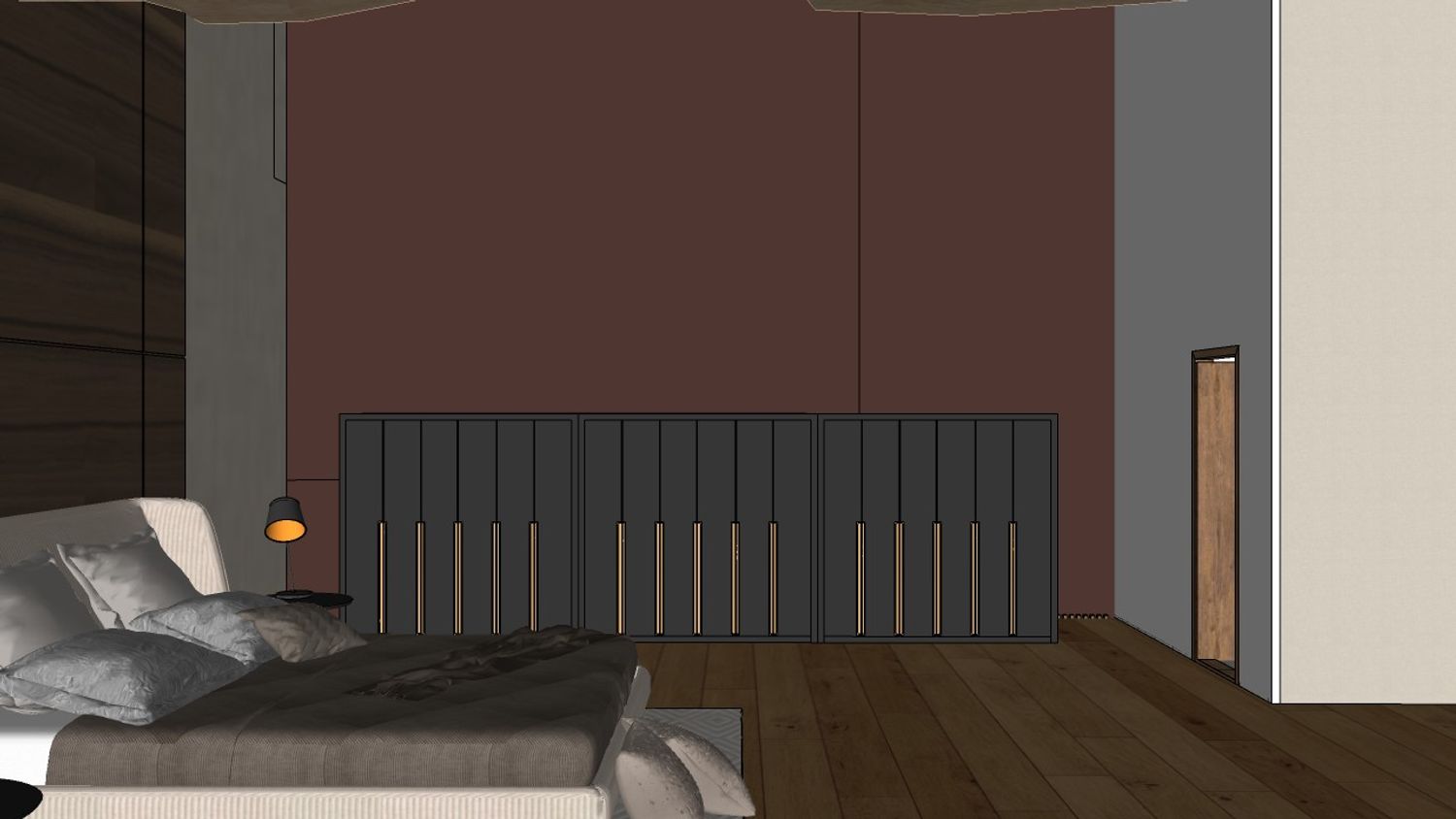 La camera è progettata come uno spazio intimo e rilassante, dove i materiali naturali e le tonalità calde contribuiscono a creare un ambiente confortevole.