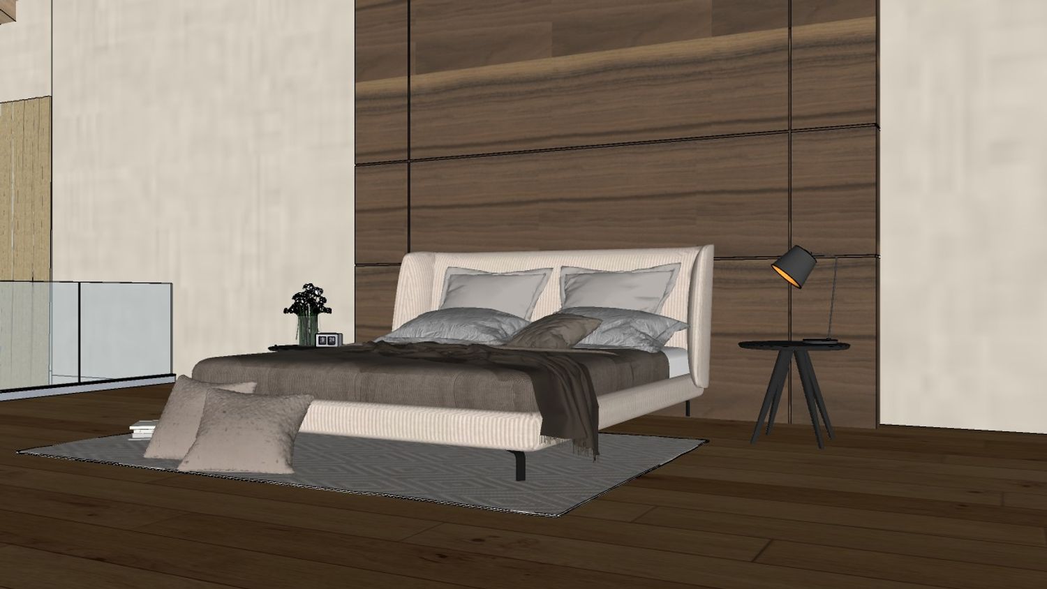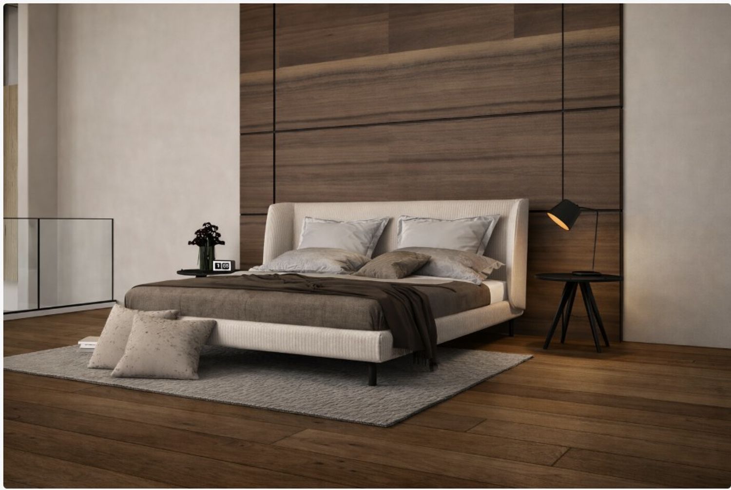 Il letto imbottito con testiera avvolgente diventa il fulcro della stanza, posizionato davanti ad una parete rivestita in pannelli di legno che aggiungono profondità e carattere allo spazio.