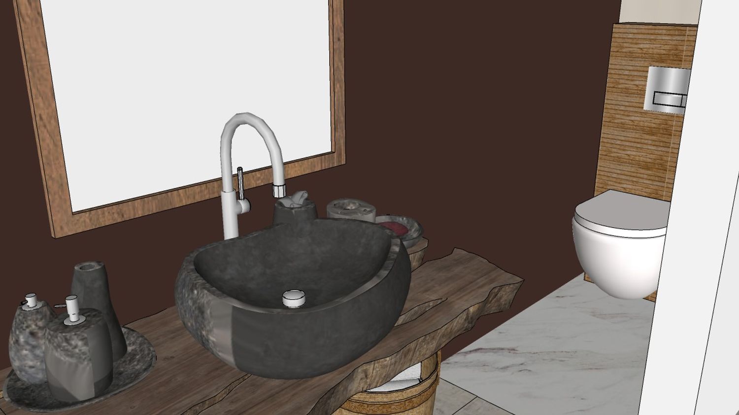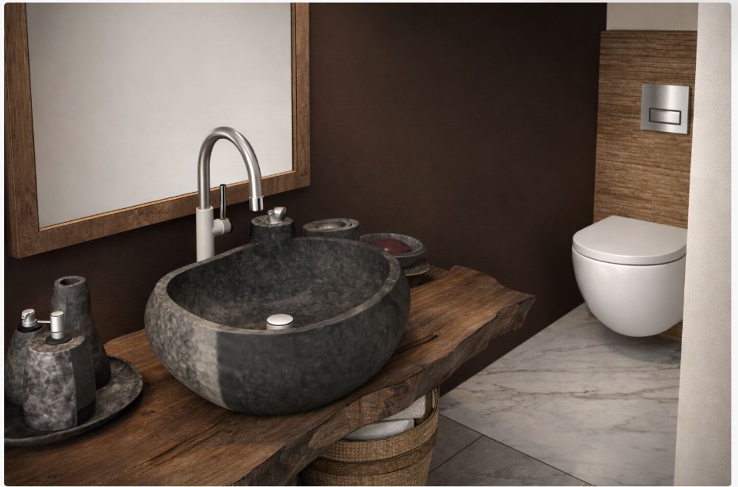Il bagno è progettato con un forte richiamo alla matericità e alla naturalità.
