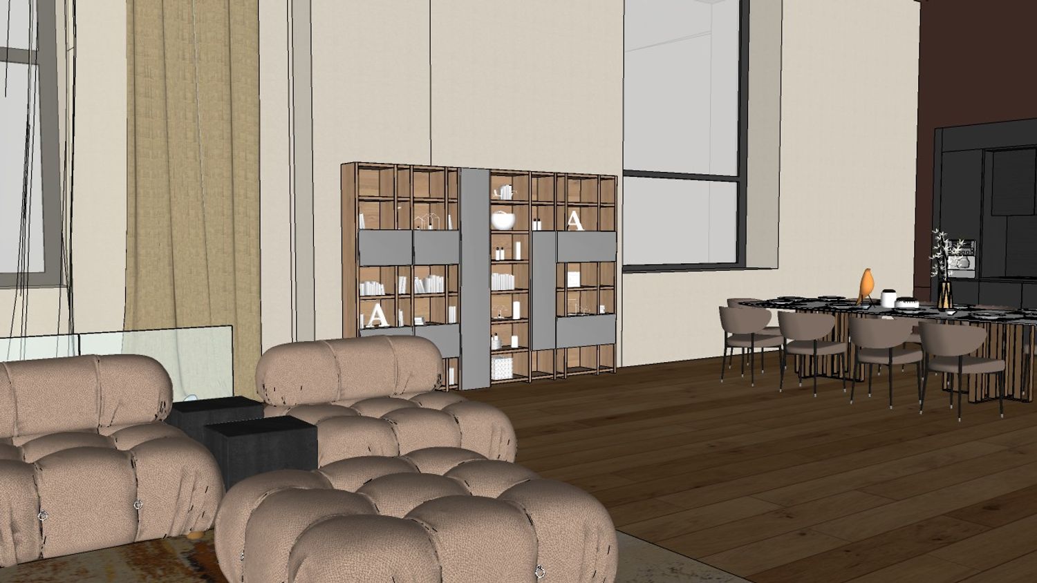 Il tavolo da pranzo centrale crea un punto di incontro tra zona living e cucina, favorendo convivialità e funzionalità.