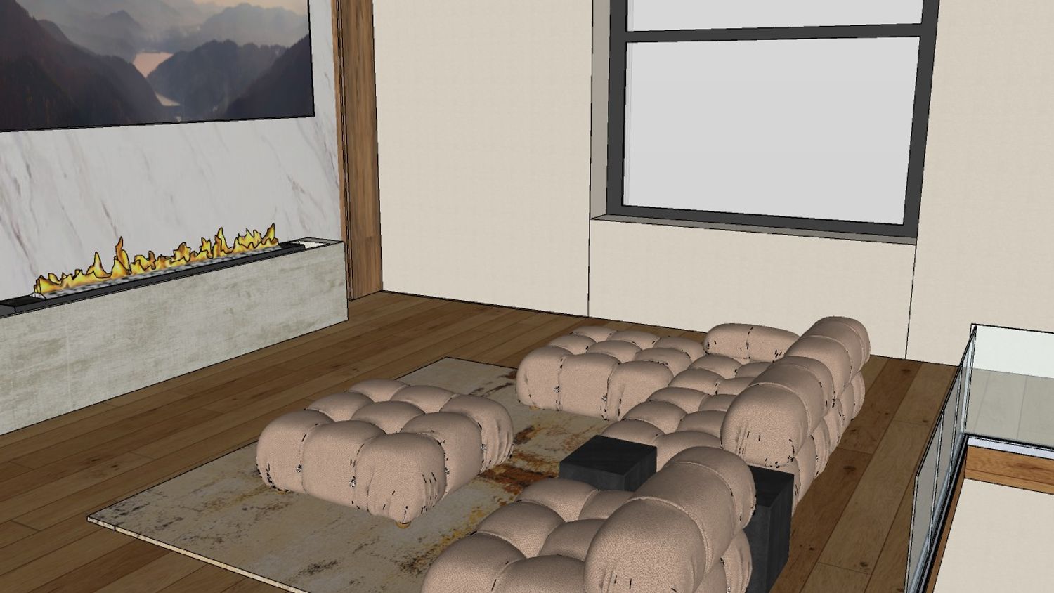 L'arredo è composto da un ampio divano modulare dalle tonalità neutre che definisce la zona relax, accompagnato da un tappeto materico che contribuisce a creare un'atmosfera accogliente.