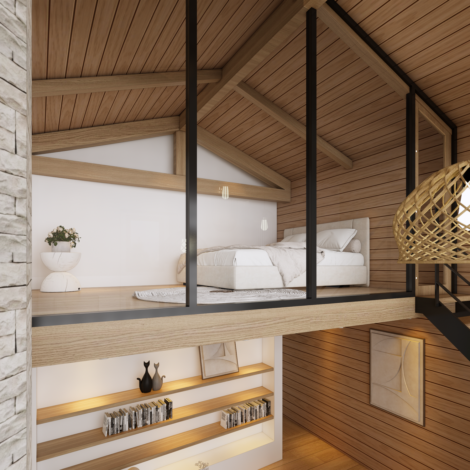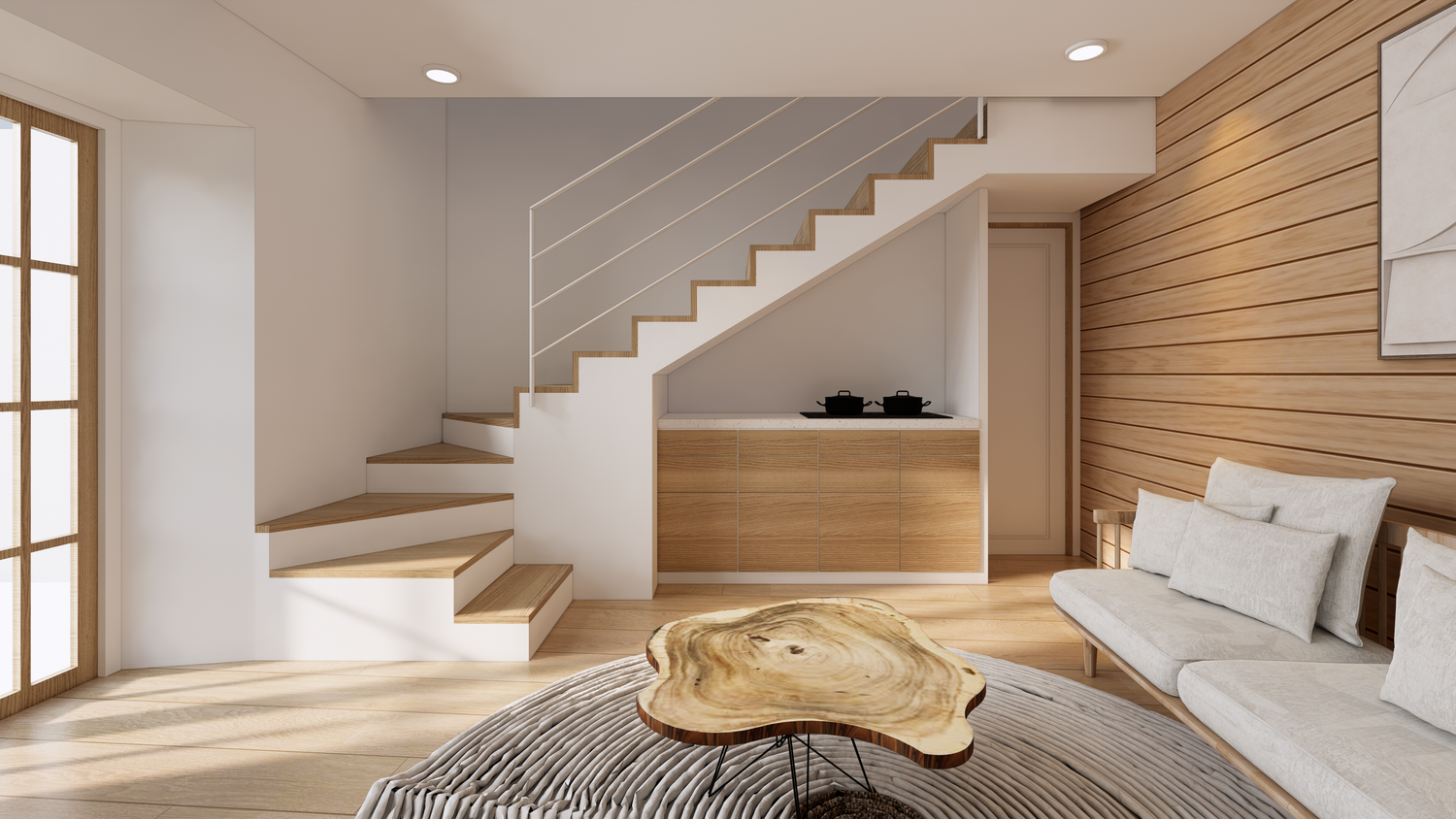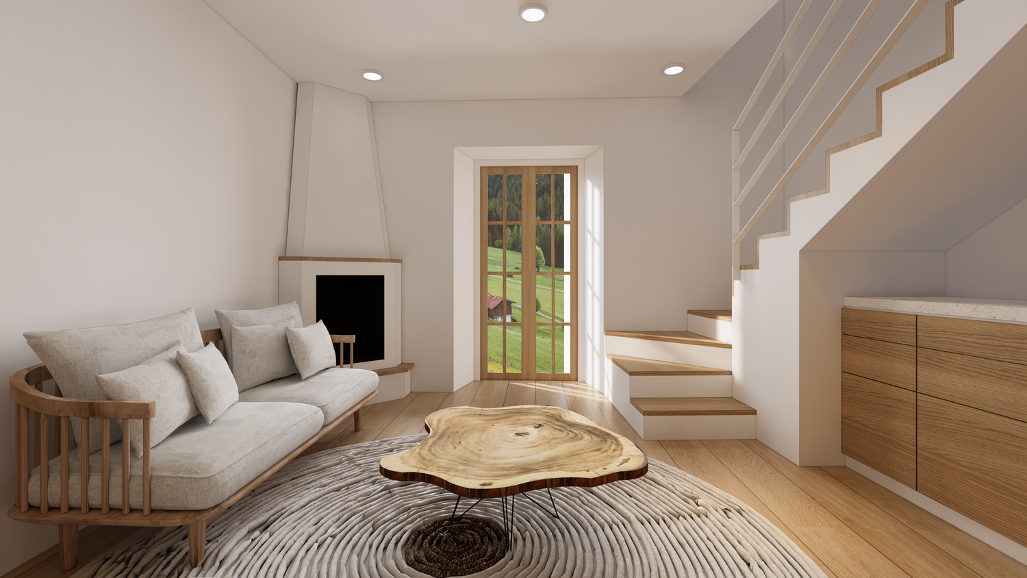 On the ground floor, there's a direct entrance leading to the ground-floor living room with a sofa and a small pantry under the stairs. There's also a guest bathroom and a guest bed accessible from the living room hallway. I also placed a fireplace in this area to allow smoke exhaust to be coordinated with the second-floor fireplace.