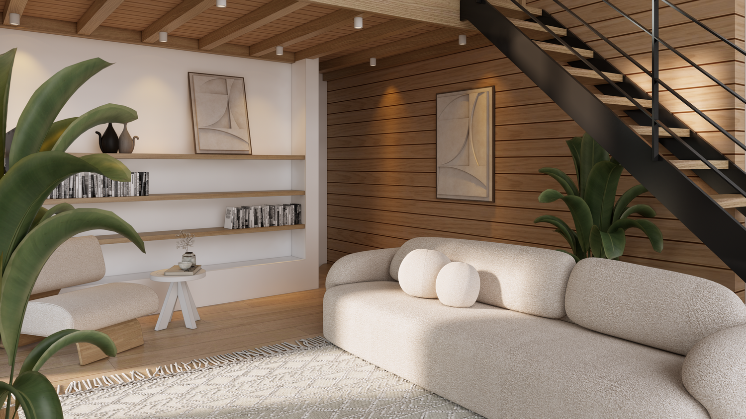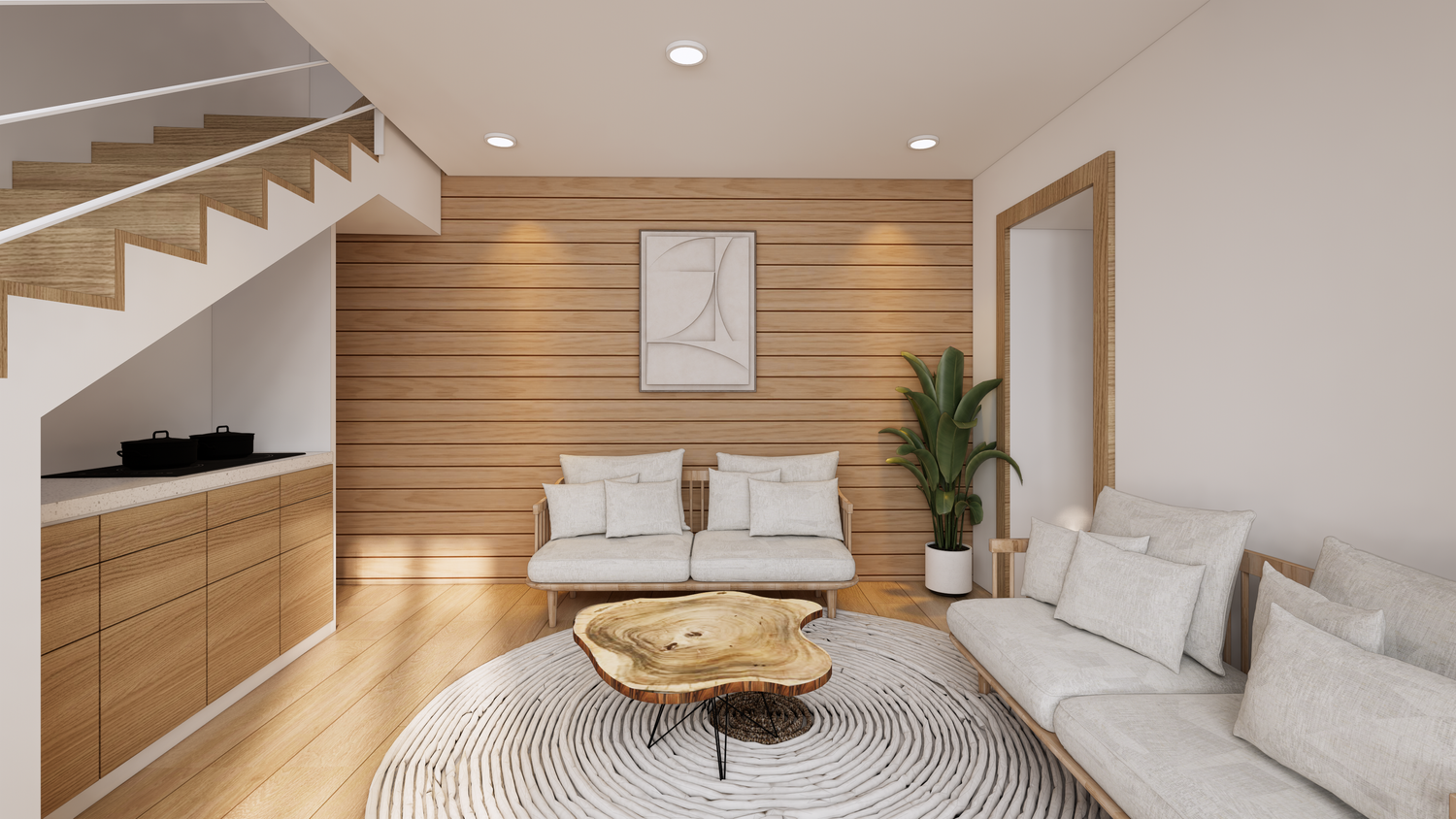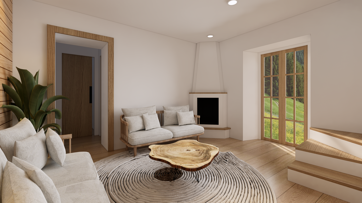 On the ground floor, there's a direct entrance leading to the ground-floor living room with a sofa and a small pantry under the stairs. There's also a guest bathroom and a guest bed accessible from the living room hallway. I also placed a fireplace in this area to allow smoke exhaust to be coordinated with the second-floor fireplace.