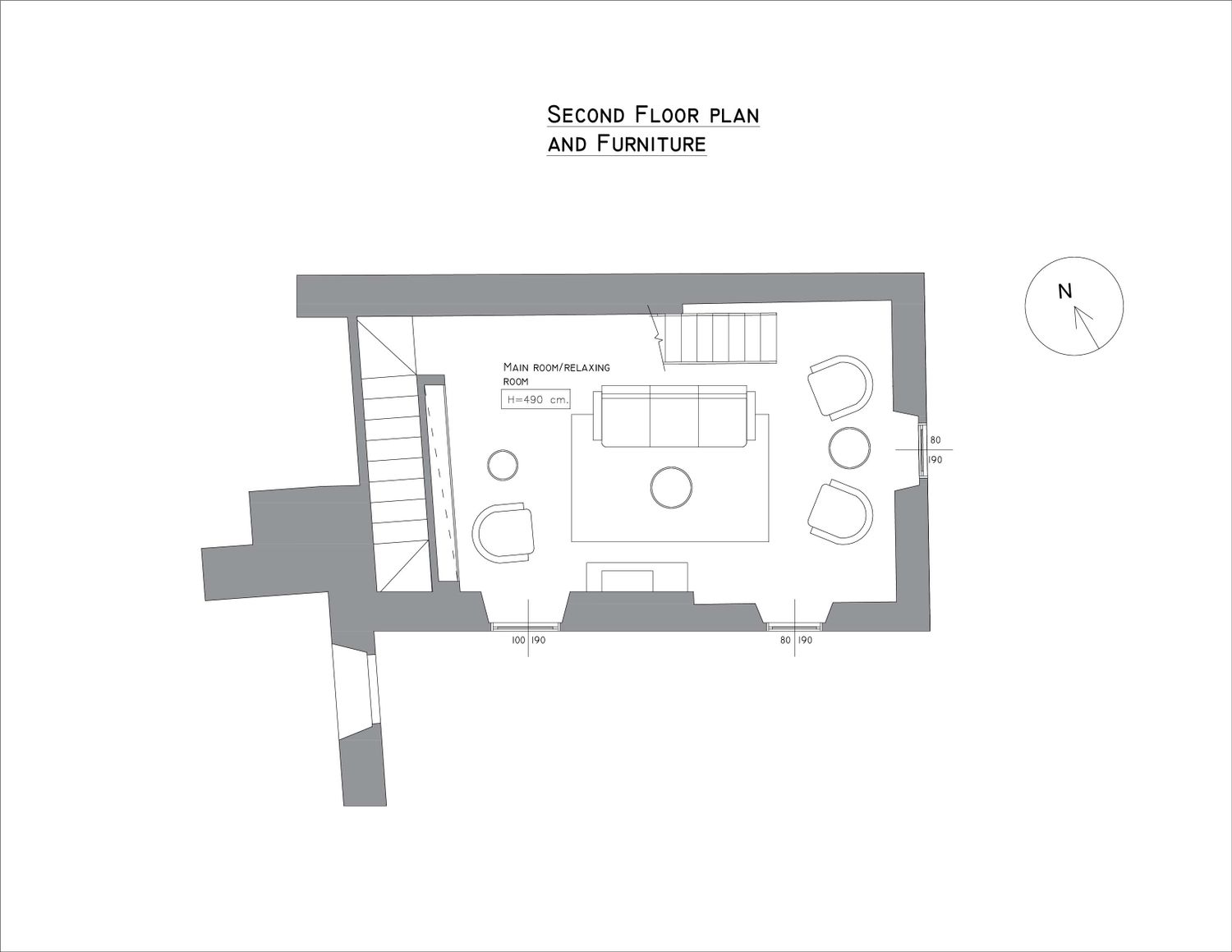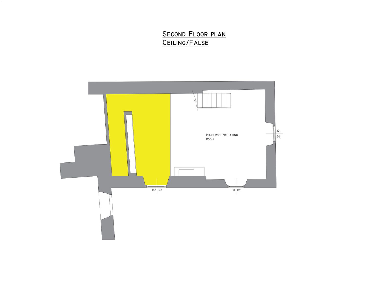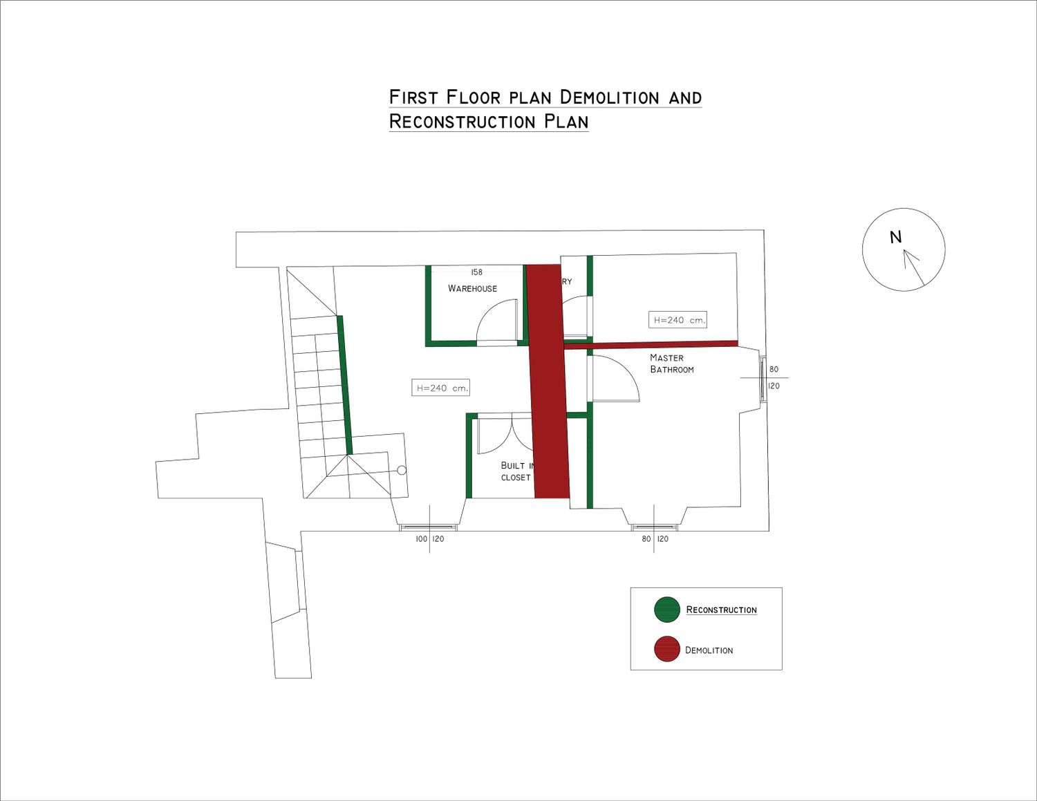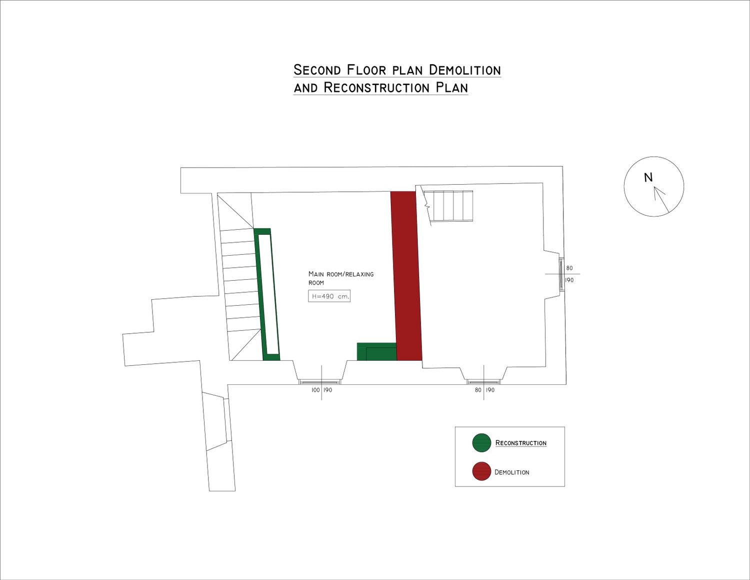 I demolished the attic floor, making the second floor double-height. The center wall on the first and second floors was also completely removed, but I kept the center wall on the ground floor.