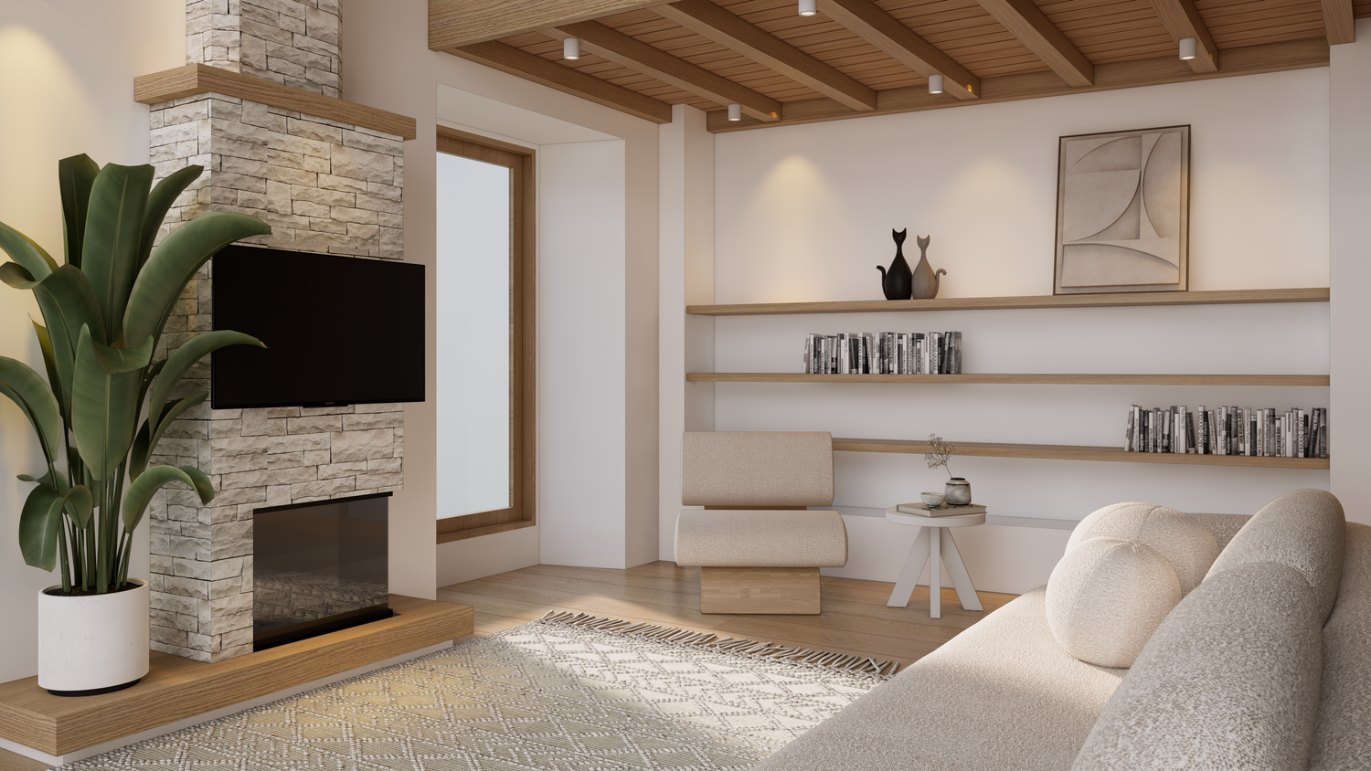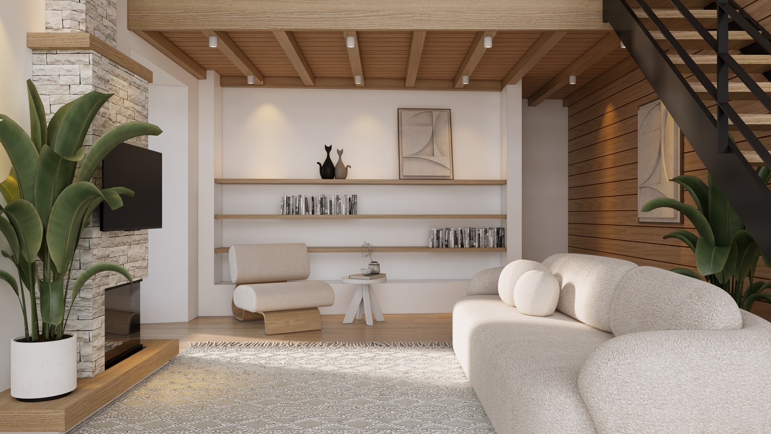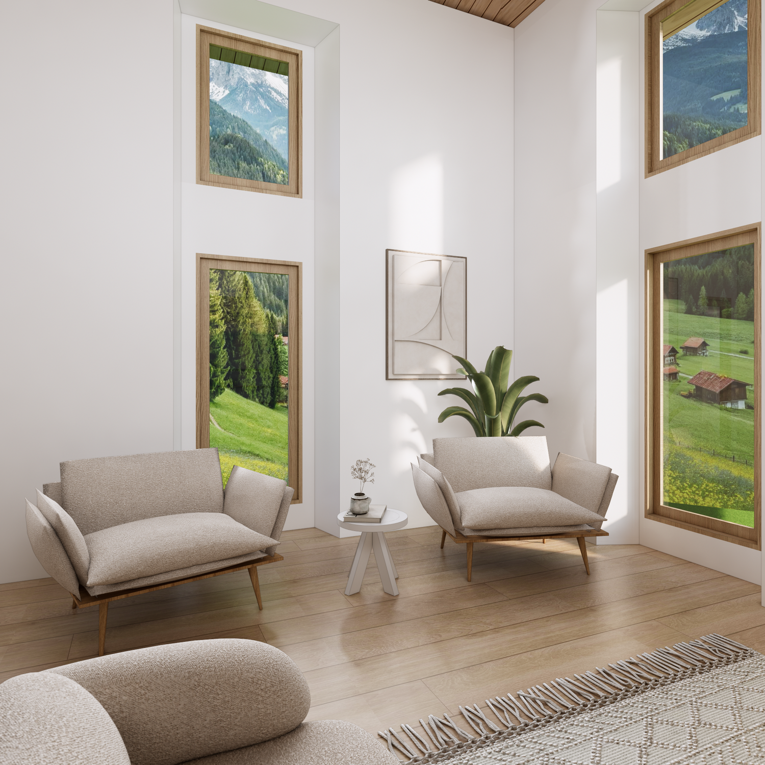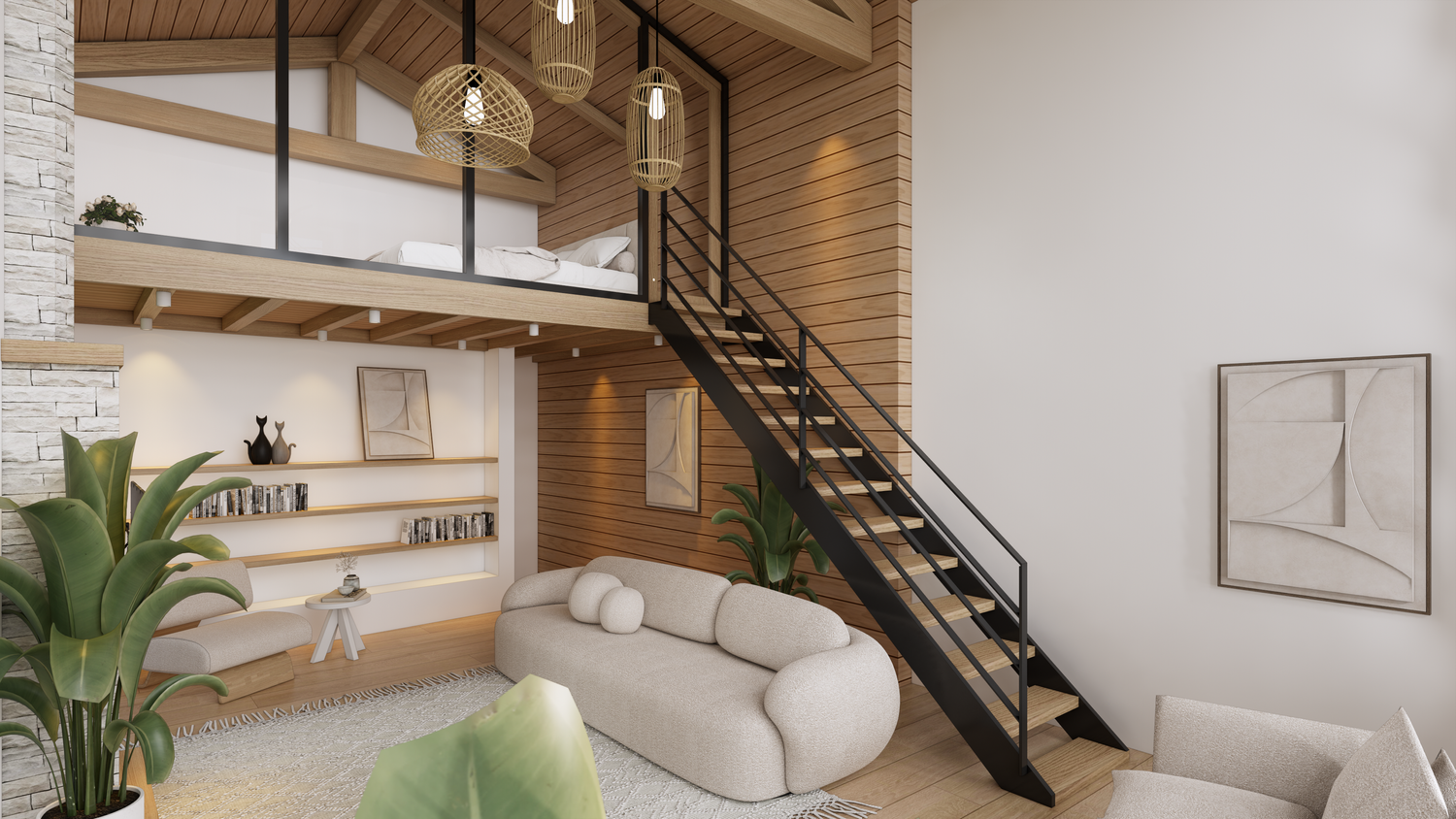 The second floor underwent significant changes. By demolishing the attic floor, the second floor has a double height, allowing for maximum sunlight. I also increased the windows to be longer vertically to maximize sunlight. Enlarging the windows vertically was the wisest choice, as it saved us from having to demolish a load-bearing wall, which is quite risky. Furthermore, there's a mezzanine for the master bedroom, and a spacious room with several sofas and a beautiful fireplace.