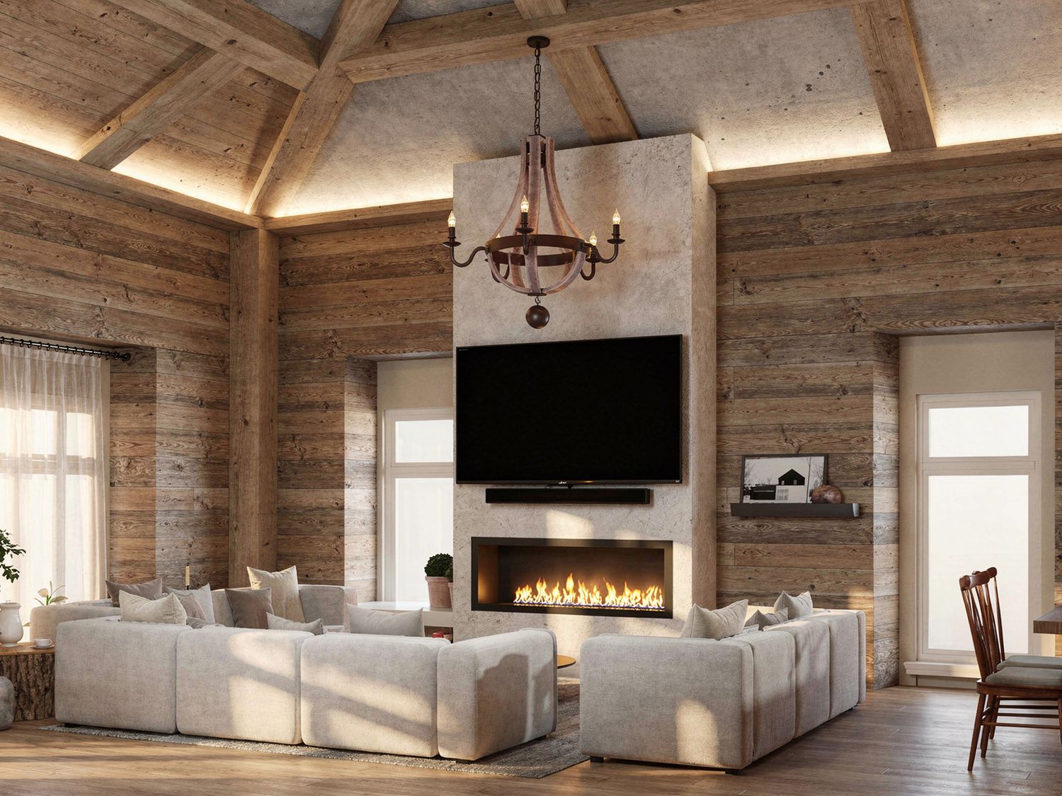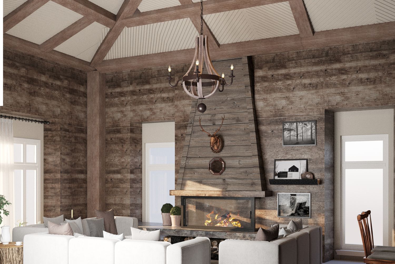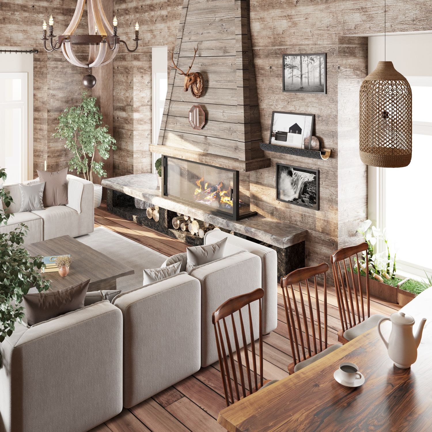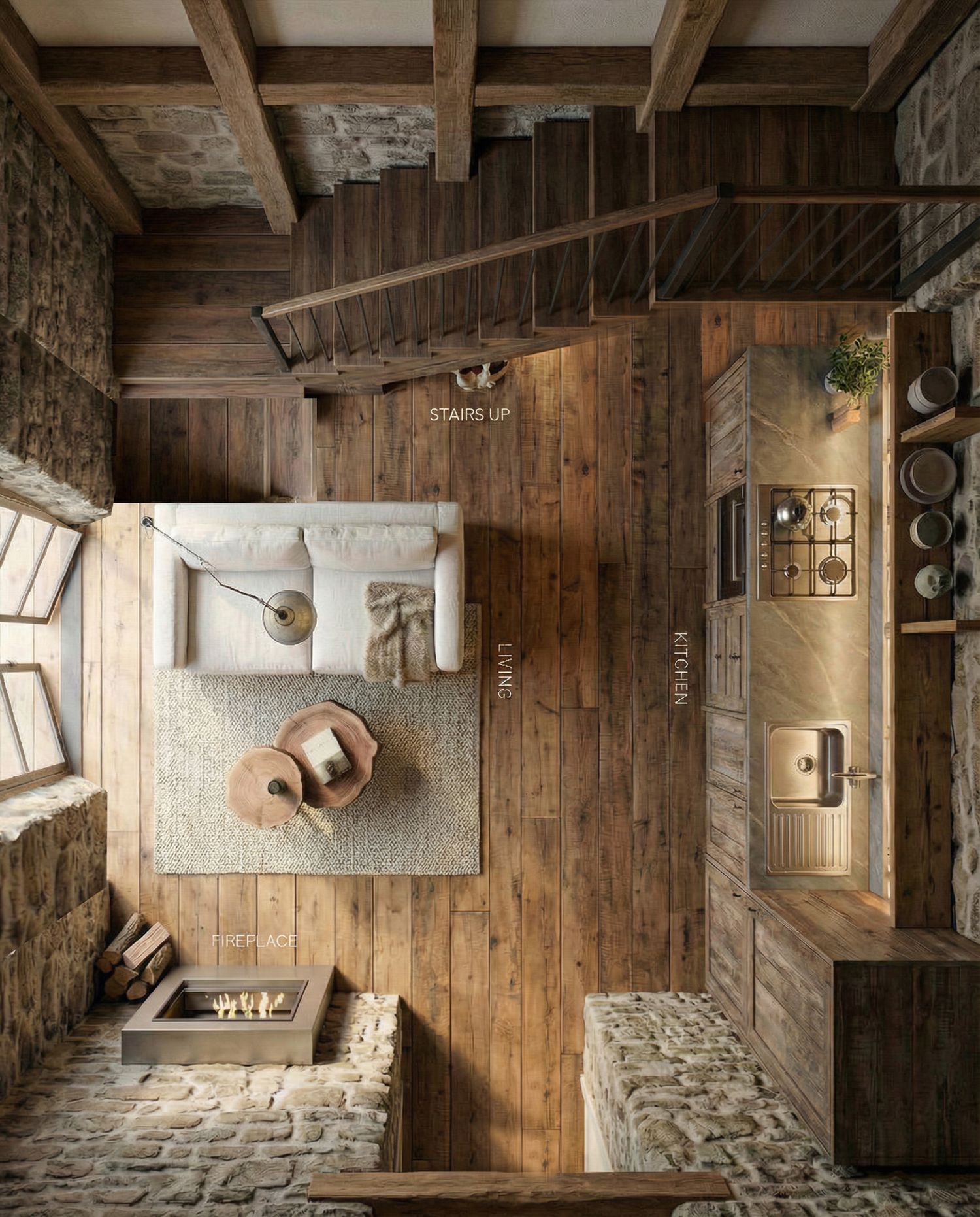Top Floor (Attic): Main living area with fireplace and TV, featuring a large window opened toward the beautiful mountain view, along with the enlargement of another existing window to enhance natural light and scenery.