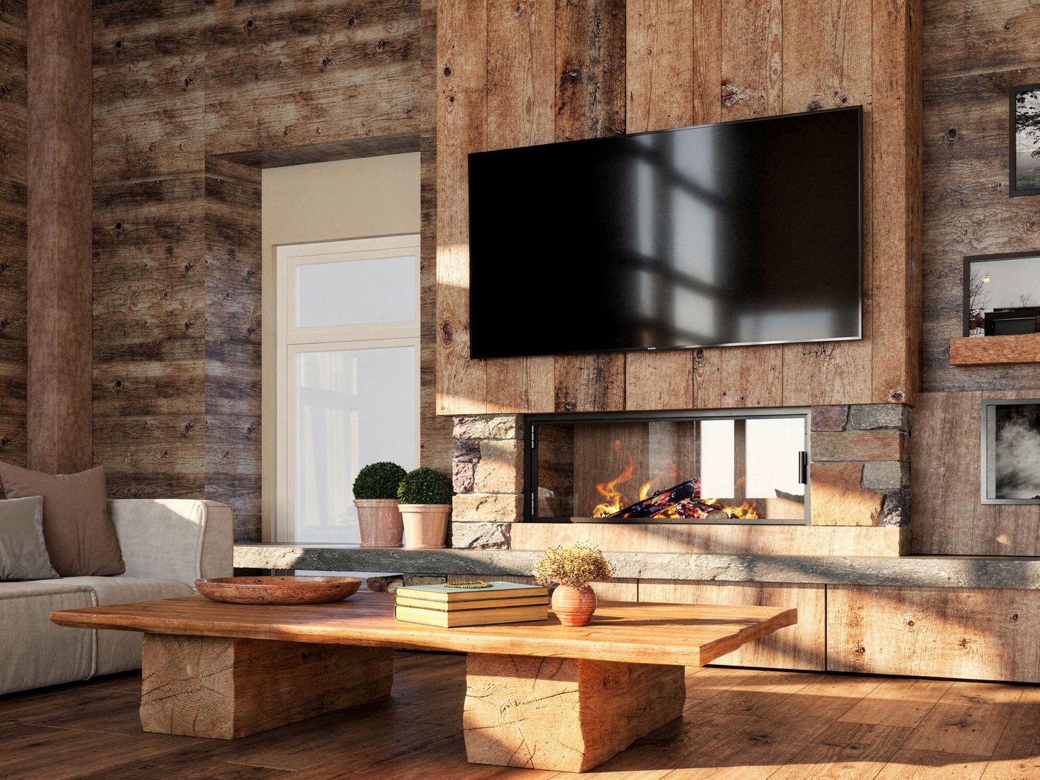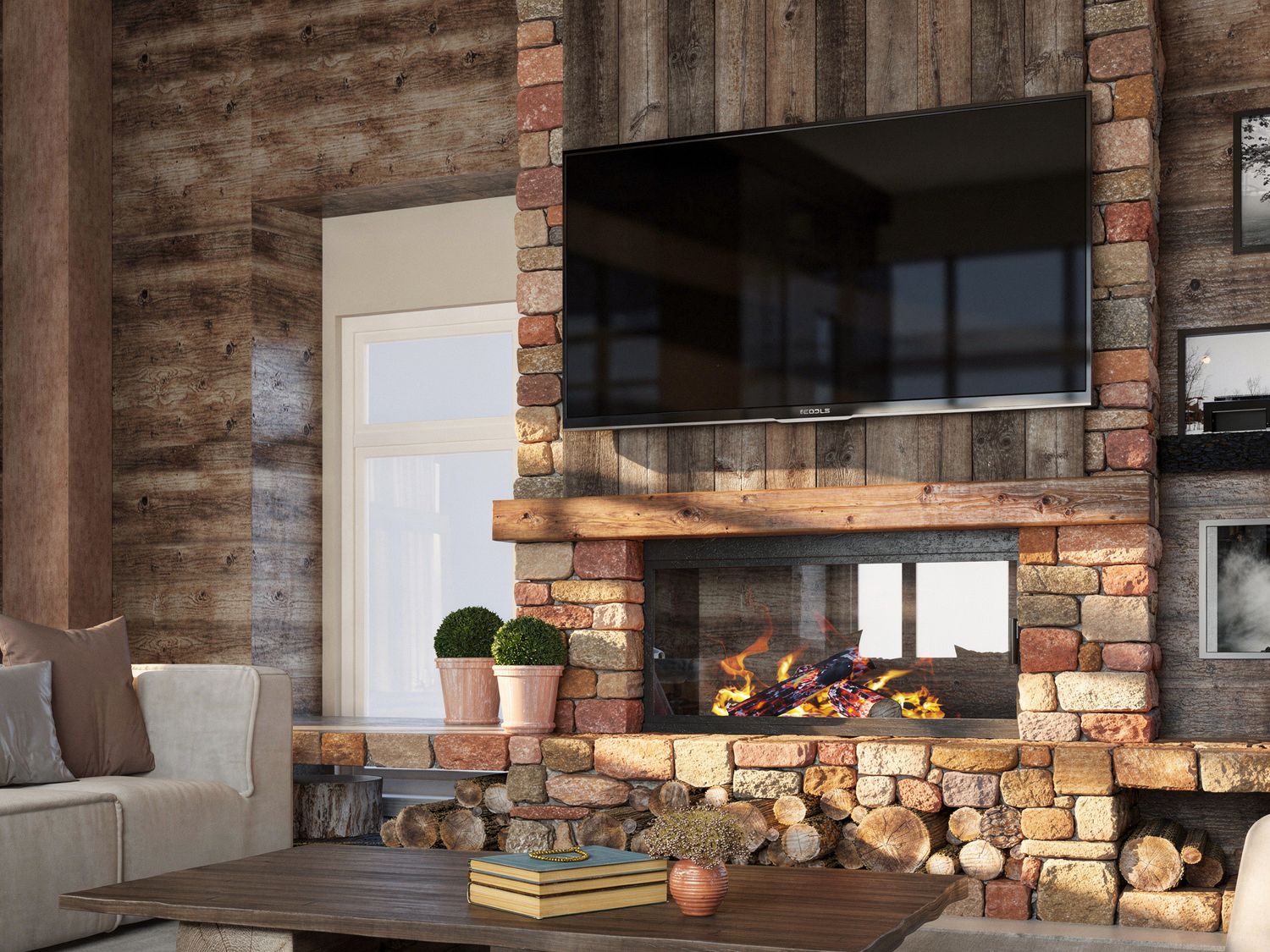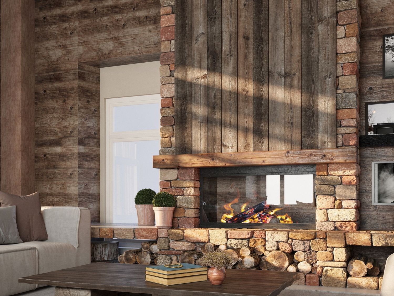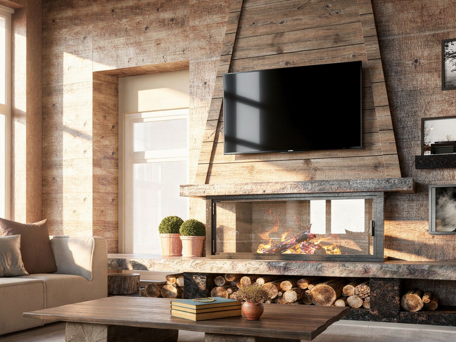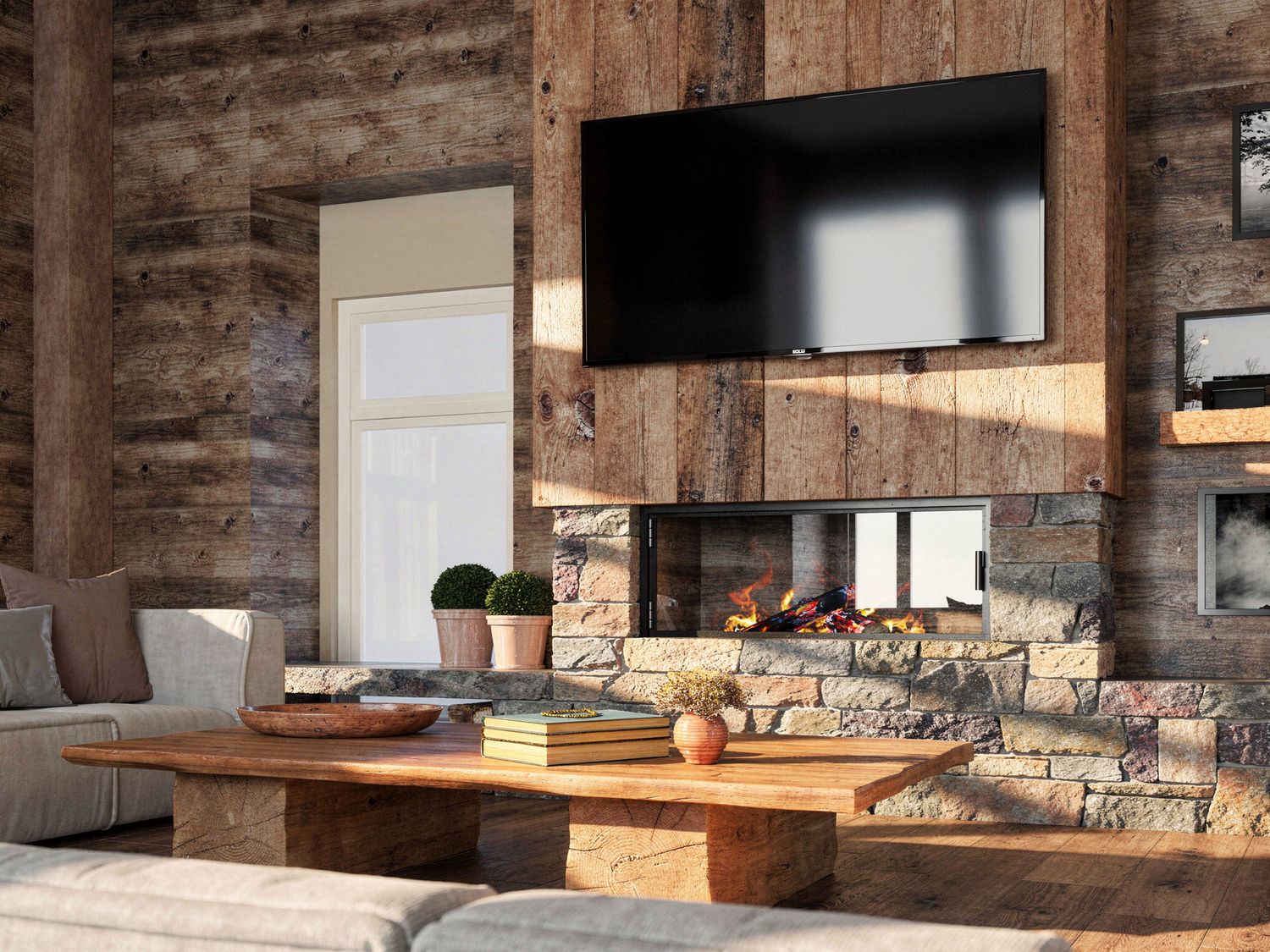 Top Floor (Attic): Main living area with fireplace and TV, featuring a large window opened toward the beautiful mountain view, along with the enlargement of another existing window to enhance natural light and scenery.
