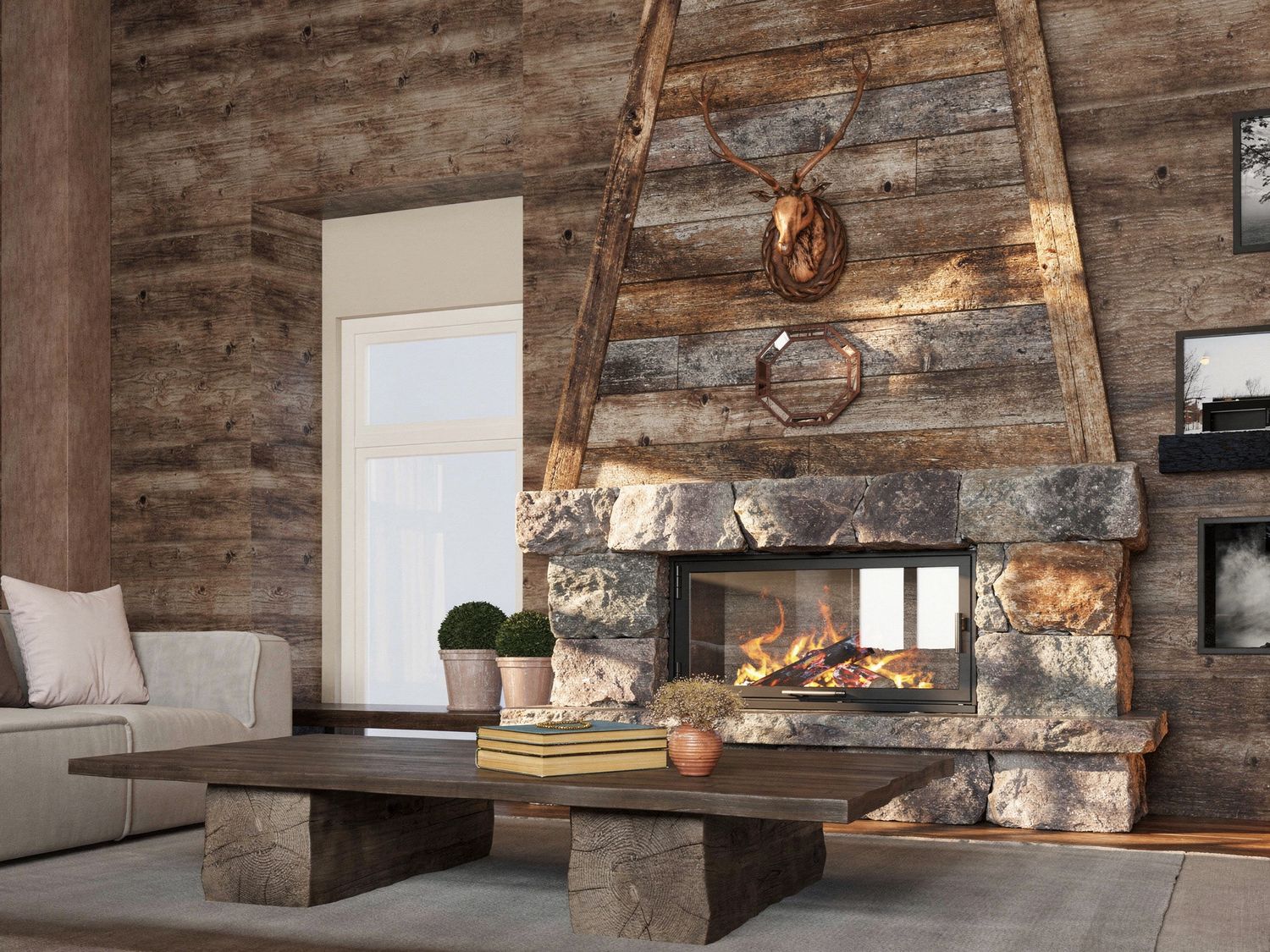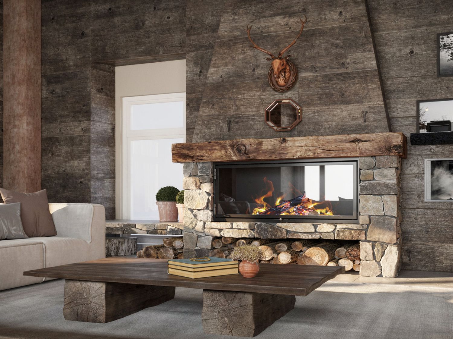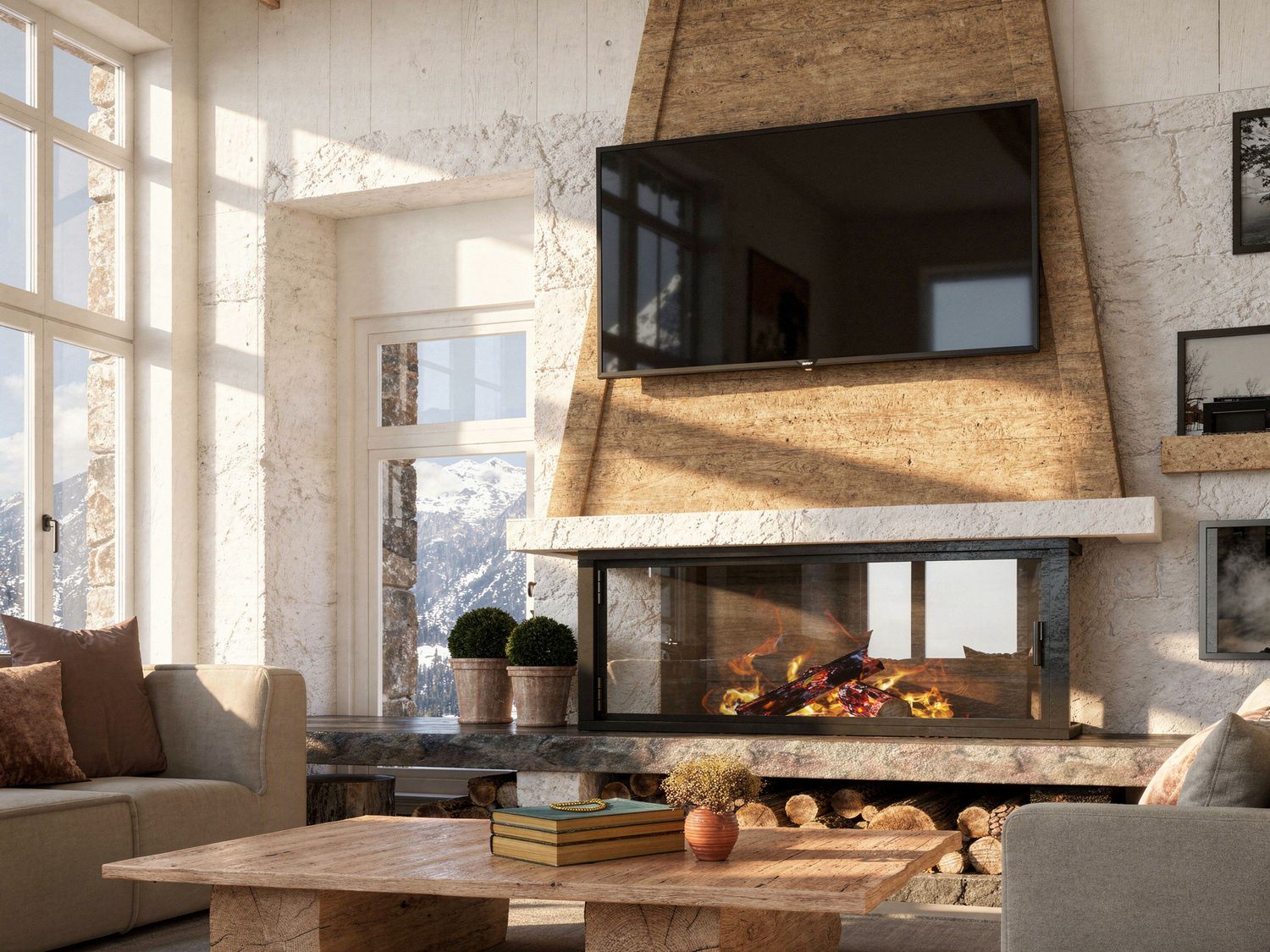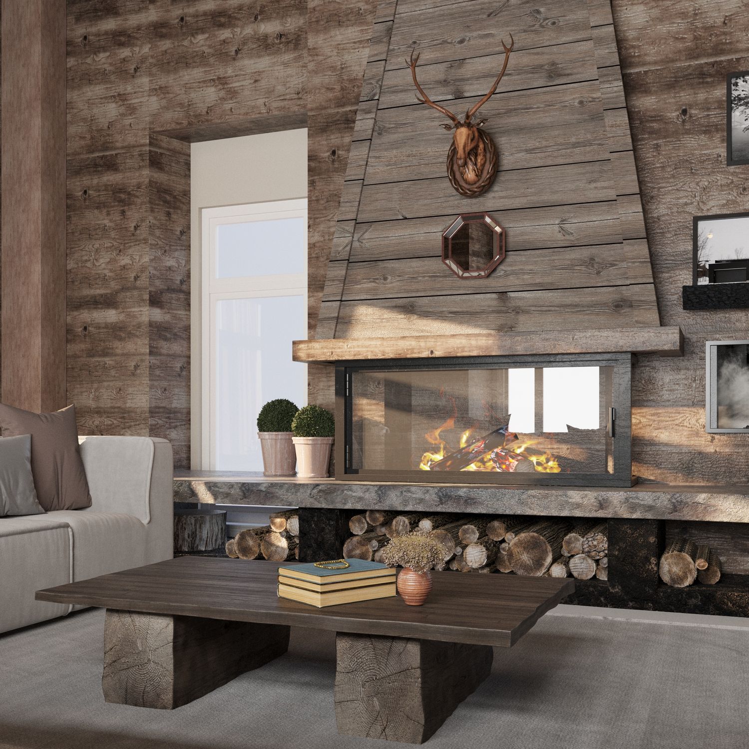 Ultimo piano (mansarda): zona giorno principale con camino e TV, caratterizzata da un'ampia finestra che si apre sulla splendida vista sulle montagne, oltre all'ampliamento di un'altra finestra esistente per migliorare la luce naturale e il panorama.
