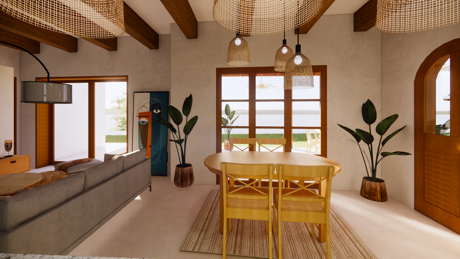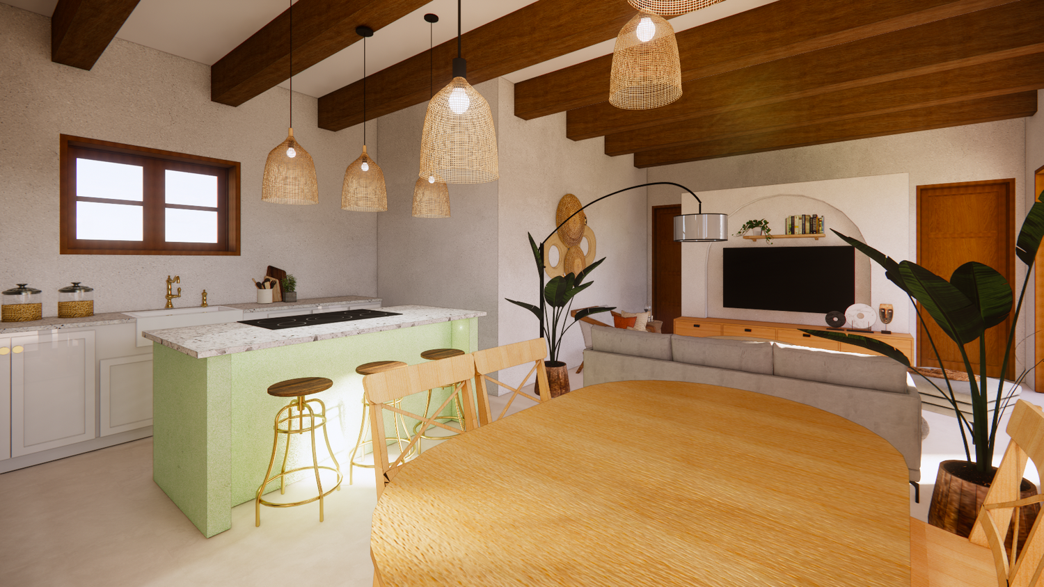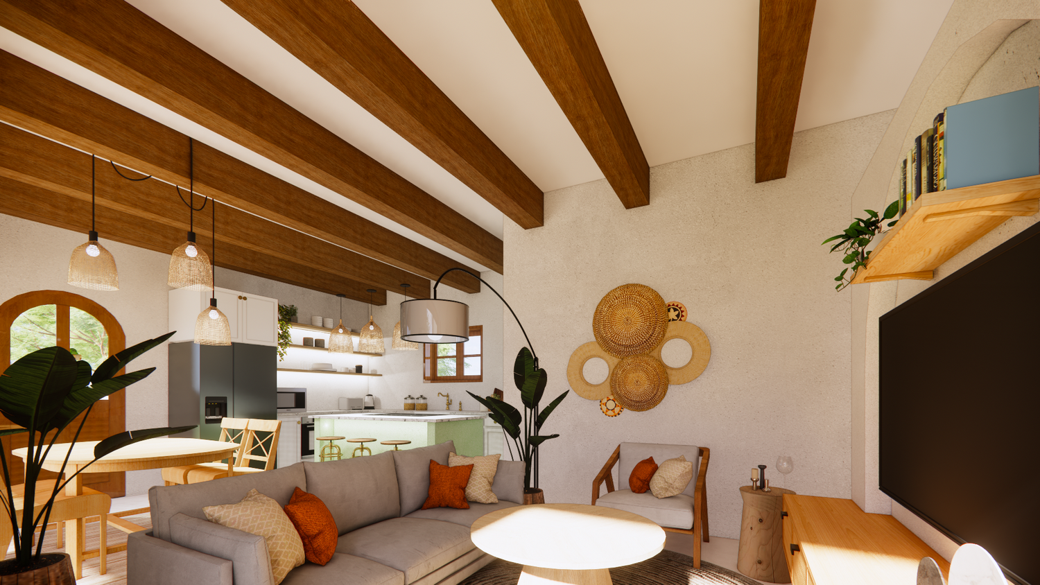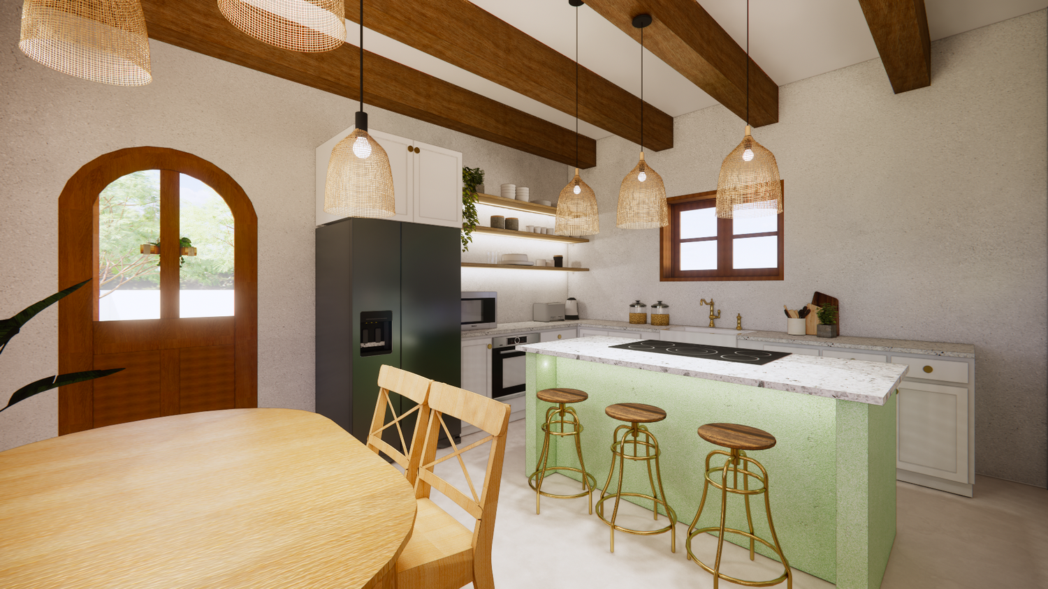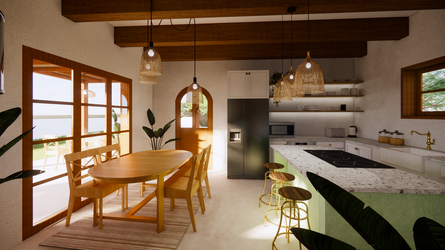 House With combination of Mediterranean Style with Boho Beach Influence. The style we implement through the interior and exterior, from the main door entrance we made the door with arc, a common practice in Mediterranean style house made of timber with combination of glass panel to invite natural lighting into the kitchen. Through the main door we will meet the open layout dining-living room and kitchen with Mediterranean with boho beach influence interior ambience depicted from the finishes, furniture, and decoration.