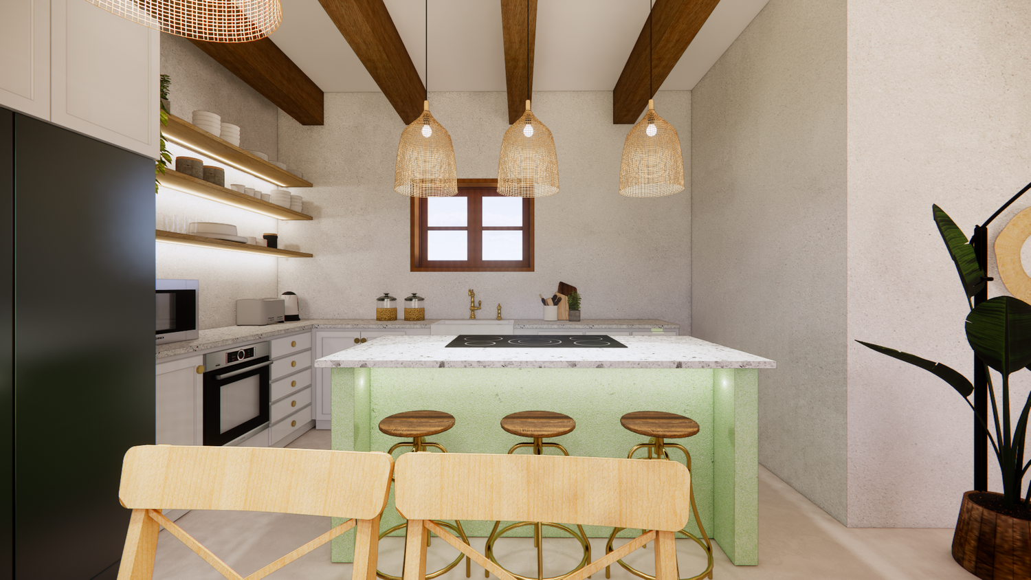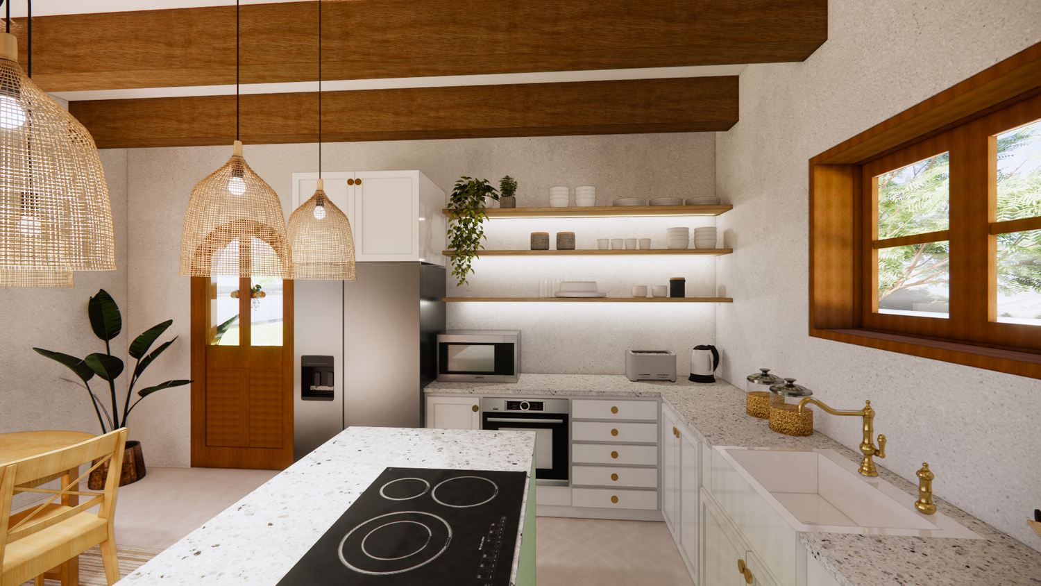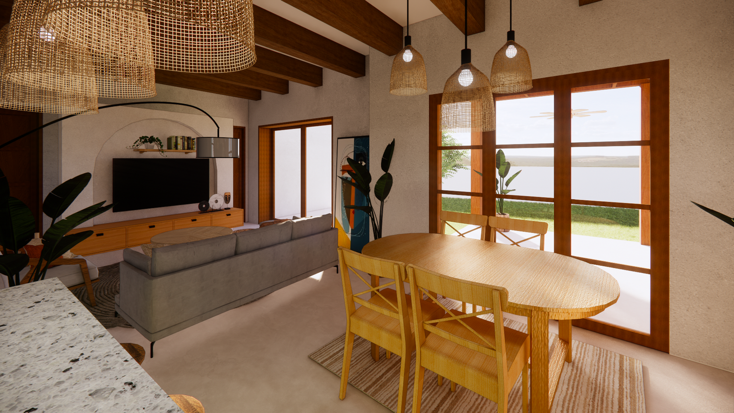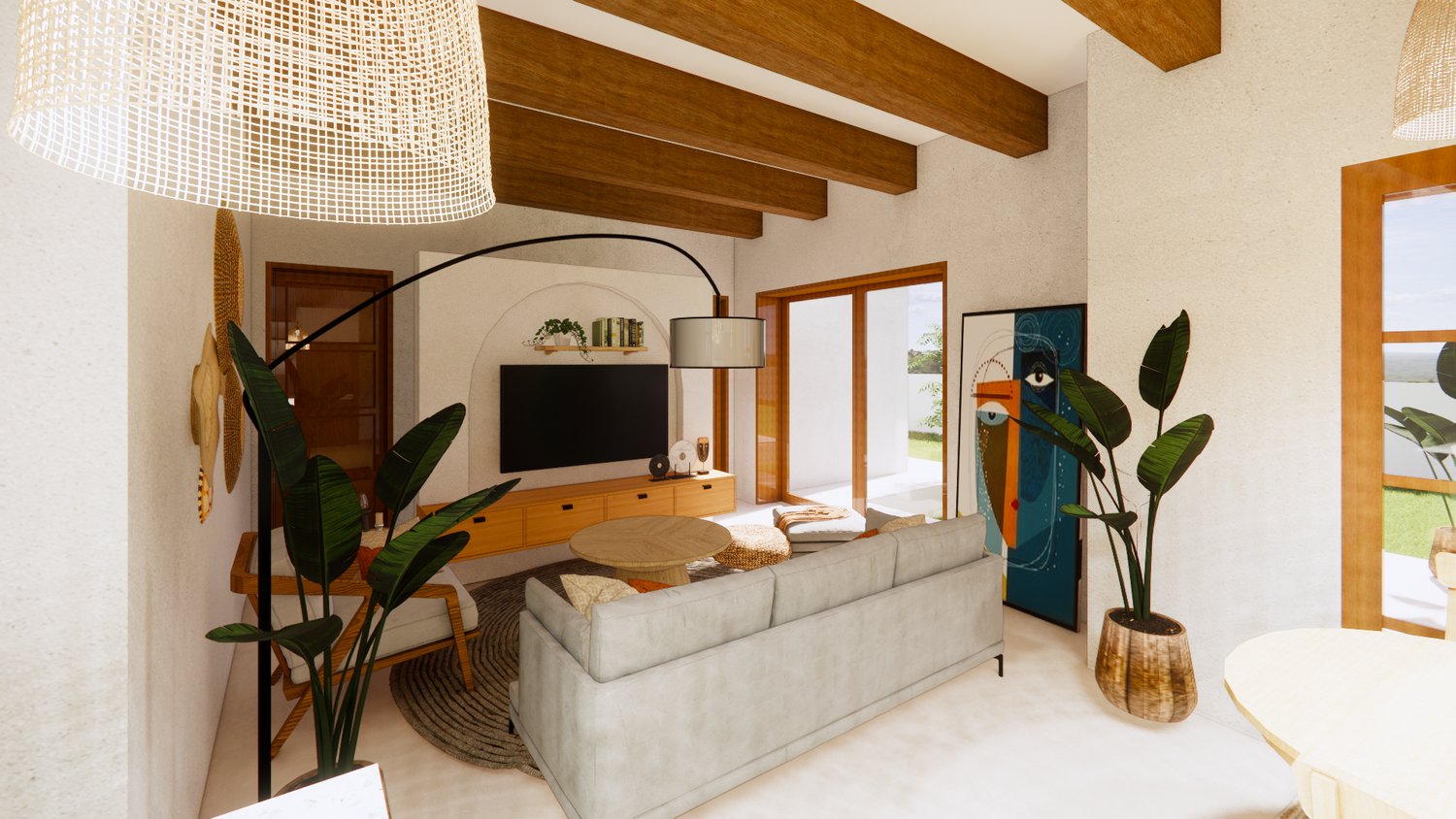 House With combination of Mediterranean Style with Boho Beach Influence. The style we implement through the interior and exterior, from the main door entrance we made the door with arc, a common practice in Mediterranean style house made of timber with combination of glass panel to invite natural lighting into the kitchen. Through the main door we will meet the open layout dining-living room and kitchen with Mediterranean with boho beach influence interior ambience depicted from the finishes, furniture, and decoration.