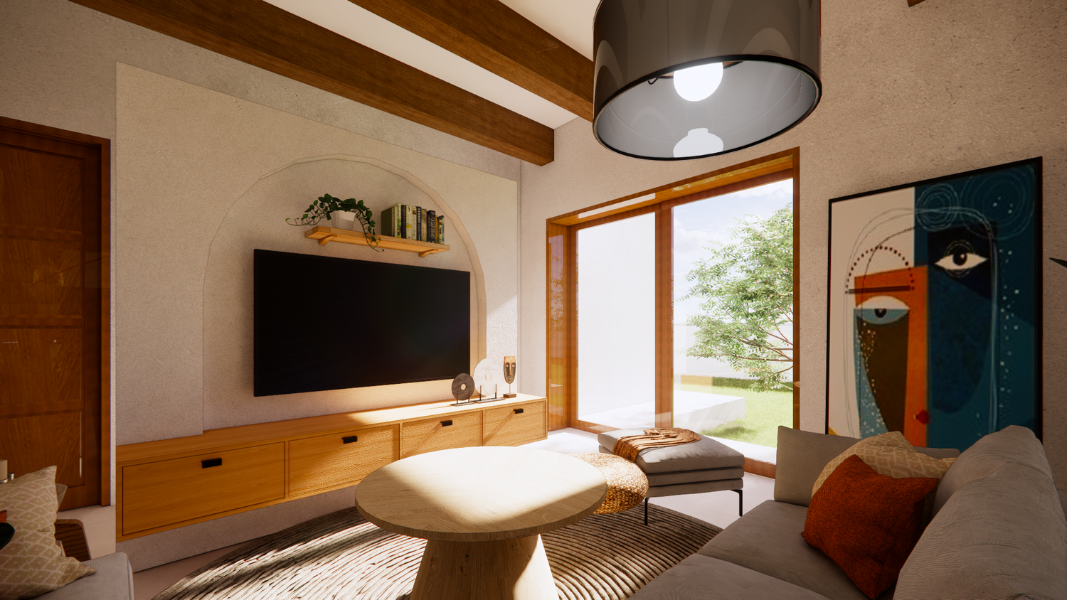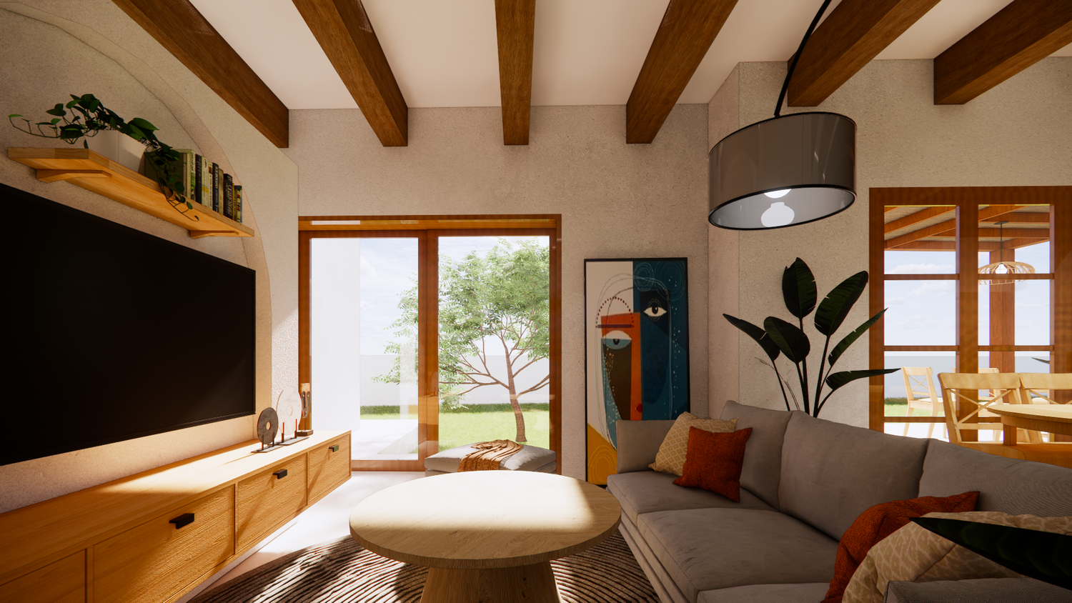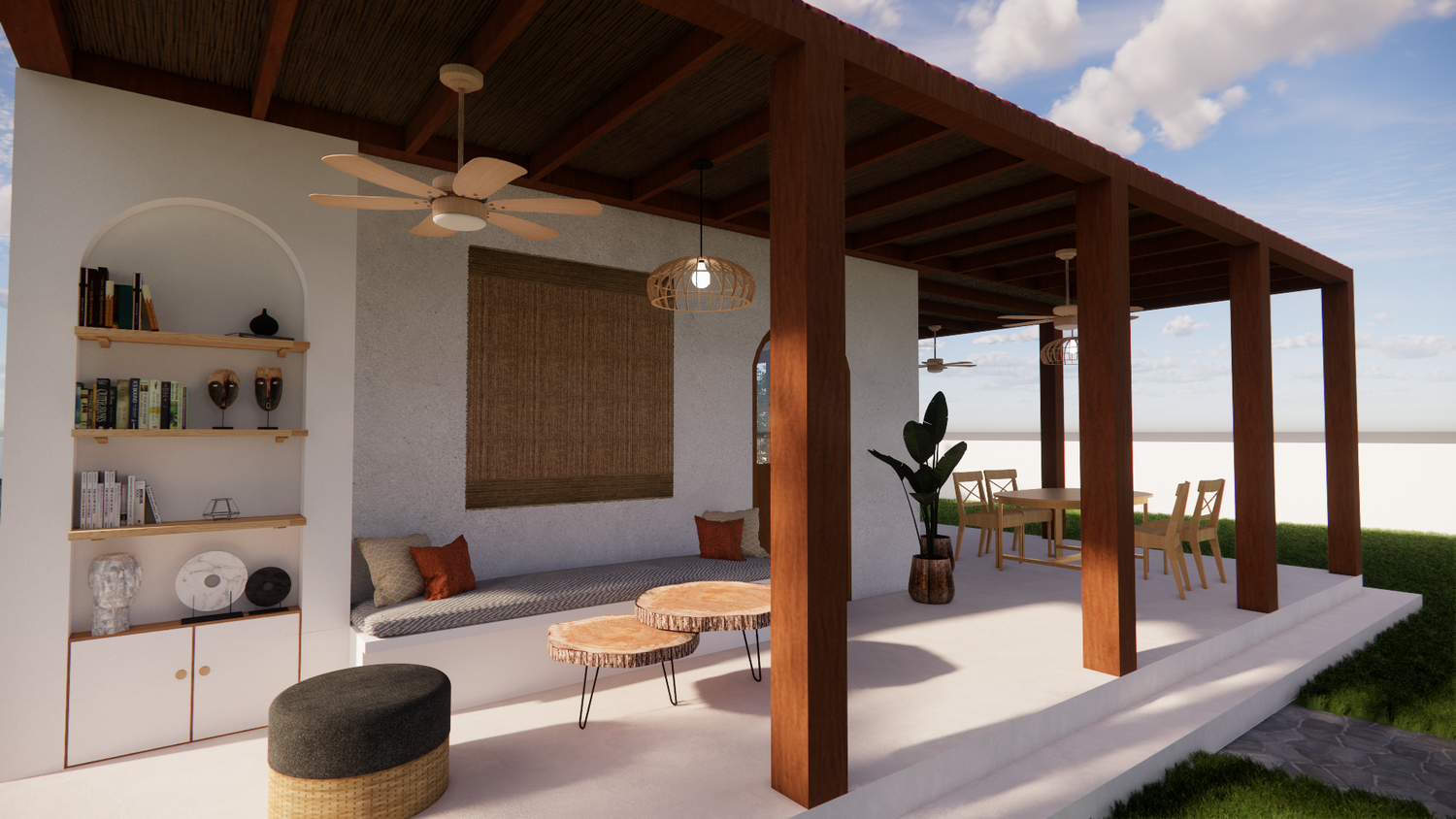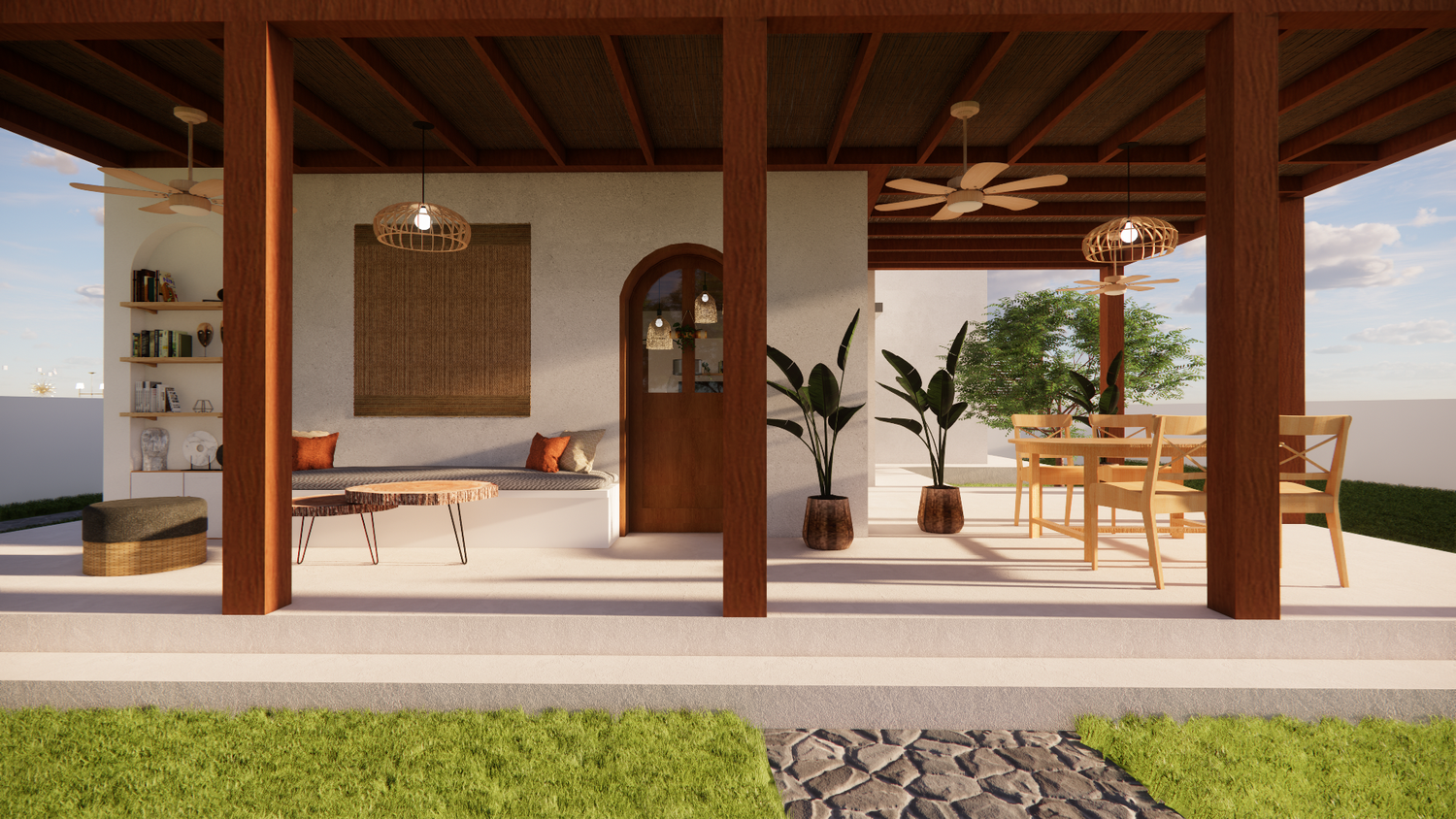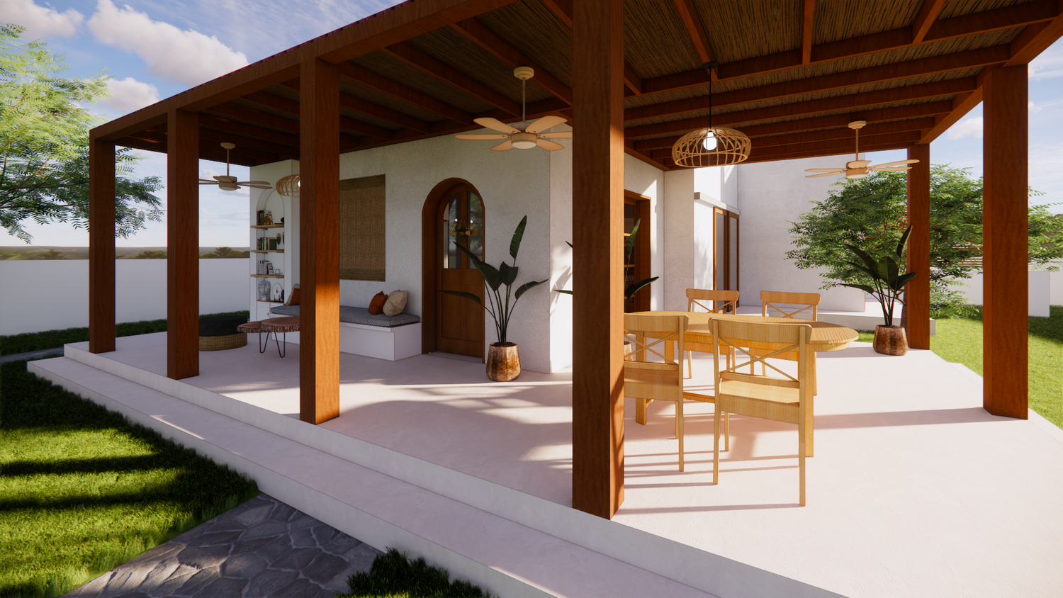 House With combination of Mediterranean Style with Boho Beach Influence. The style we implement through the interior and exterior, from the main door entrance we made the door with arc, a common practice in Mediterranean style house made of timber with combination of glass panel to invite natural lighting into the kitchen. Through the main door we will meet the open layout dining-living room and kitchen with Mediterranean with boho beach influence interior ambience depicted from the finishes, furniture, and decoration.