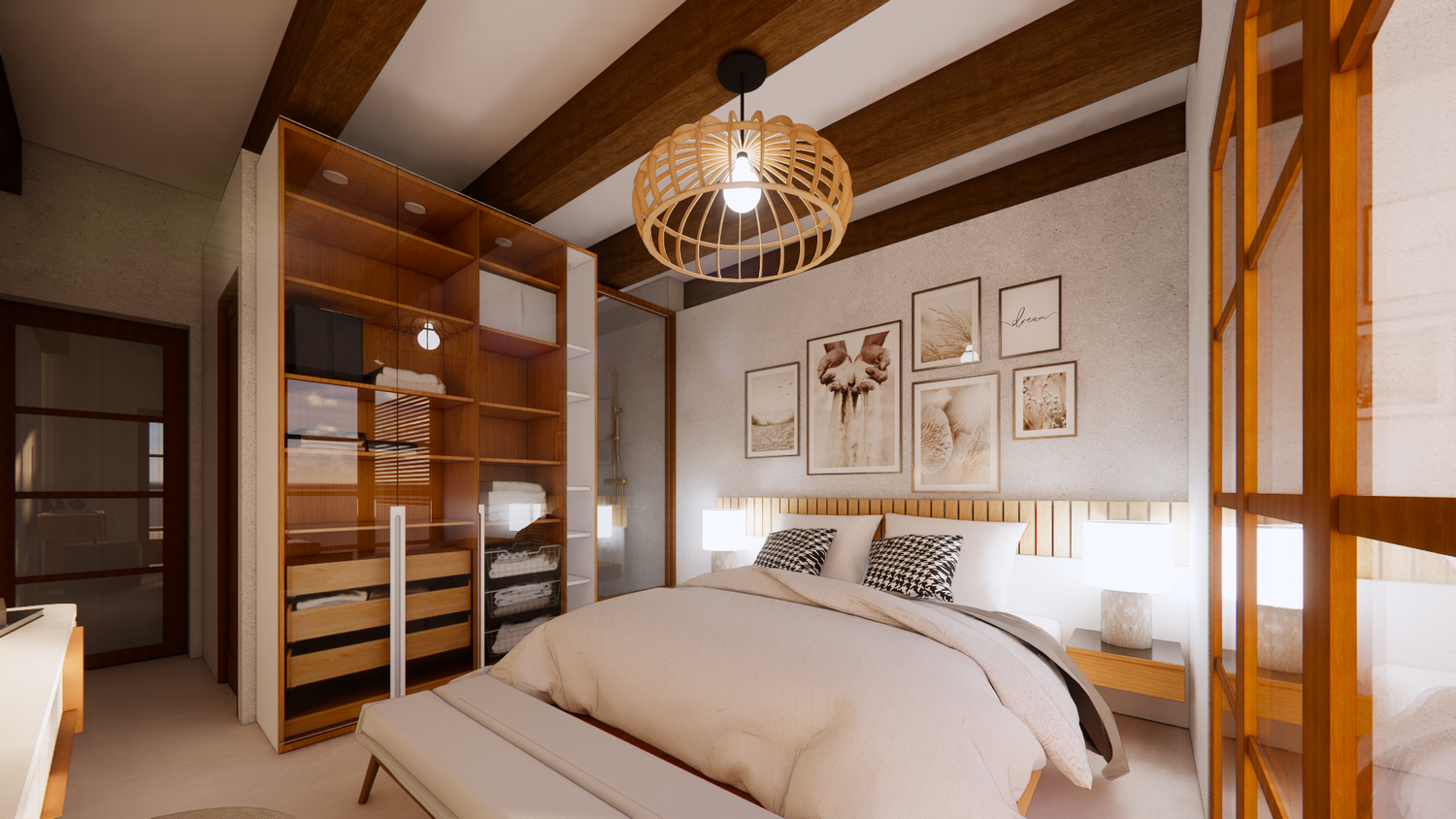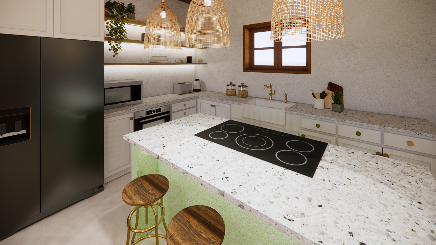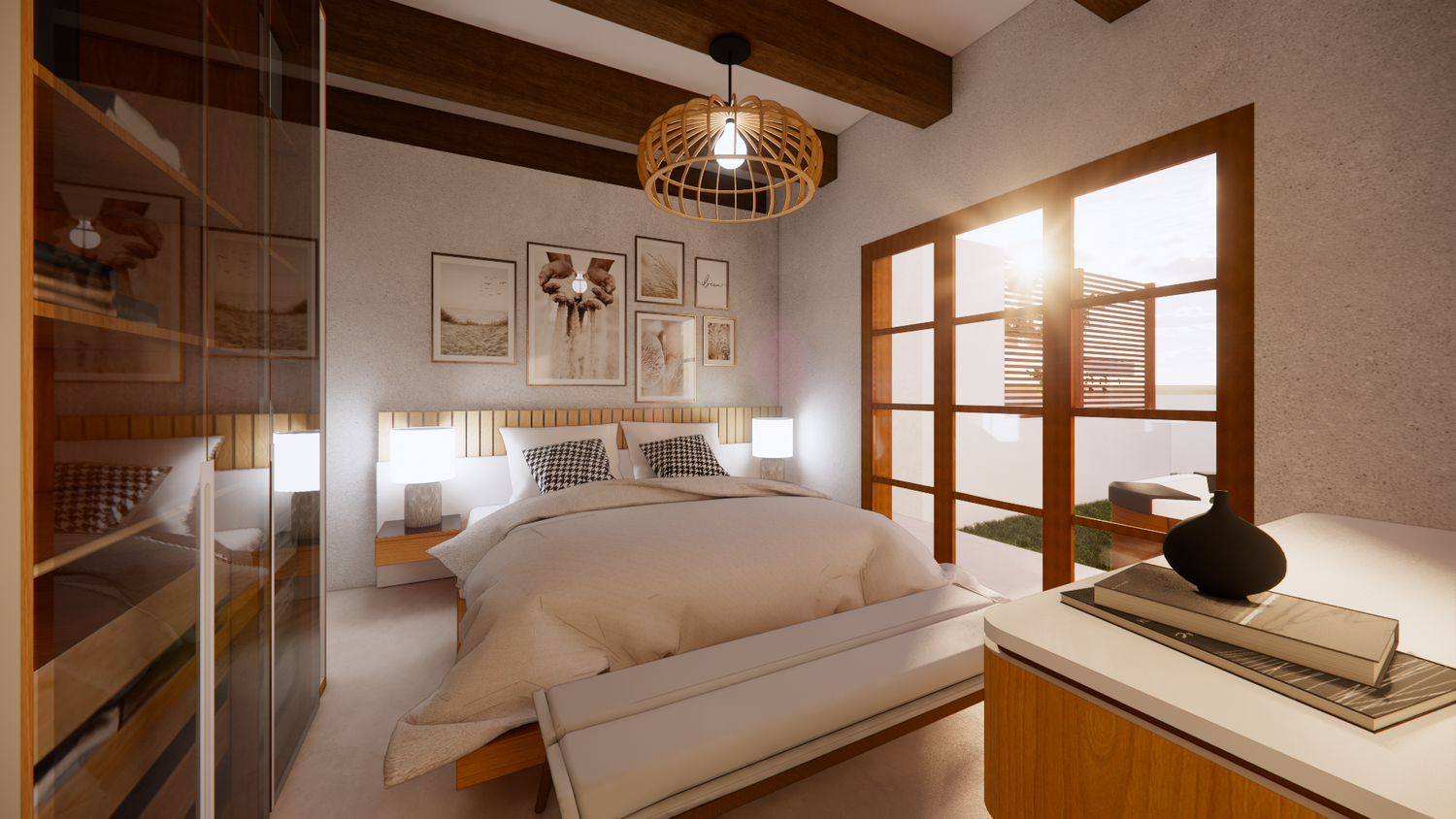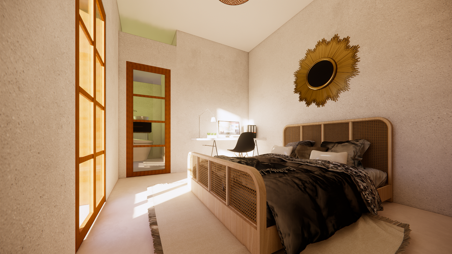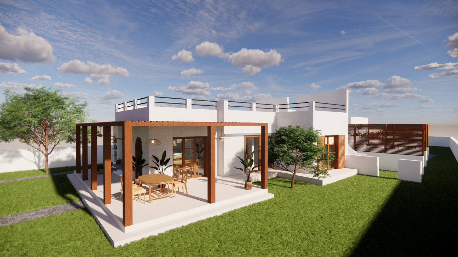 House With combination of Mediterranean Style with Boho Beach Influence. The style we implement through the interior and exterior, from the main door entrance we made the door with arc, a common practice in Mediterranean style house made of timber with combination of glass panel to invite natural lighting into the kitchen. Through the main door we will meet the open layout dining-living room and kitchen with Mediterranean with boho beach influence interior ambience depicted from the finishes, furniture, and decoration.
