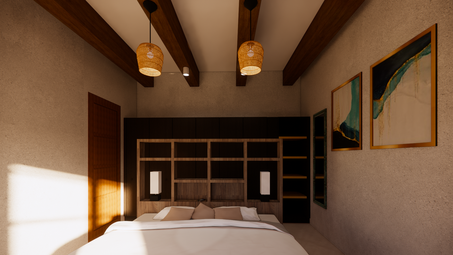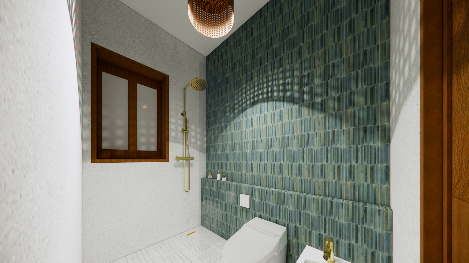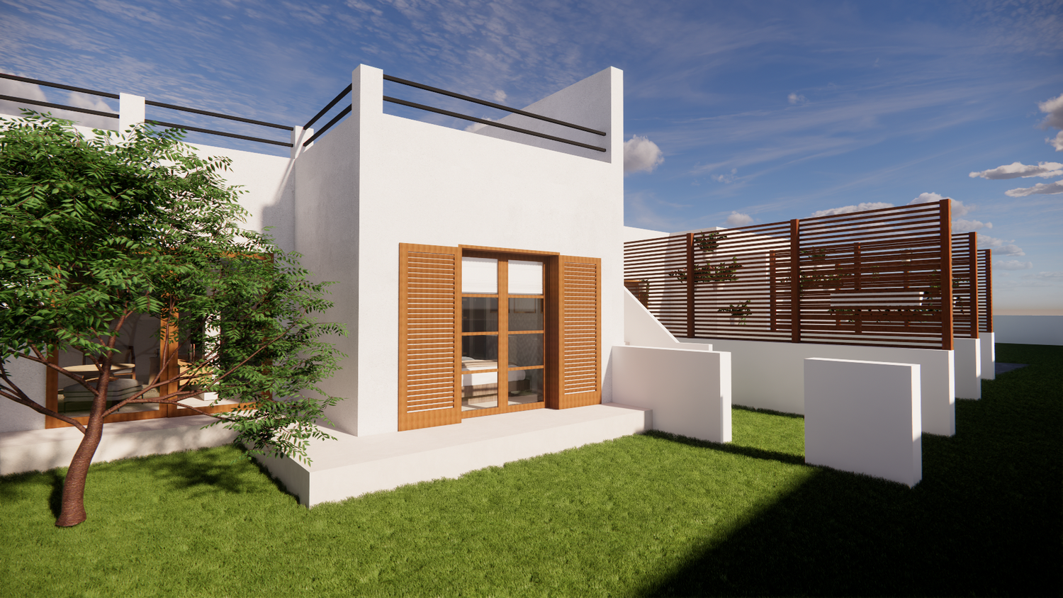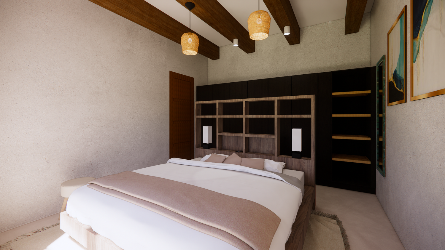 House With combination of Mediterranean Style with Boho Beach Influence. The style we implement through the interior and exterior, from the main door entrance we made the door with arc, a common practice in Mediterranean style house made of timber with combination of glass panel to invite natural lighting into the kitchen. Through the main door we will meet the open layout dining-living room and kitchen with Mediterranean with boho beach influence interior ambience depicted from the finishes, furniture, and decoration.