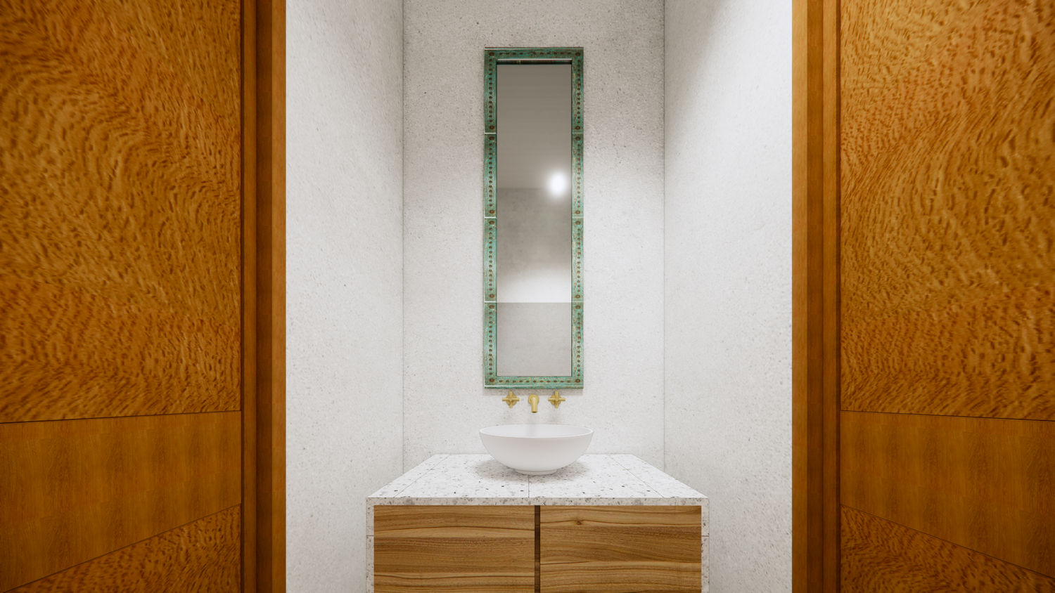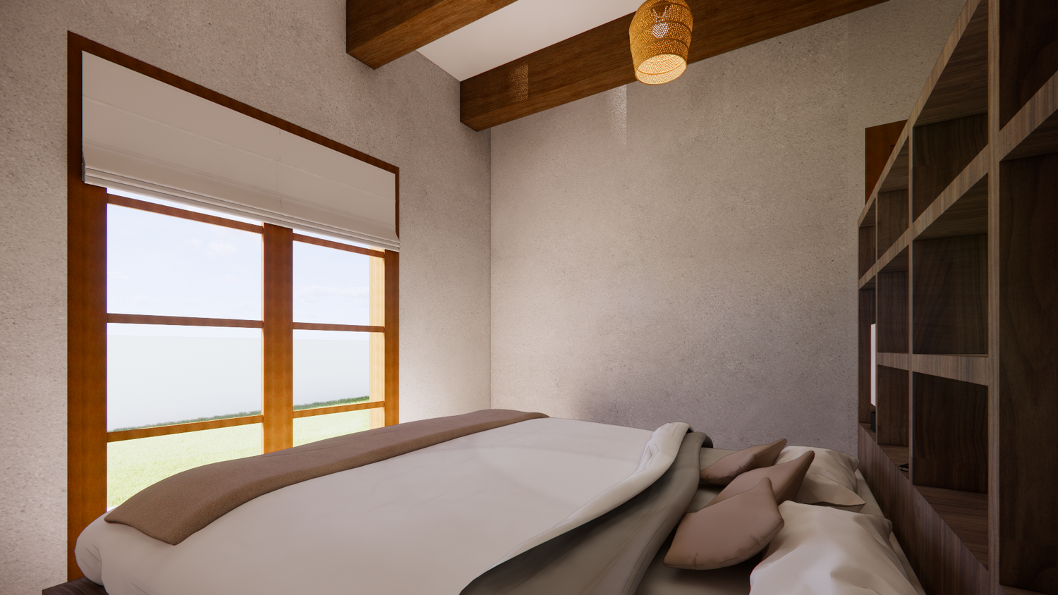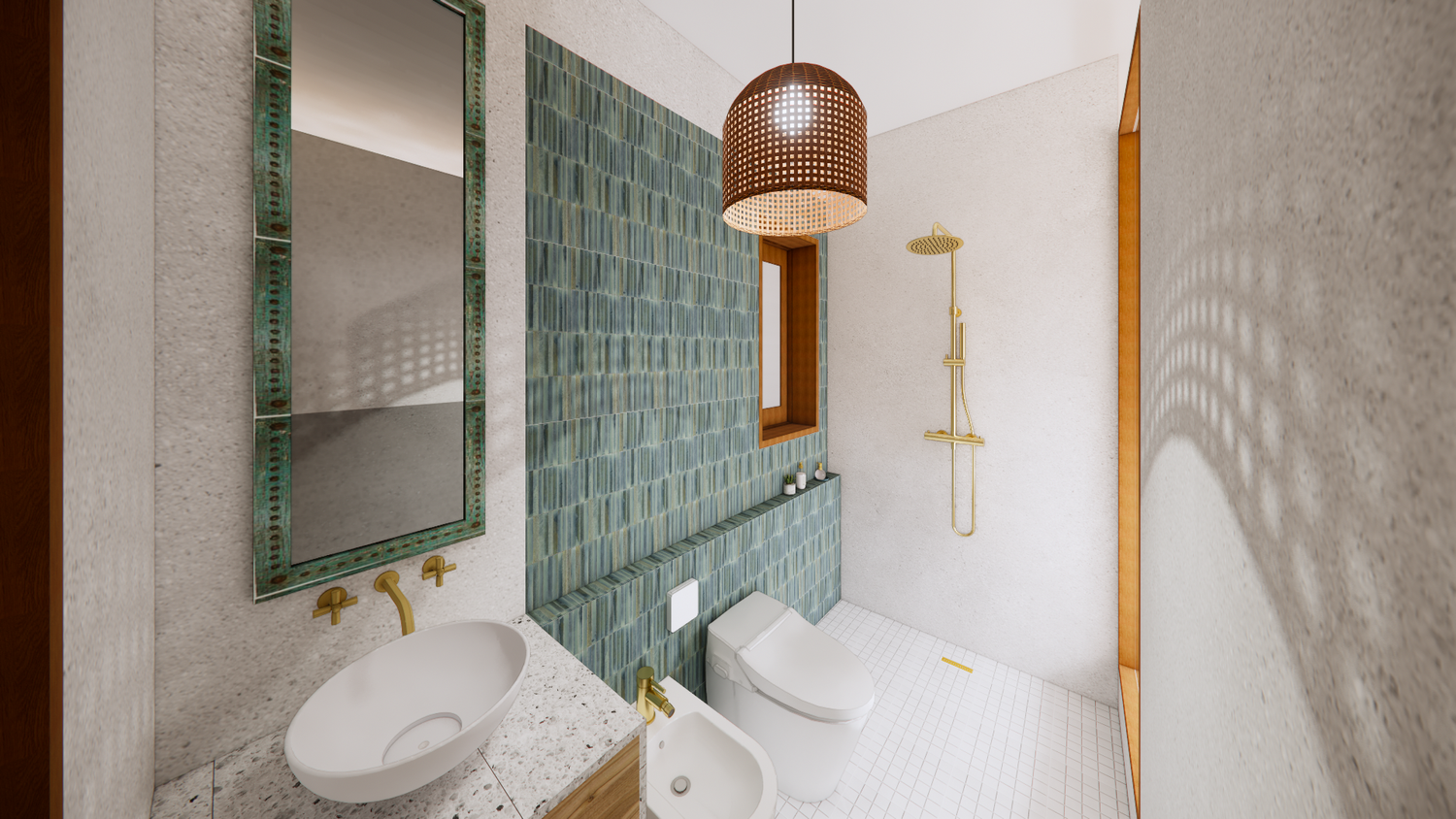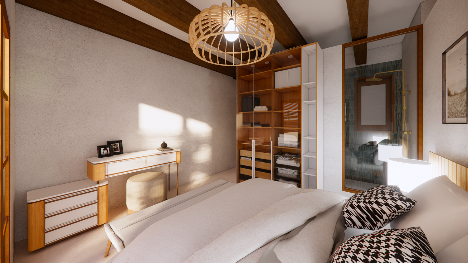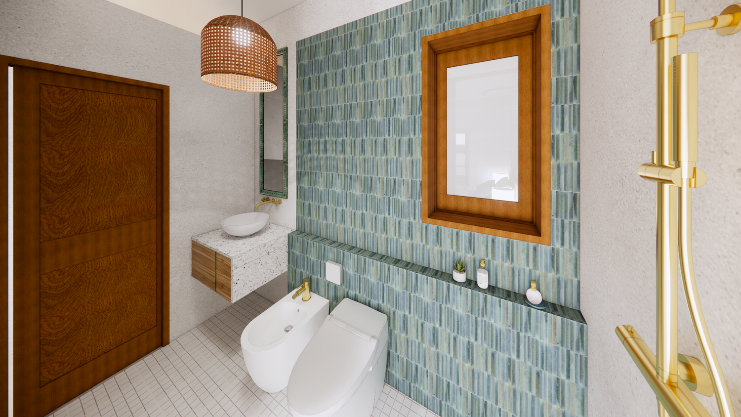 House With combination of Mediterranean Style with Boho Beach Influence. The style we implement through the interior and exterior, from the main door entrance we made the door with arc, a common practice in Mediterranean style house made of timber with combination of glass panel to invite natural lighting into the kitchen. Through the main door we will meet the open layout dining-living room and kitchen with Mediterranean with boho beach influence interior ambience depicted from the finishes, furniture, and decoration.