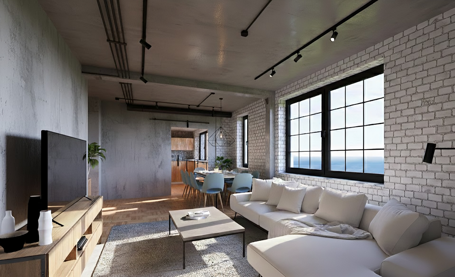 A wine cellar is integrated into the kitchen area and is separated from the living room by a sliding glass door, maintaining visual continuity while allowing functional separation when needed.
