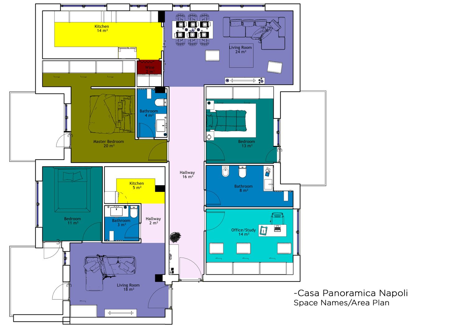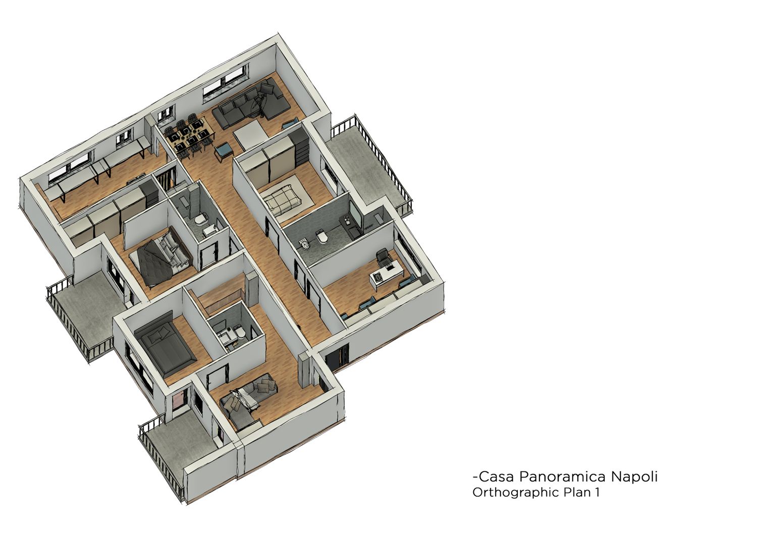 The family apartment was organized so that the bedrooms and the shared bathroom are located at the entrance, along a wide corridor that clearly defines the private zone. The kitchen and living area were placed on the northern side to maximize the sea view. Additionally, both bedrooms have direct access to a balcony.