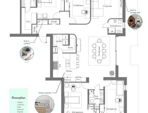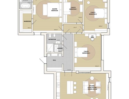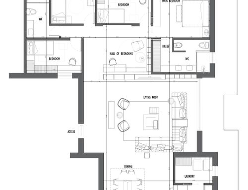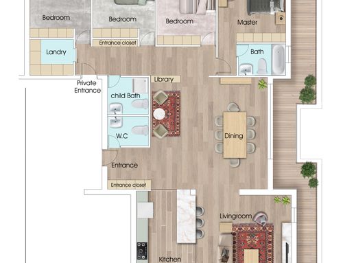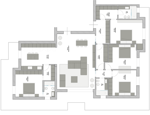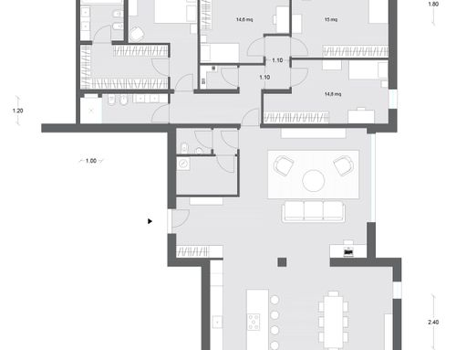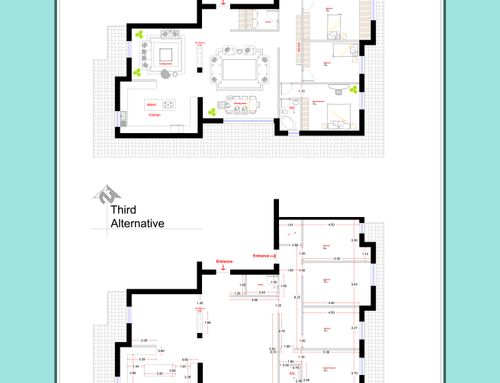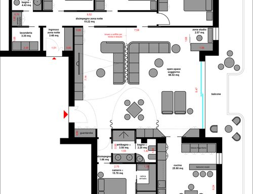 we will need three bedrooms (roughly 15m2 each) for the children; one master bedroom with ensuite bathroom, one small bathroom, one laundry; living room and open space kitchen that should be on the SW side of the apartment; from the map you will see that there’s a small balcony all around the apartment; please consider that this floor was used as an office, so we’re more than happy of taking down all the internal walls; i’ve marked with W.C. where the upper floor correspondent pipes are.