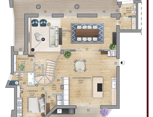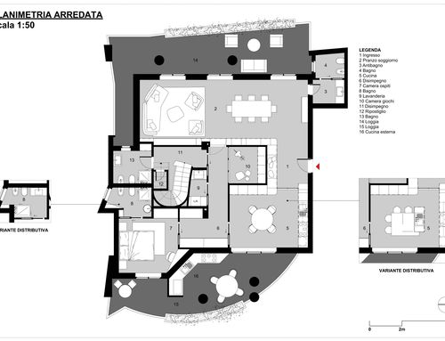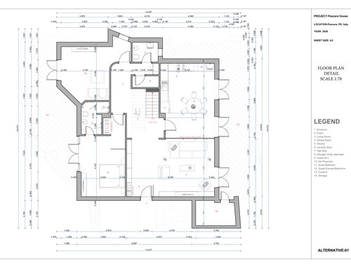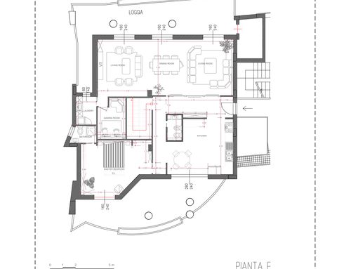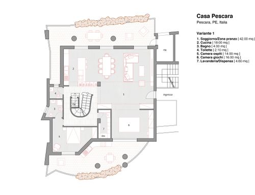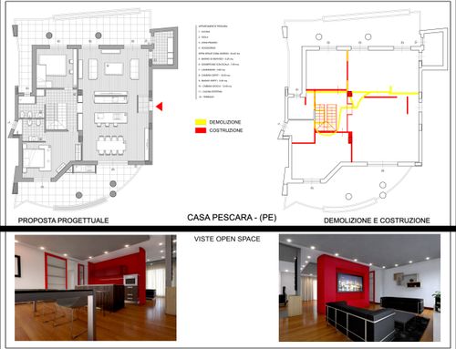 il lato dove ora è situata la cucina e il tinello è sul mare quindi vorrei che ci fosse la sala da pranzo e il salone. nell'altra parte della casa avrei bisogno di inserire: