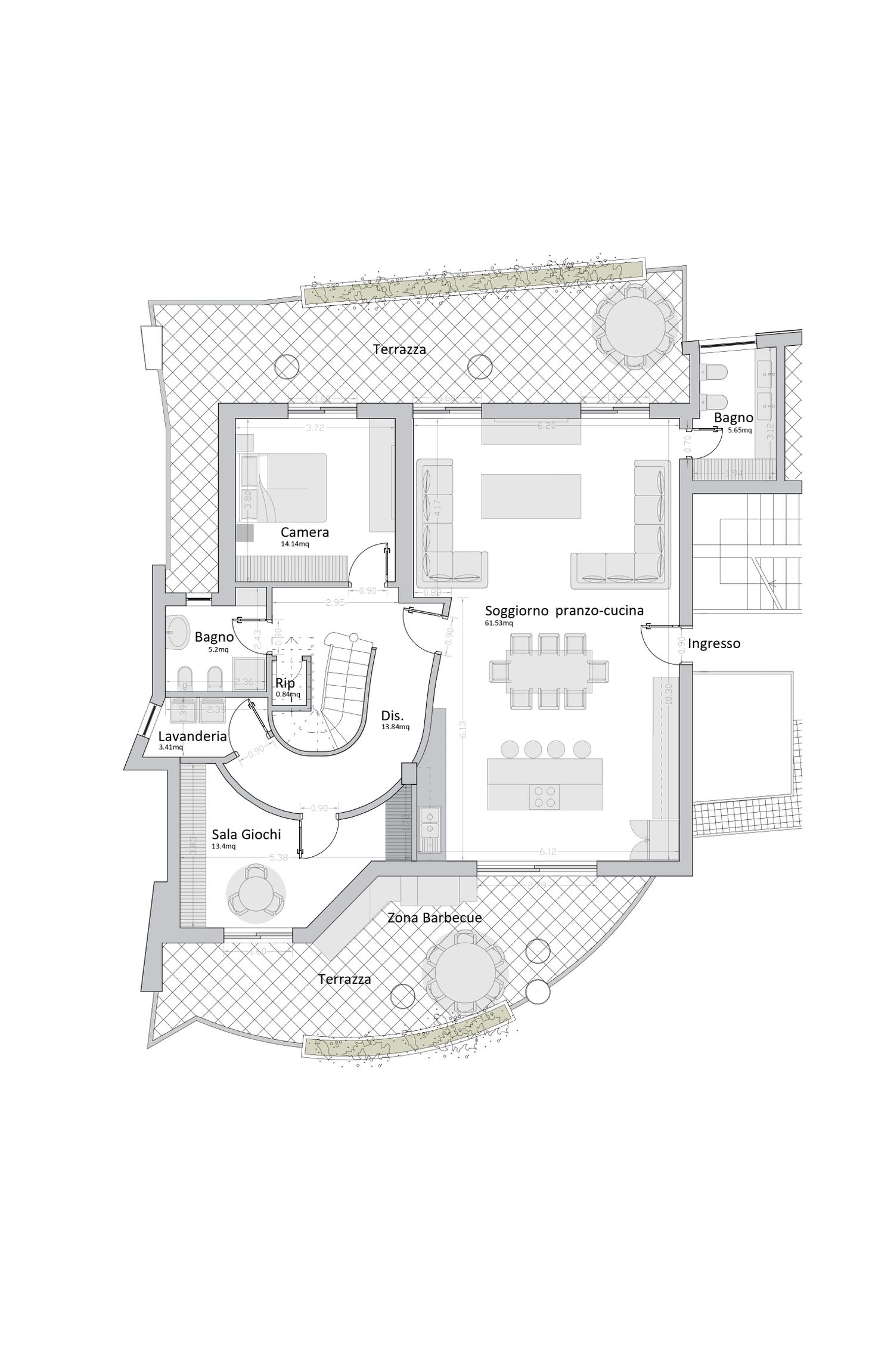 Negli spazi privati, manteniamo le scale nella loro posizione attuale e creiamo un corridoio che consente di collegare la camera degli ospiti, con accesso al bagno completo esistente, la stanza destinata al deposito dei giocattoli e uno spazio lavanderia alla fine del corridoio. In questo modo si garantisce un funzionamento ottimale nella separazione tra spazi privati e spazi sociali.