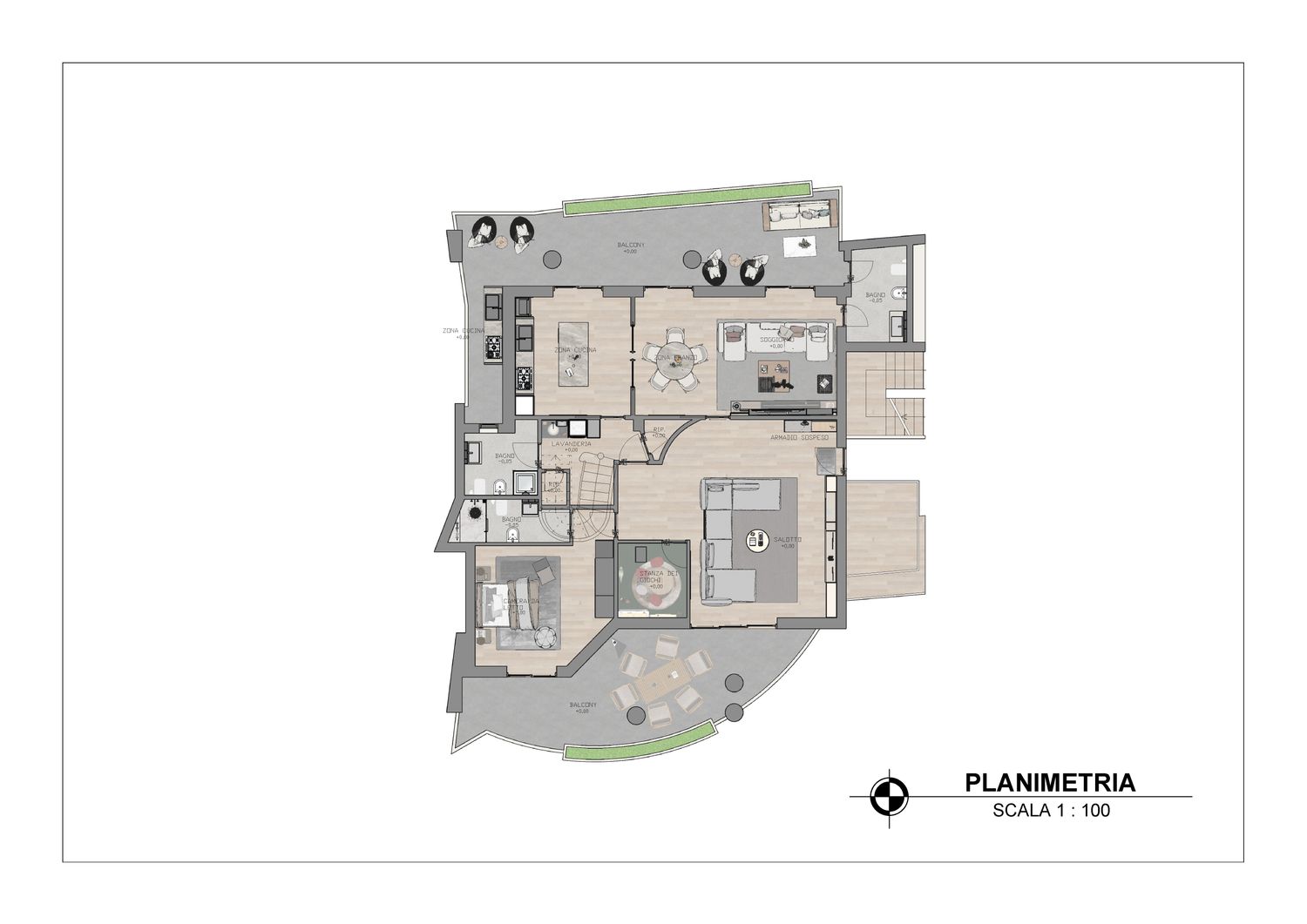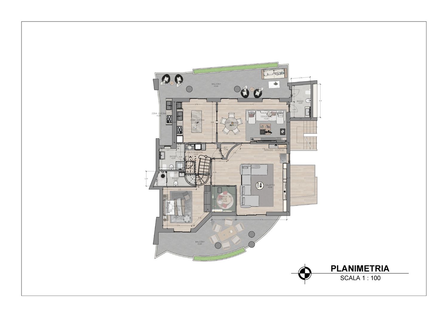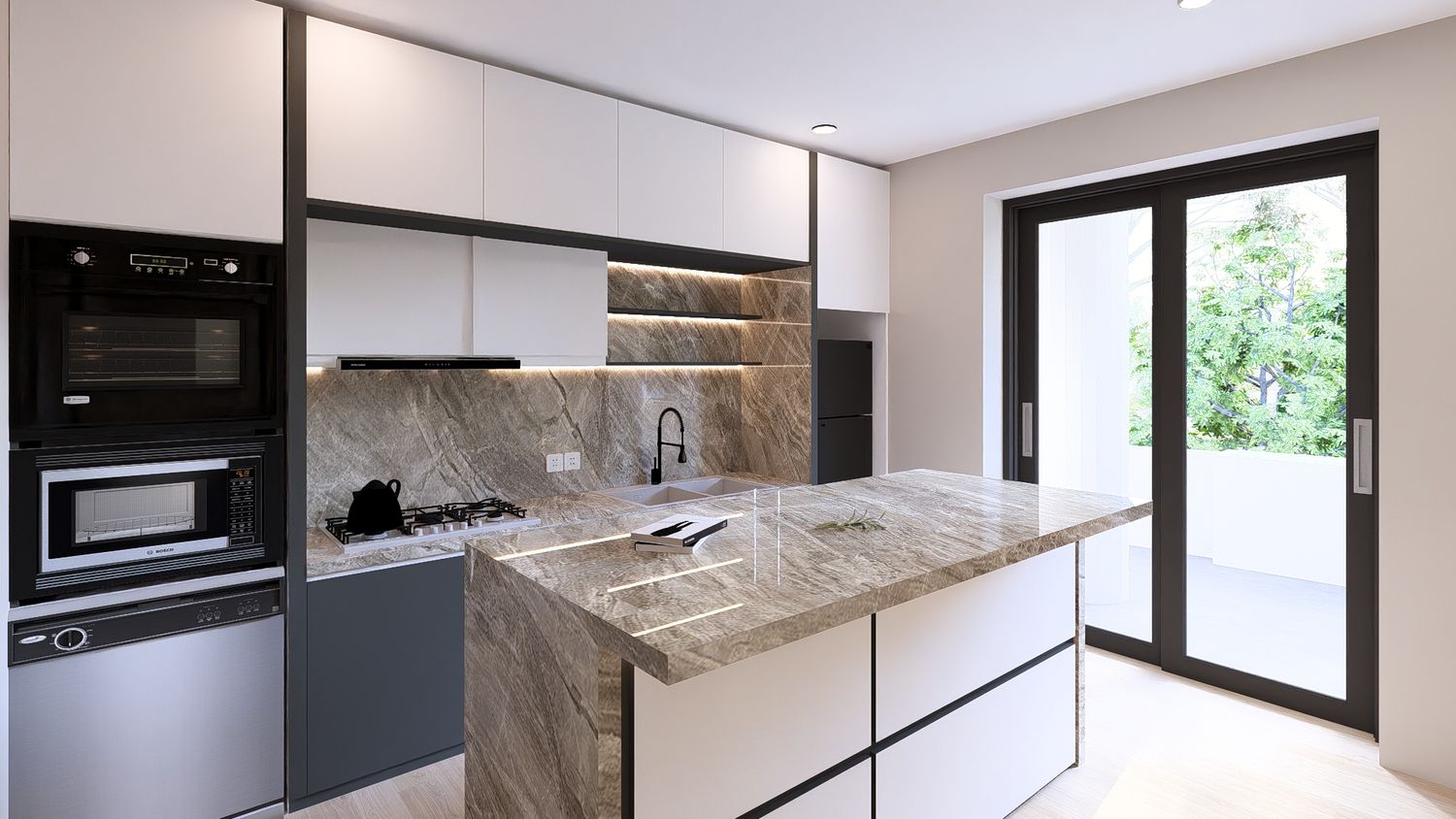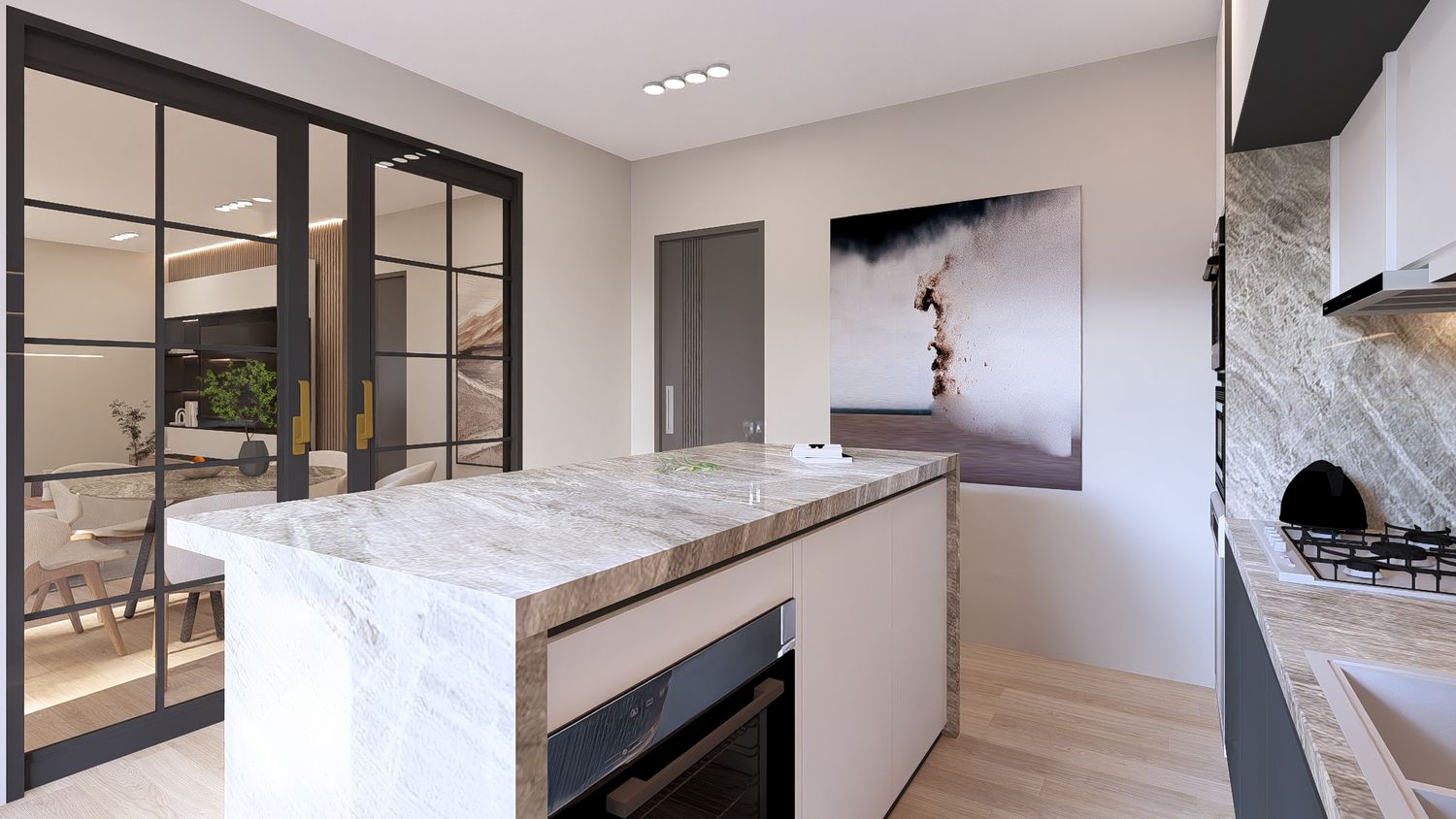 La nuova cucina è stata spostata in una posizione più funzionale e organizzata, progettata come ambiente chiuso con pareti vetrate, dotata di isola centrale e collegata direttamente alla cucina esterna sul balcone, come da sua richiesta. Il tavolo rotondo da Ø120 cm è stato integrato come area colazione indipendente dall’isola.