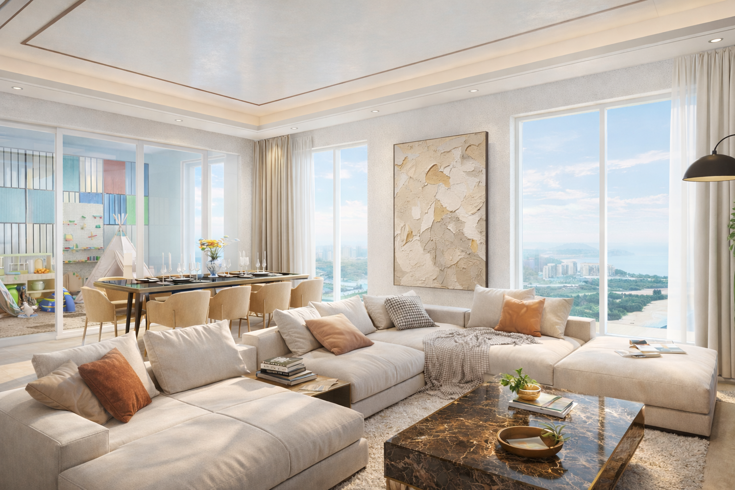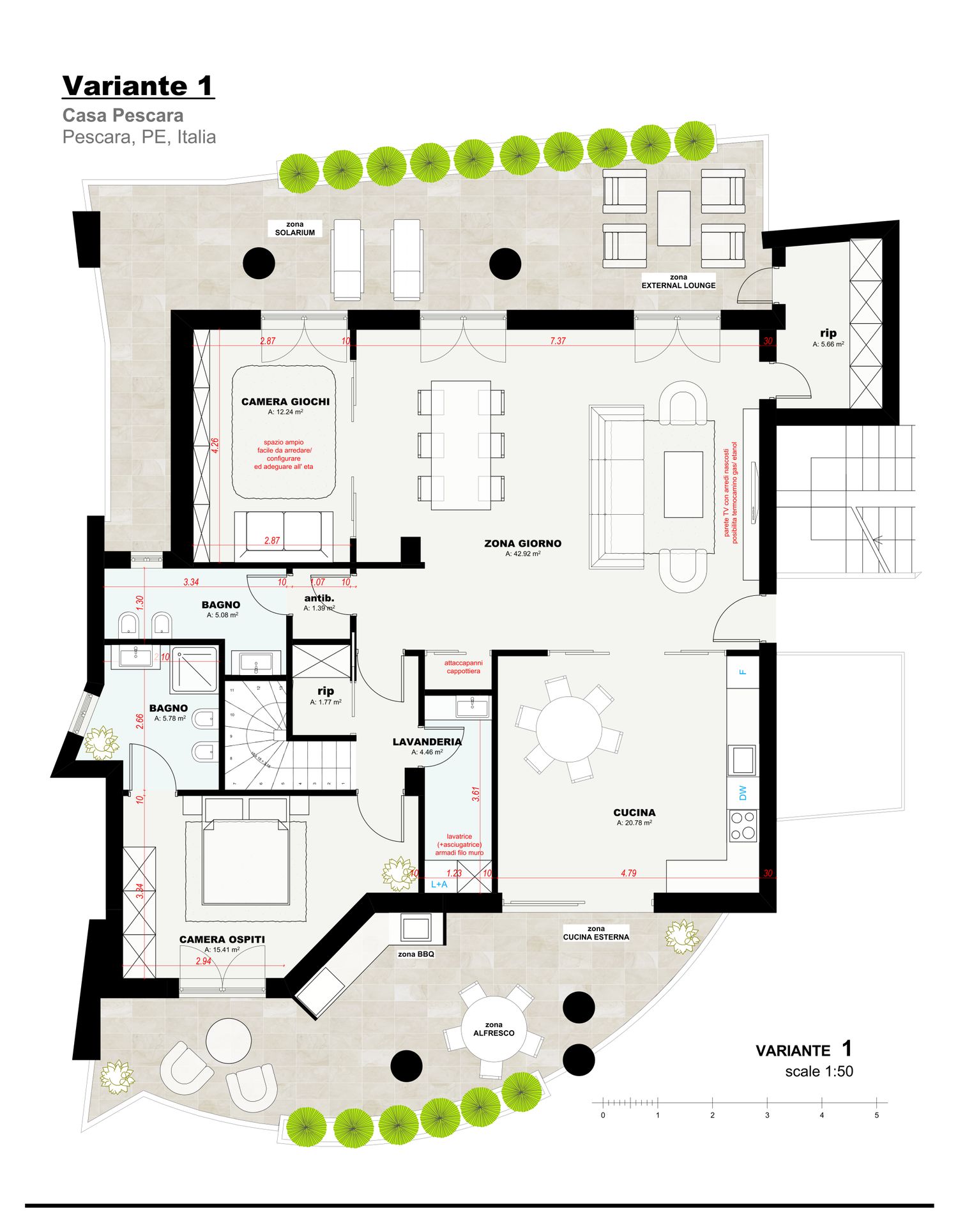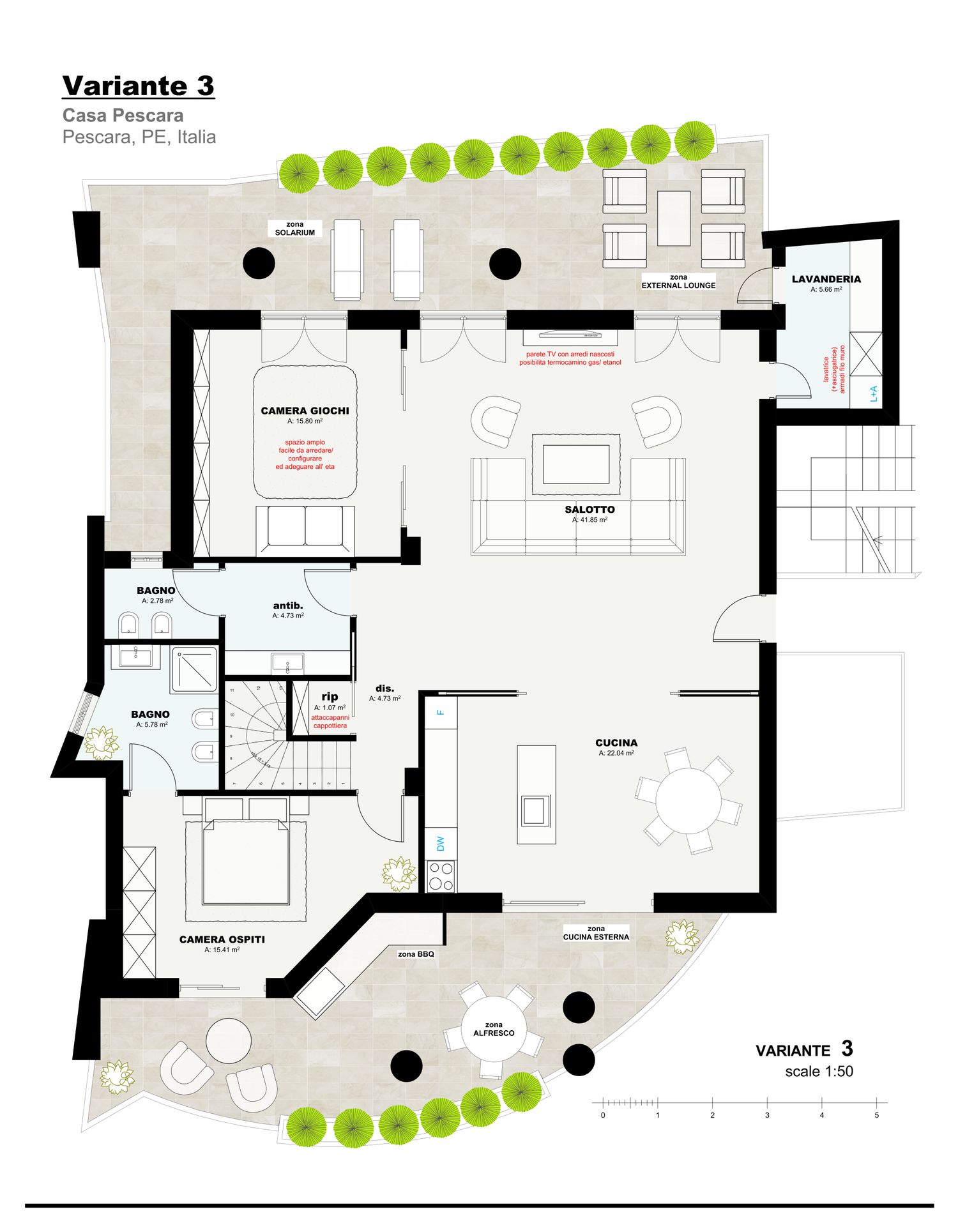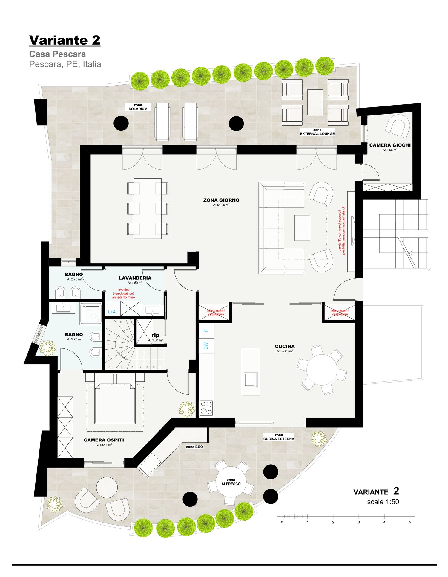 Questa variante risponde in modo diretto al brief, collocando la zona living e pranzo sul fronte con vista mare e valorizzando il rapporto con la terrazza e la luce naturale. La cucina è ampia e separabile tramite vetrate, dotata di isola centrale e collegata direttamente alla cucina esterna. La zona servizi è compatta e ben organizzata, mentre la camera giochi è facilmente accessibile ma separata dalla zona giorno.