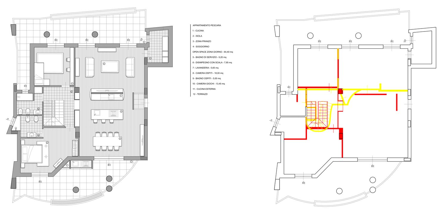 Dalla porta d’ingresso, un piccolo disimpegno realizzato con una parete erbosa, serve per schermare quanto ci aspetta nell’immobile. Un grande open space con al centro una parete attrezzata che divide i due ambienti ma collegati tra loro, la zona pranzo cucina e la zona giorno con affaccio sul mare, dove da un lato si nasconde la cucina con isola e dall’altro la televisione.