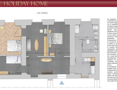 As regard the style, I’d like a modern furniture that highlights the brightness of the apartment and that refers to the city of Rome (maybe with a paintings or other decoration). For what I know, there are multiple possibilities when it comes to modern furniture, e.g. industrial, contemporary, modern classic etc. Since I don’t have any preference, I will leave you free to choose the style that you think would be more appropriate for the apartment.