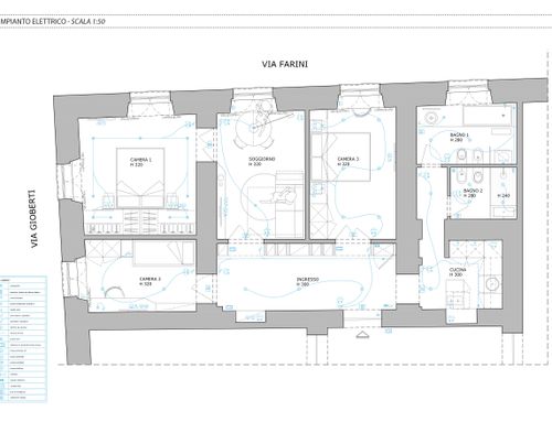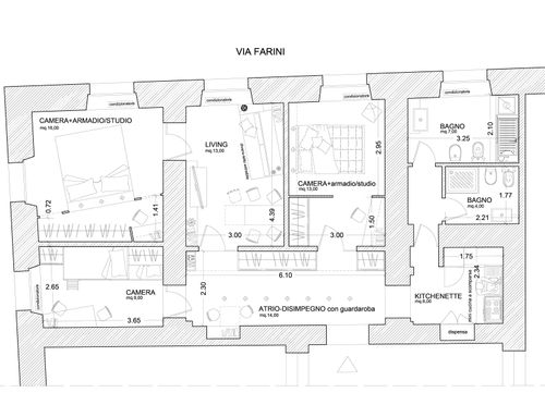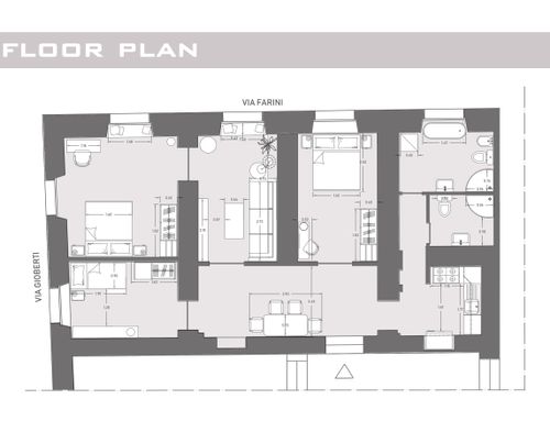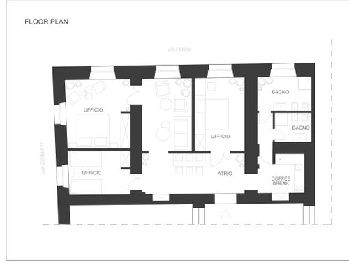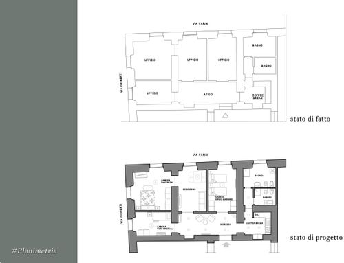 This apartment has been used as an office during the past years. Now we are transforming it from an office to an apartment (from an A/10 to an A/2 for the Italian real estate registry). For this reason, the current disposition of the rooms that you can see in the photos is different from the “post-operam” plan that I attached. This last plan is the one that the local city hall approved according to our regulation, therefore it is not possible to do structural changes from the disposition you can see in the plan. Instead, inside each bathroom, is possible to change the position of fixture (shower, toilet, sink...). Besides, the living area should necessarily be the second room to the left that faces Via Farini.