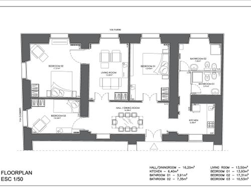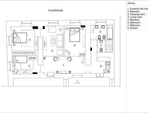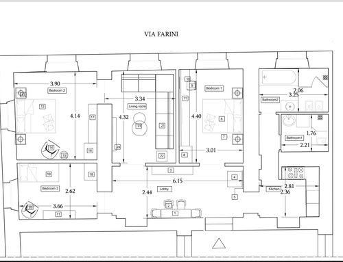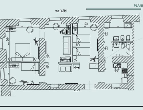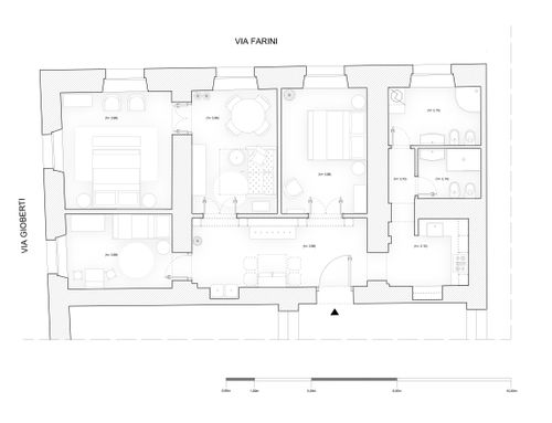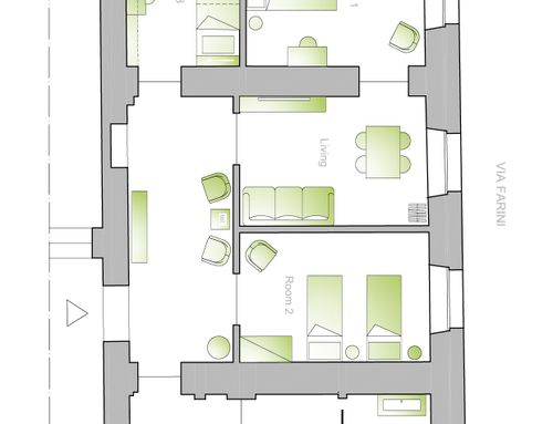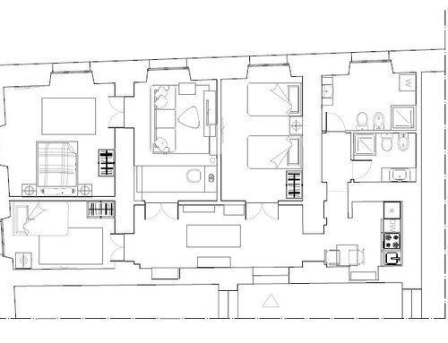 The apartment must have 3 bedrooms and 1 living room with a sofa bed. Globally, I want to be able to host 8 persons: 6 in the 3 bedrooms (2 persons for each room) and 2 in the living room. Furthermore, only the little room on left (the one with view only on Via Gioberti) must have a bunk bed.