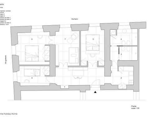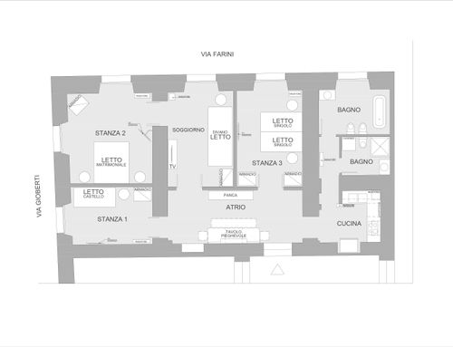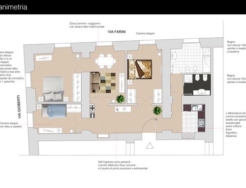 L'appartamento deve avere 3 stanze da letto e 1 soggiorno con divano letto. In totale, la casa vacanze deve essere predisposta per ricevere al massimo 8 persone: 6 nelle 3 stanze da letto (due ciascuno) e 2 nel soggiorno. Solo la stanza entrando a sinistra con affaccio solo su via Gioberti, deve contenere obbligatoriamente un letto a castello.