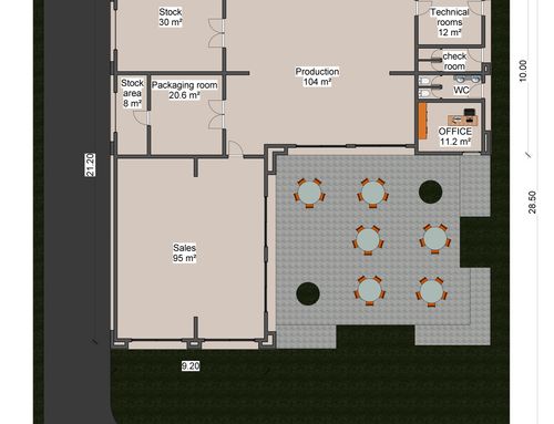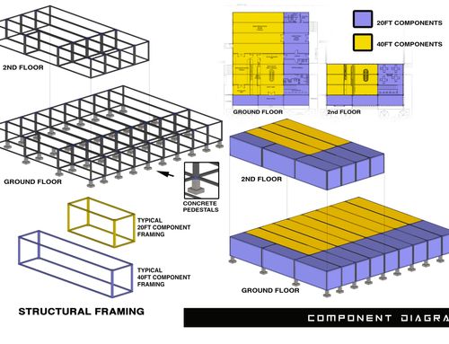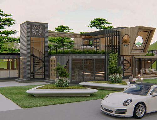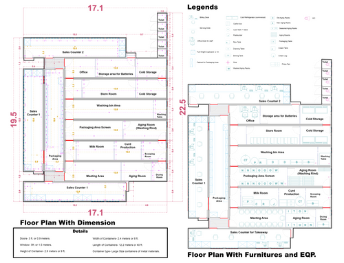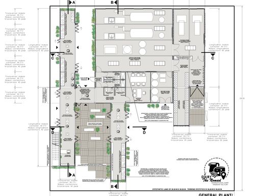 We need a construction of a mini dairy on container, transportable, modular and modular, where storage, production and sales spaces must be provided, a modern and innovative concept, where dairy production on sight is combined with the direct sale of the product to the final consumer, completely passive structure, using renewable energy and storage batteries, welcoming outdoor spaces to stop and consume products, with spaces suitable for children, green spaces to use the clarified water of the processing, the idea is to bring the productions as close as possible to the consumer, in large modern cities, but also in countries where there are still no such types of production, or even close to peoples in emergency. The production containers must be very bright to take advantage of natural light, the washable and plastic-coated walls for food use, we would already like to certify the structure as suitable for American fda regulations, stock size 40 meters, production size 120 meters, technical and service rooms 20 meters, packaging room 30 meters and sales 100 meters, offices 20 meters. Attention this is a prototype and itinerant concept, CURRENTLY THERE IS NO LOT OF LAND ON WHICH TO BUILD, the space will be given to use by the cities that will host the project of this temporary store, the plot of land where the entire structure will be positioned will be of about 800 meters (square-shaped area of about 28x28), space occupied by containers about 330 meters, 470 meters of green outdoor area for refreshment and relaxation. The name to be indicated above the structure is also required, which will become the brand of these mini An excellent qualitative detail and image on the sales space is required, with wood and elements that recall the production, there must be a sales counter for the products made.