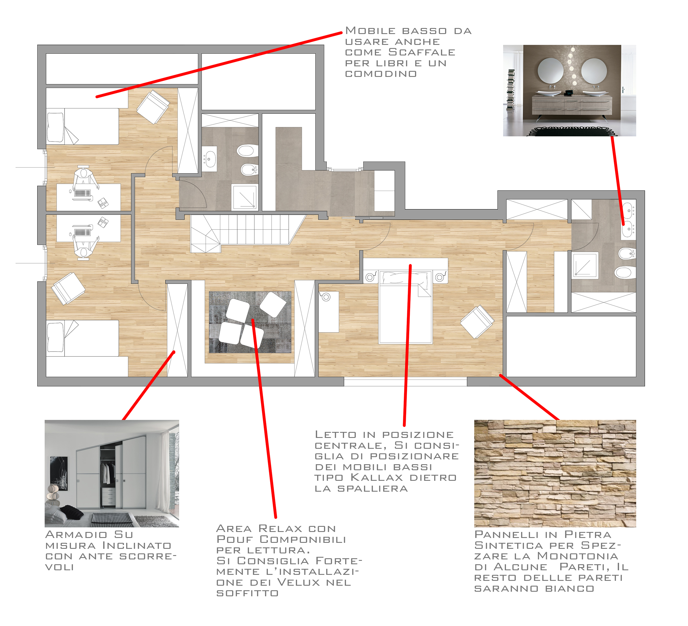 Buongiorno, l'appartamento a cui mi riferisco è nuovo in costruzione. E' composto da due piani: primo (zona giorno) e attico (zona notte). Il primo piano sarà esclusivamente zona giorno con cucina aperta sul salotto (al posto del bagno presente in pianta). Vorrei che mi deste soluzioni riguardo la zona notte che, per le diverse altezze del soffitto, mi crea un po' di perplessità; vorrei che venissero sfruttate al meglio le parti basse.