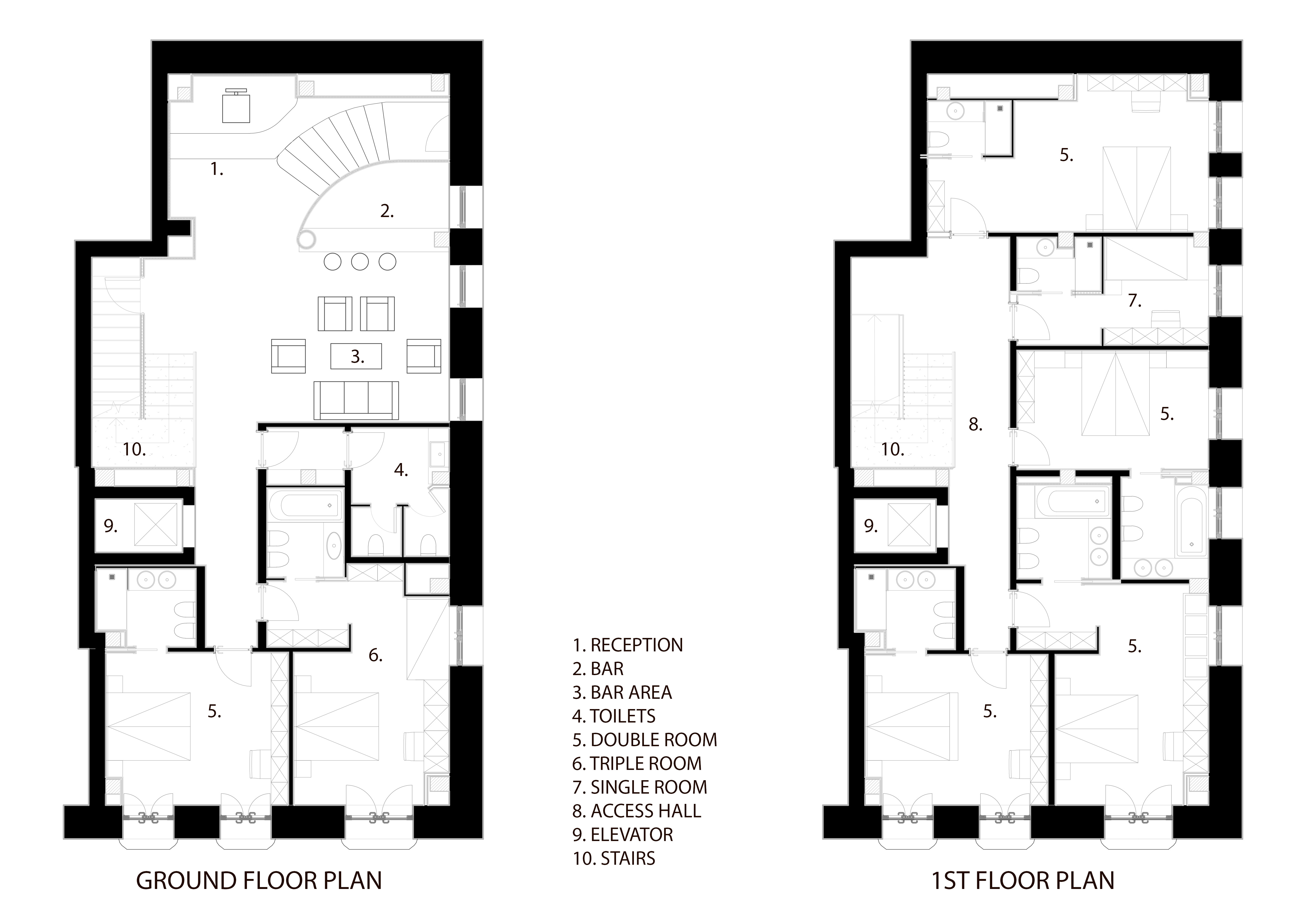 I already renovated a stable and therefore there are no constraints. Obviously, at present, it is not expected to increase the cubic volumes. The elevator is already serving the three floors of the hotel. Will suppress the access of the elevator on the ground floor, which will be a restaurant with its own entrance that differs from the hotel's. How many rooms will have to be made in the hotel? The number of rooms, as reflected by plants, is 8, plus two under the roof, to devote to the guest. They have a minimum height of 1.80 and are thus not accessible. I wish there were more room, but it is difficult to do so with the layout of the windows. Are the rooms doubles or singles? Are they for families? How many triple rooms will there be? How many quadruples? We must work towards a high-quality standard to create superior doubles of 16 square meters and if possible, small suites 19 square meters and larger. We can also assume that there will be a large sofa bed, maybe obtaining a separate space from the main bedroom, so that you can get the triple if necessary. The small double and small single still remain. The quality of these will need to be increased. The designs of the furniture are only suggestions.