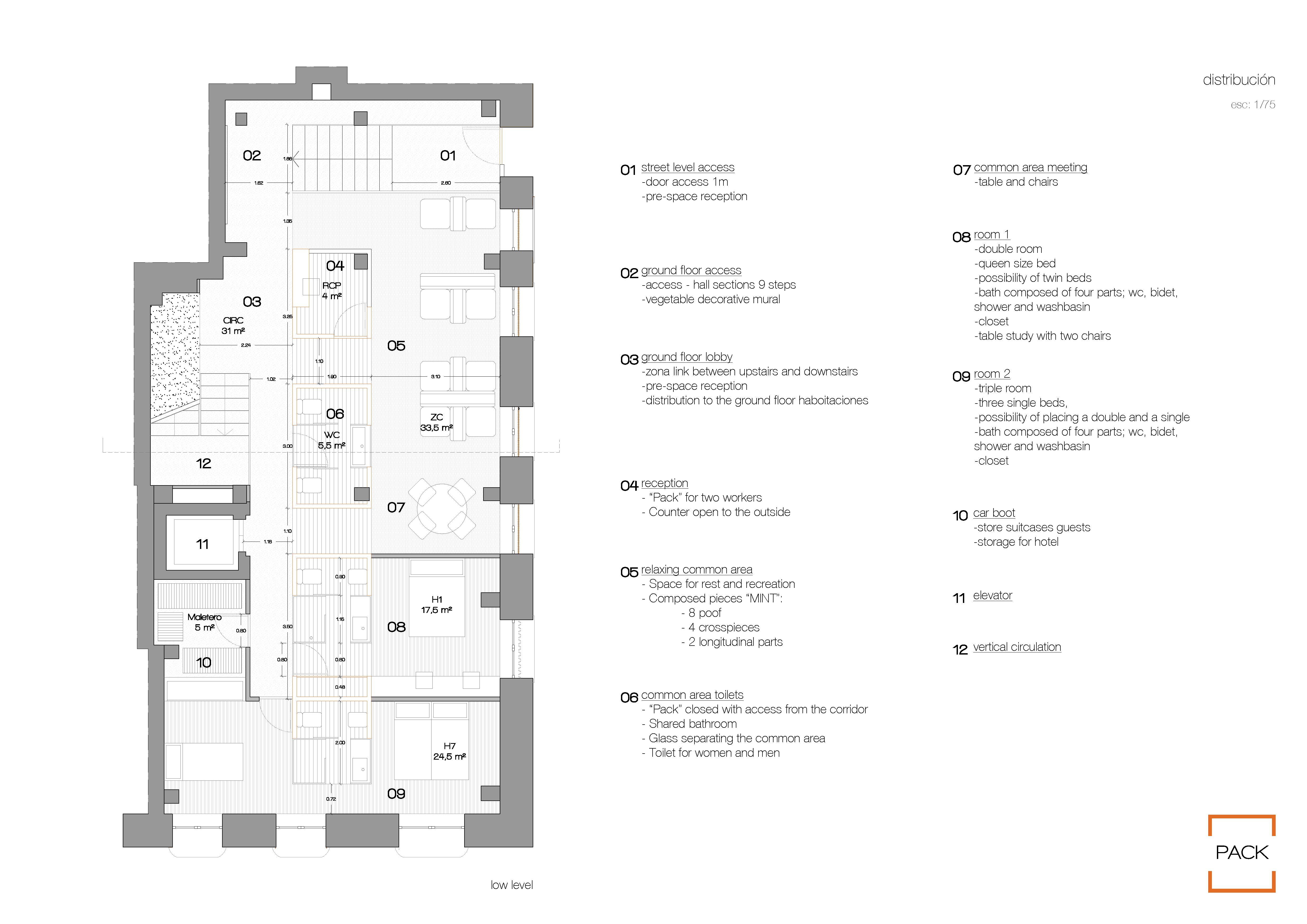 Tale spazio, essendo il luogo di prima accoglienza, necessita secondo noi di particolare attenzione. Gli arredi indicati sono puramente indicativi. In ogni caso l'area relax e bar è prevista nello spazio lato scala. Tale spazio (con relativa scala) può essere anche ridisegnato.