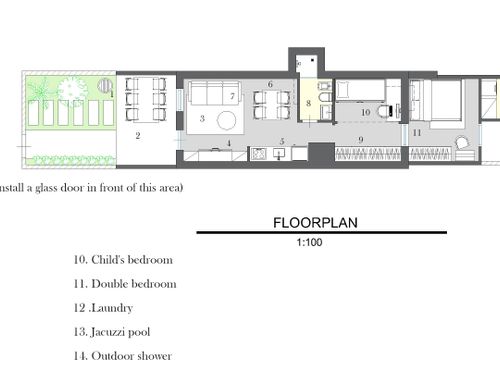 Home entrance that leads into the living room / kitchen (double bed to be placed retractable?) And the remaining room will be used for other beds
