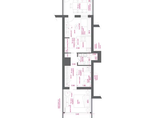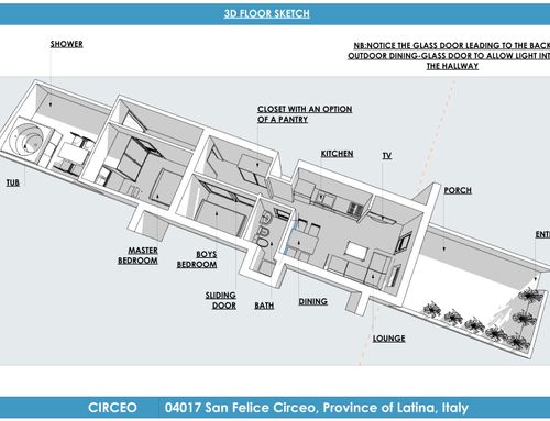 Ingresso abitazione che accede nel soggiorno/cucina (letto matrimoniale da collocare a scomparsa ?) e la camera rimanente sarà destinata agli altri posti letto