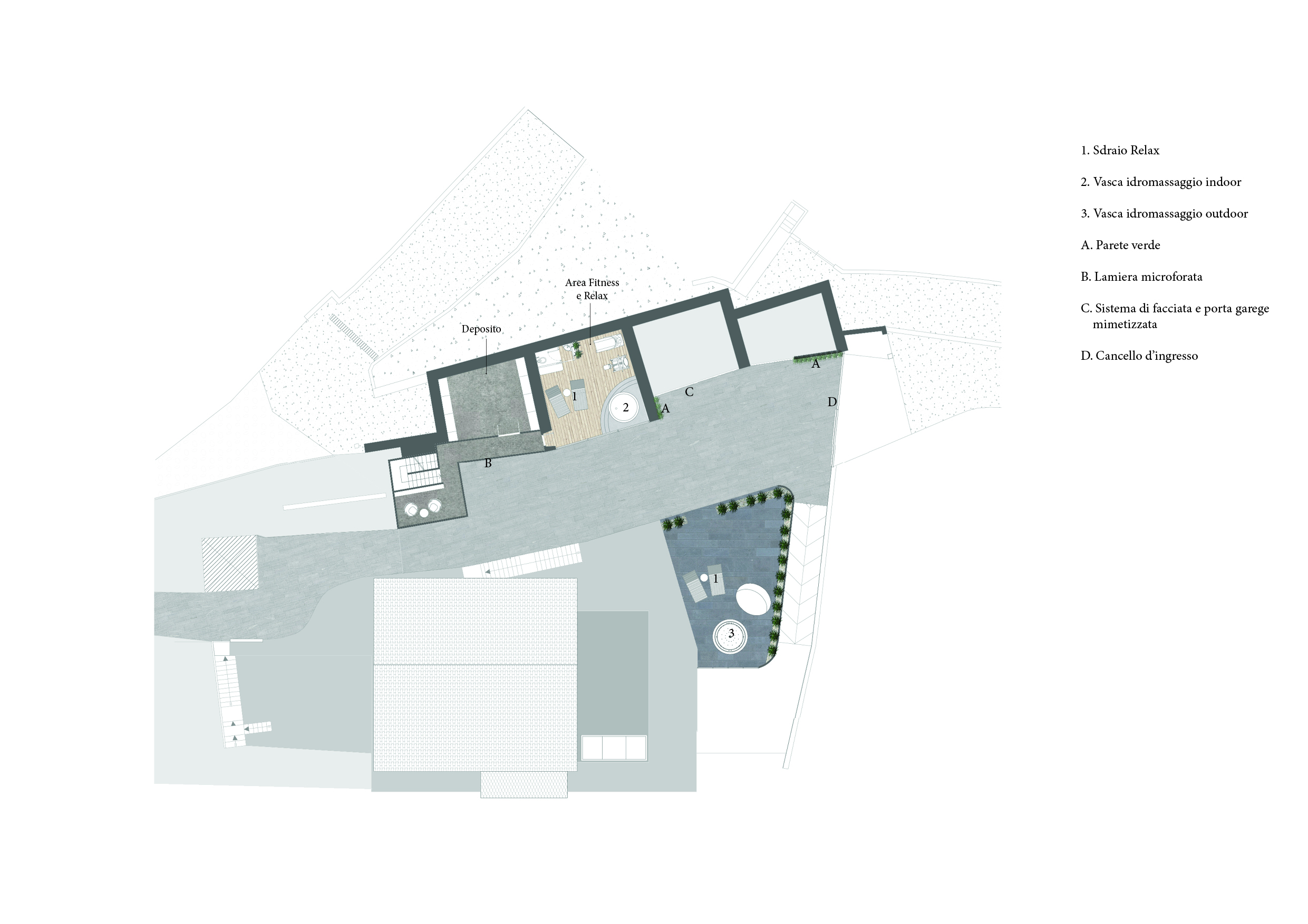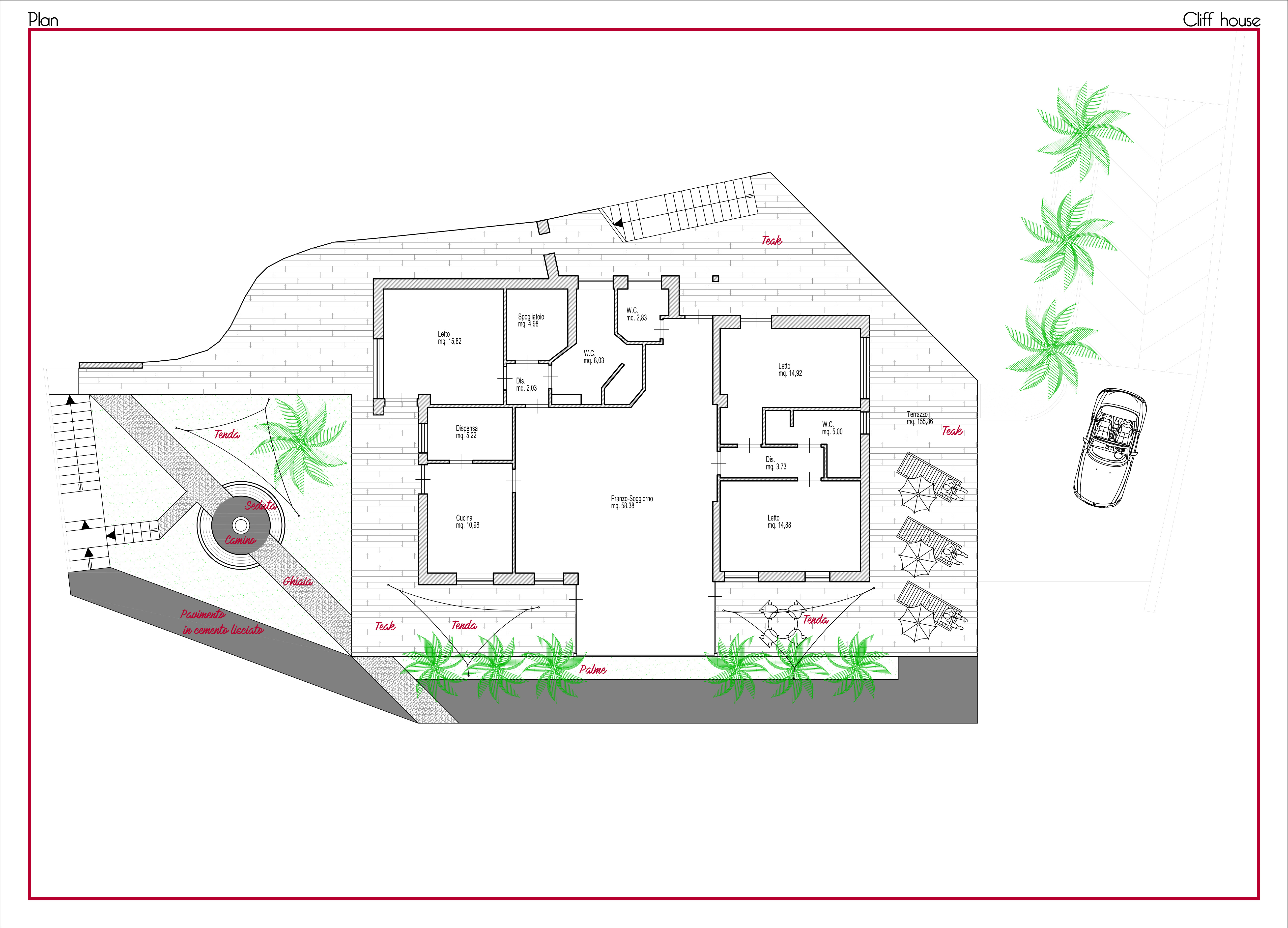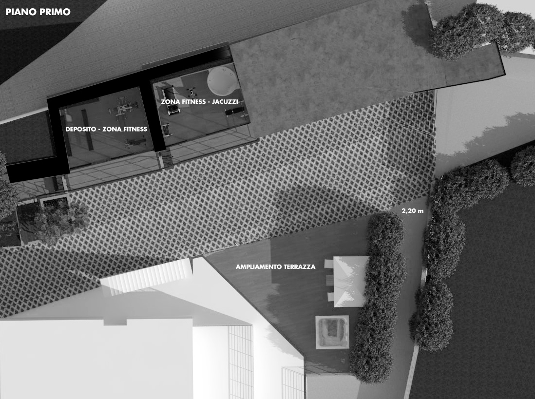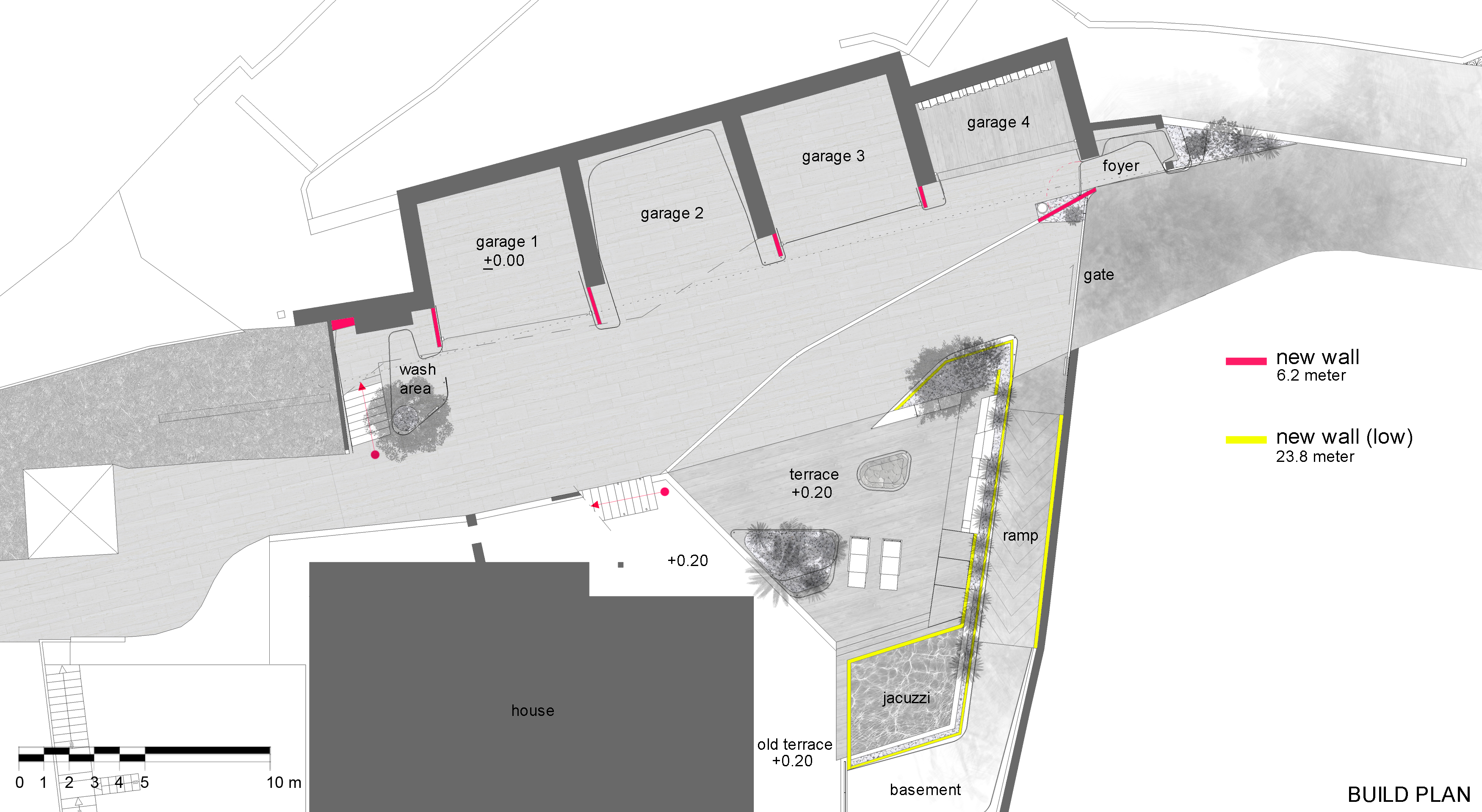 The court could be resized in order to have more space as terrace and to allow cars drive in and out. Floor has to support car passage and dust.