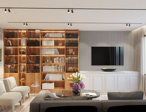 Nell’area del disimpegno notte, verrà alloggiato il motore dell’aria condizionata canalizzata. Questo comporterà un abbassamento del controsoffitto nell’area del disimpegno e/o del ripostiglio. Da qui il canalizzato potrà raggiungere agevolmente il living room e le due camere da letto. Rimane invece più complicato portare il canalizzato nella camera studio e nella cucina. Sarebbe utile progettare un’idea di cartongesso che risolva questo tema.