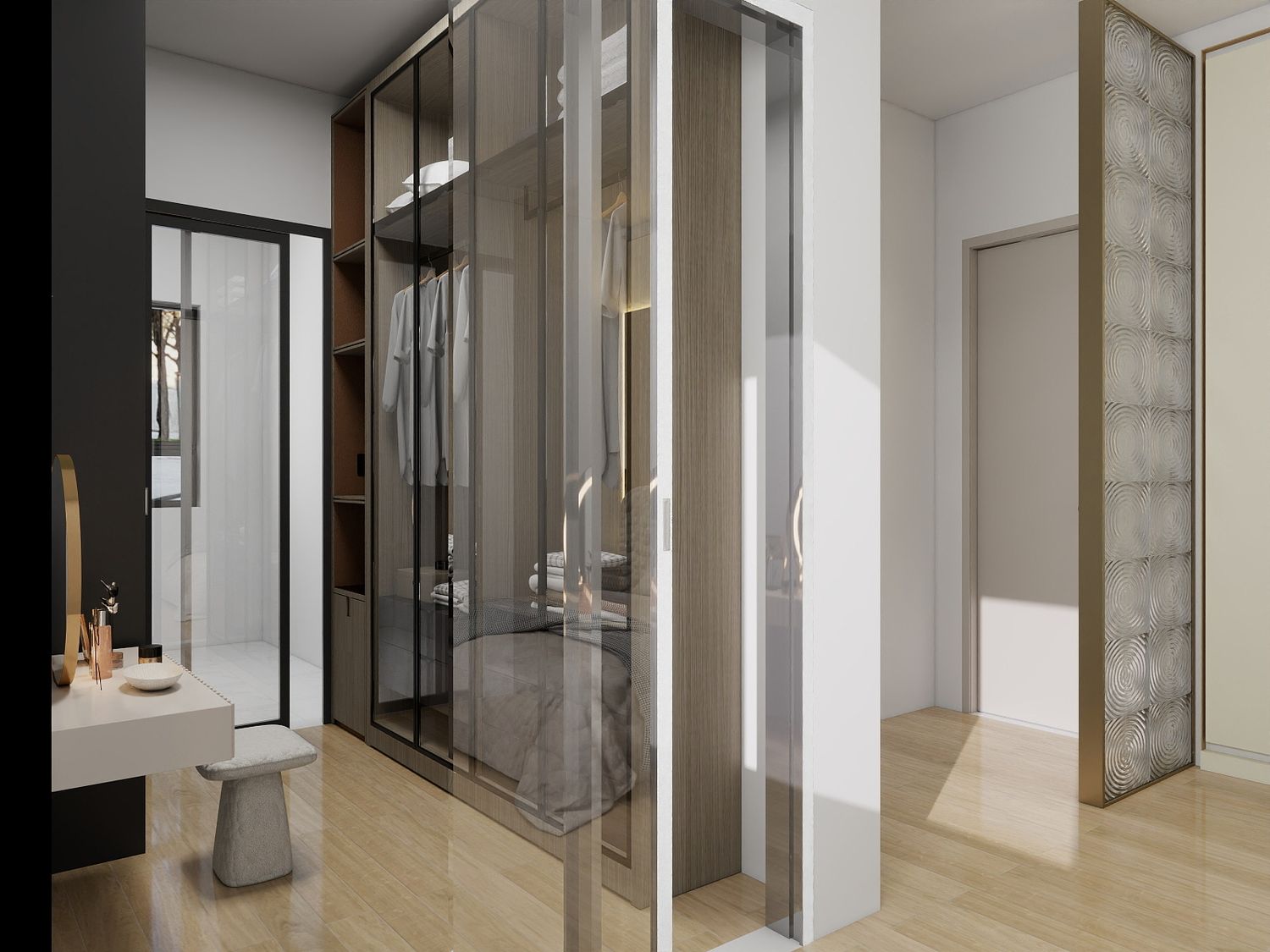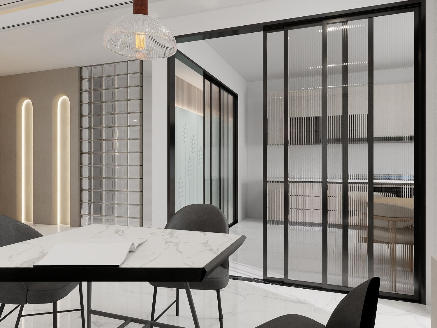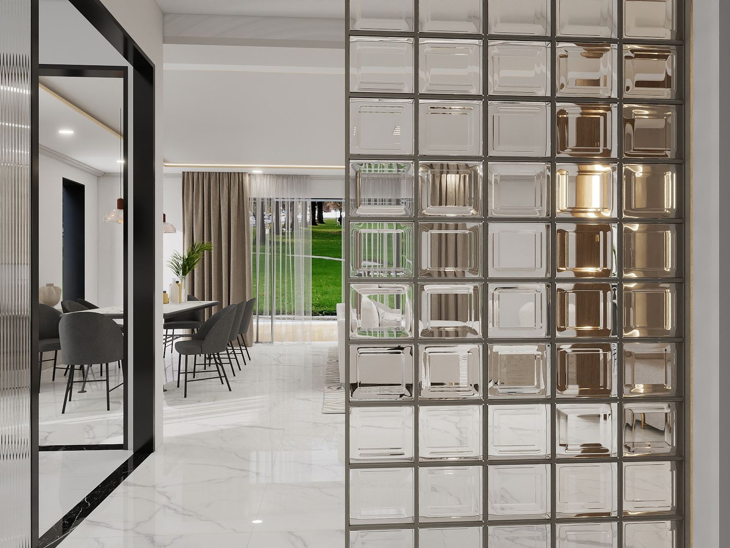 abbiamo anche spostato le scale accanto all'ingresso e aggiunto una parte in vetro e un mobile contenitore divisorio per cappotti e scarpe per separare il soggiorno
